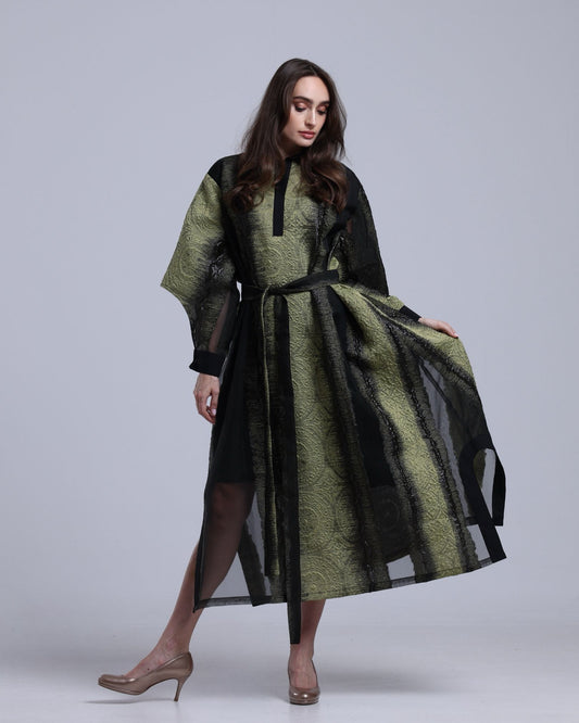 LA REINE - Black & Olive Embossed Organza Midi Dress