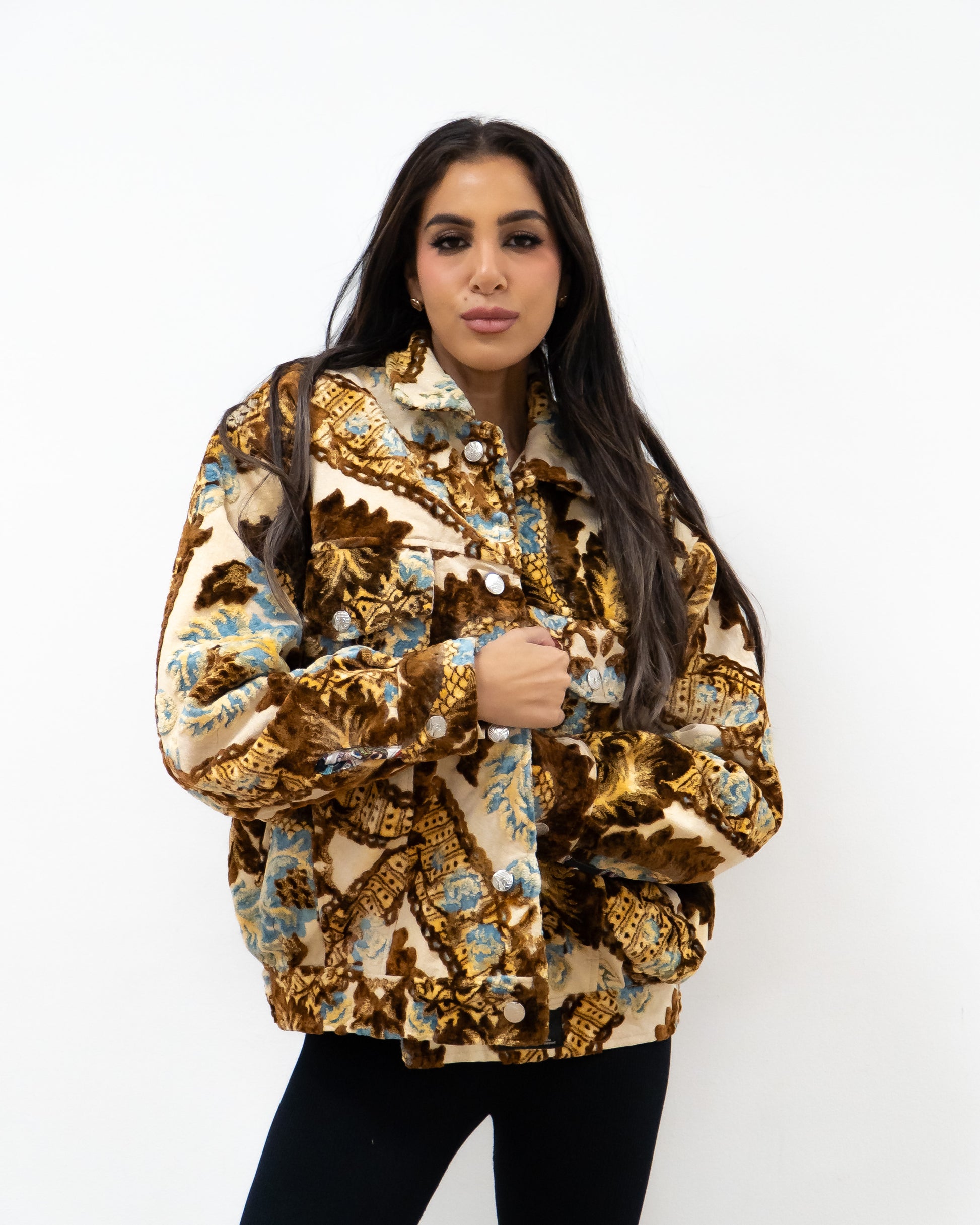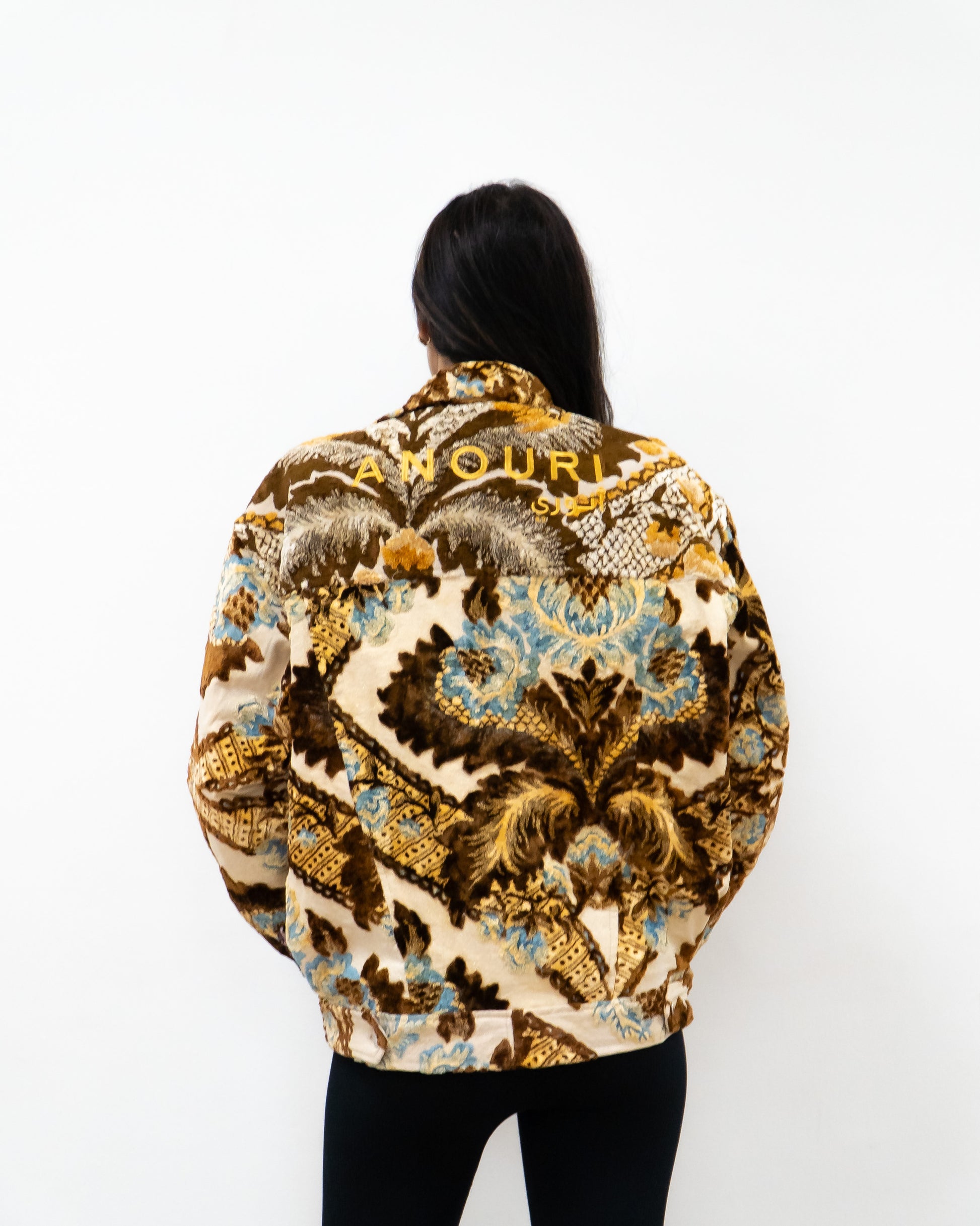 سترة سجاد كبيرة الحجم باللون البني والذهبي.