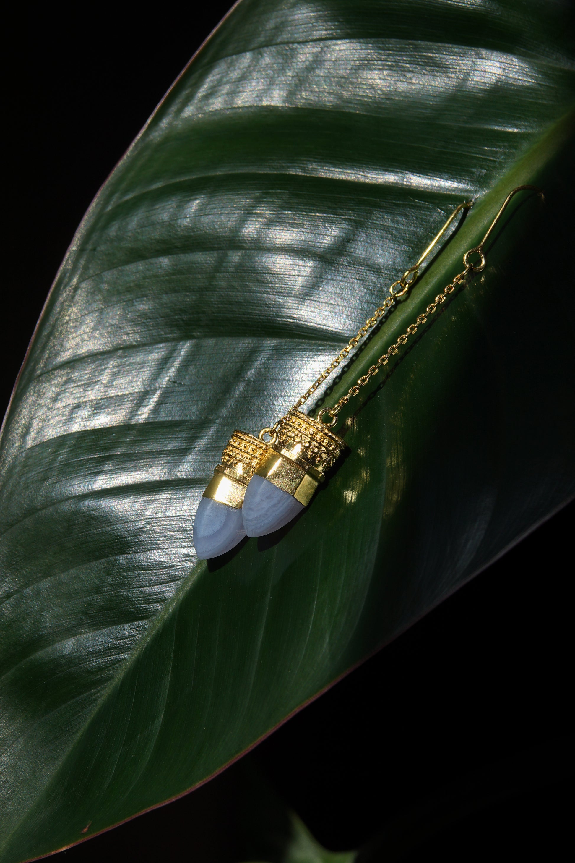These gold-plated silver earrings, set with custom-cut Blue Lace Agate, carry both these forms in harmony. Blue Lace Agate, a stone of expression and peace, brings a gentle clarity and calm, easing the voice into truth. It soothes while it strengthens. Together, they honour resistance as a quiet, intentional act: of remembering, of staying rooted, of redefining ourselves on our own terms.