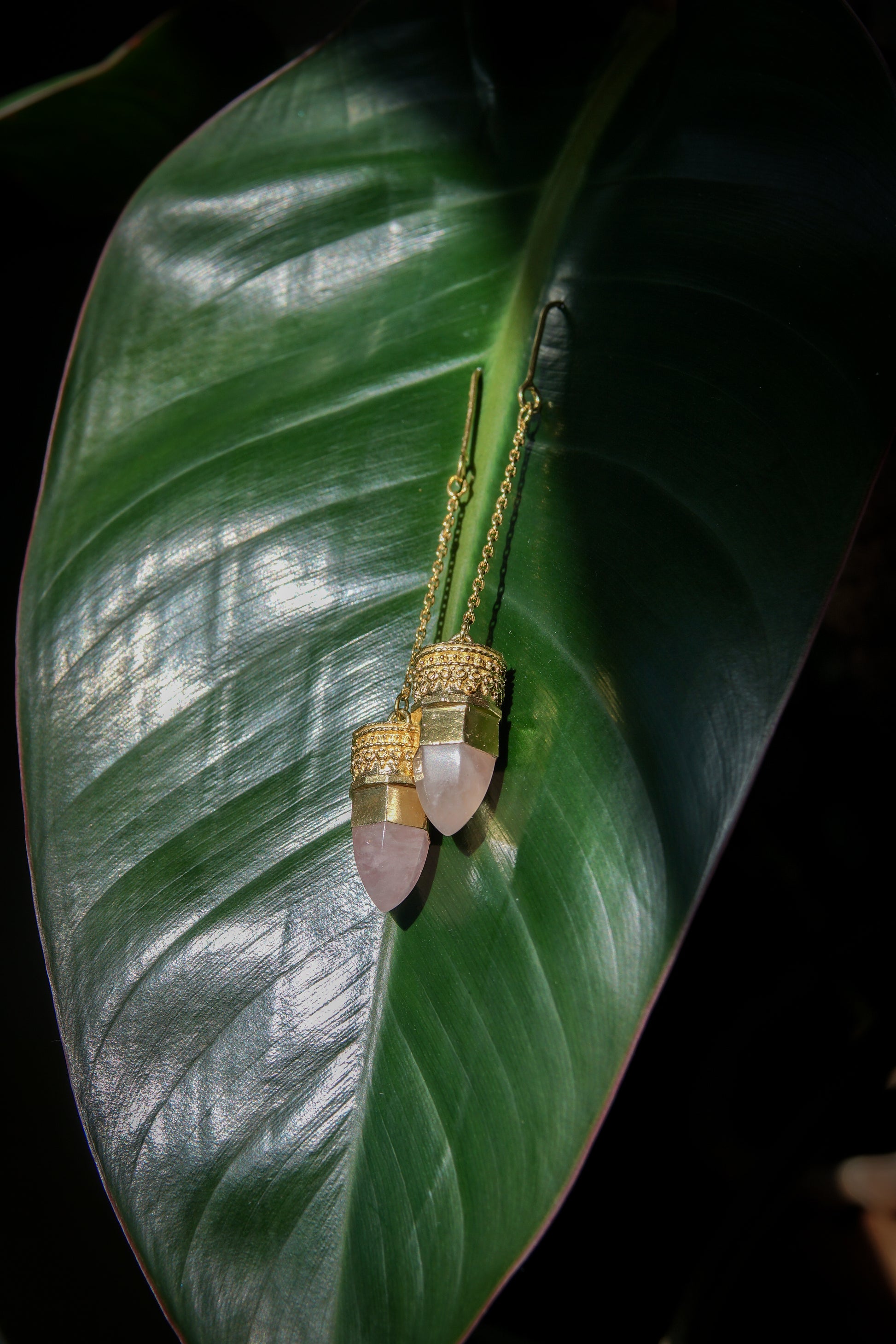These Gold plated silver earrings, set with custom cut soft rose quartz, carry both these forms in harmony. Rose quartz, a stone of the heart, brings tenderness, healing, and clarity—balancing power with compassion. Together, they honor resistance as a quiet, intentional act: of remembering, of staying rooted, of redefining ourselves on our own terms.