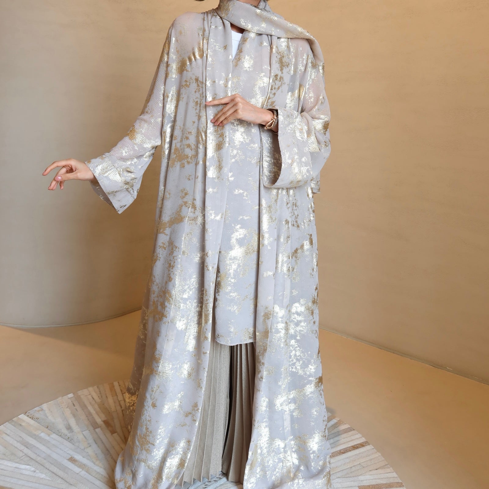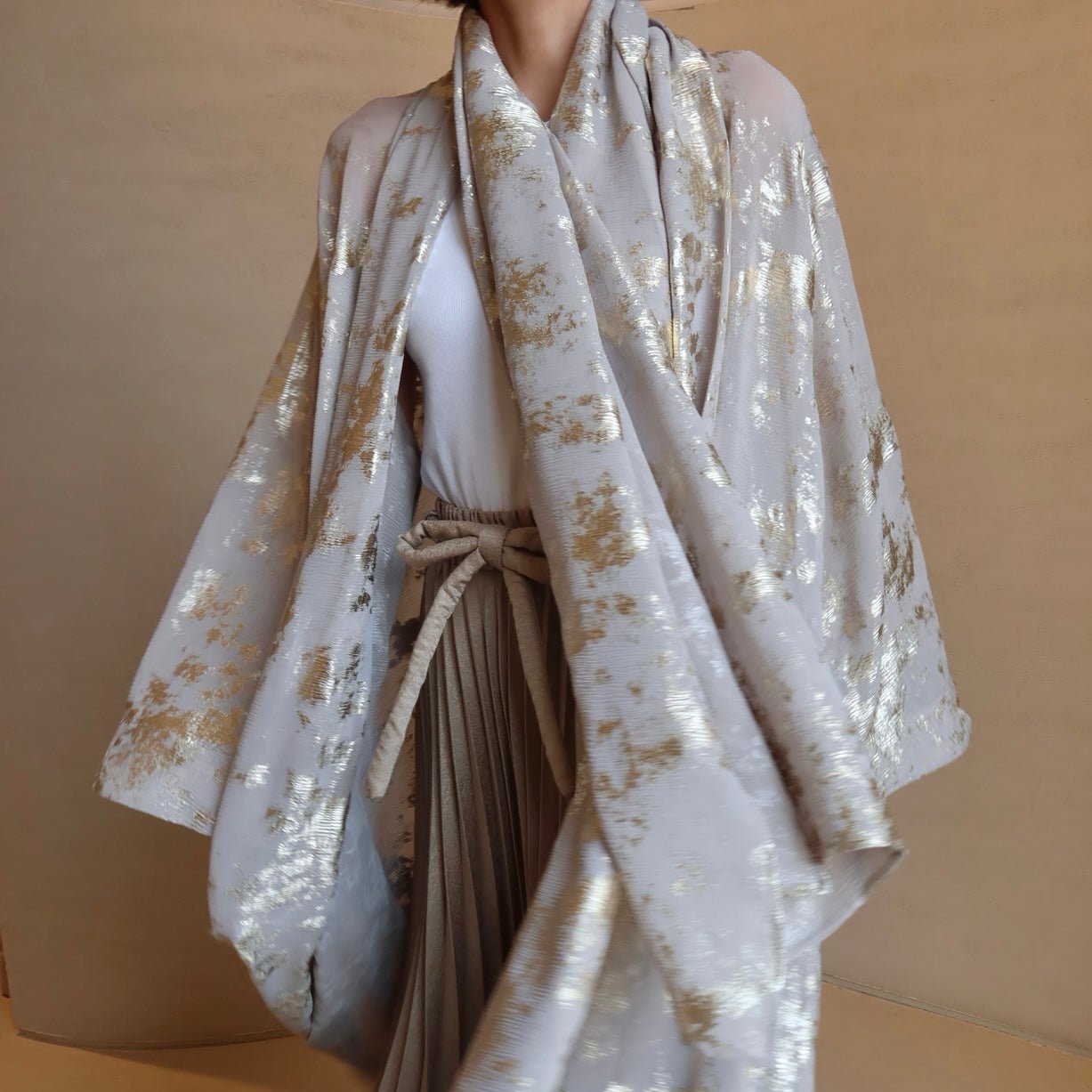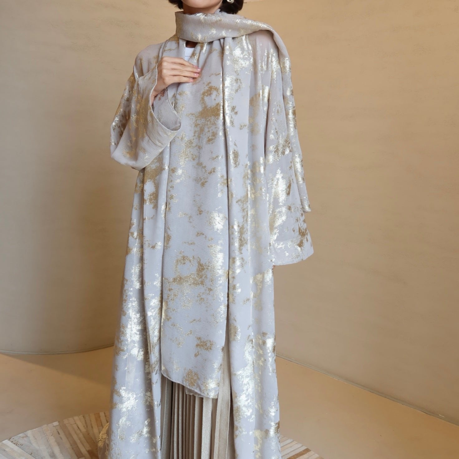 عباية ذهبية، قطعة مقاس واحد مصنوعة من الحرير اللامع، تتميز بتصميم ذهبي رقيق وطول يبلغ حوالي 147 سم.