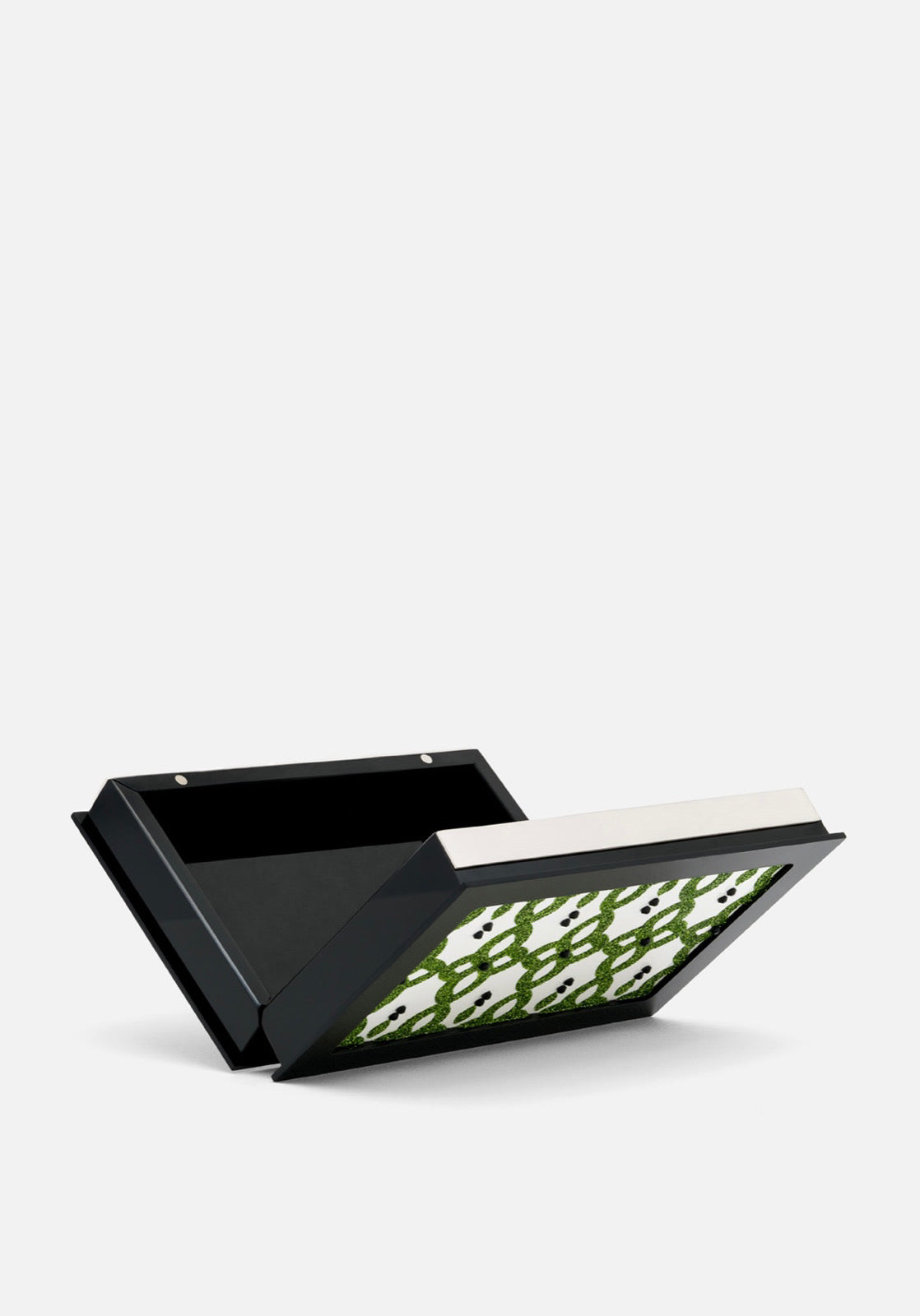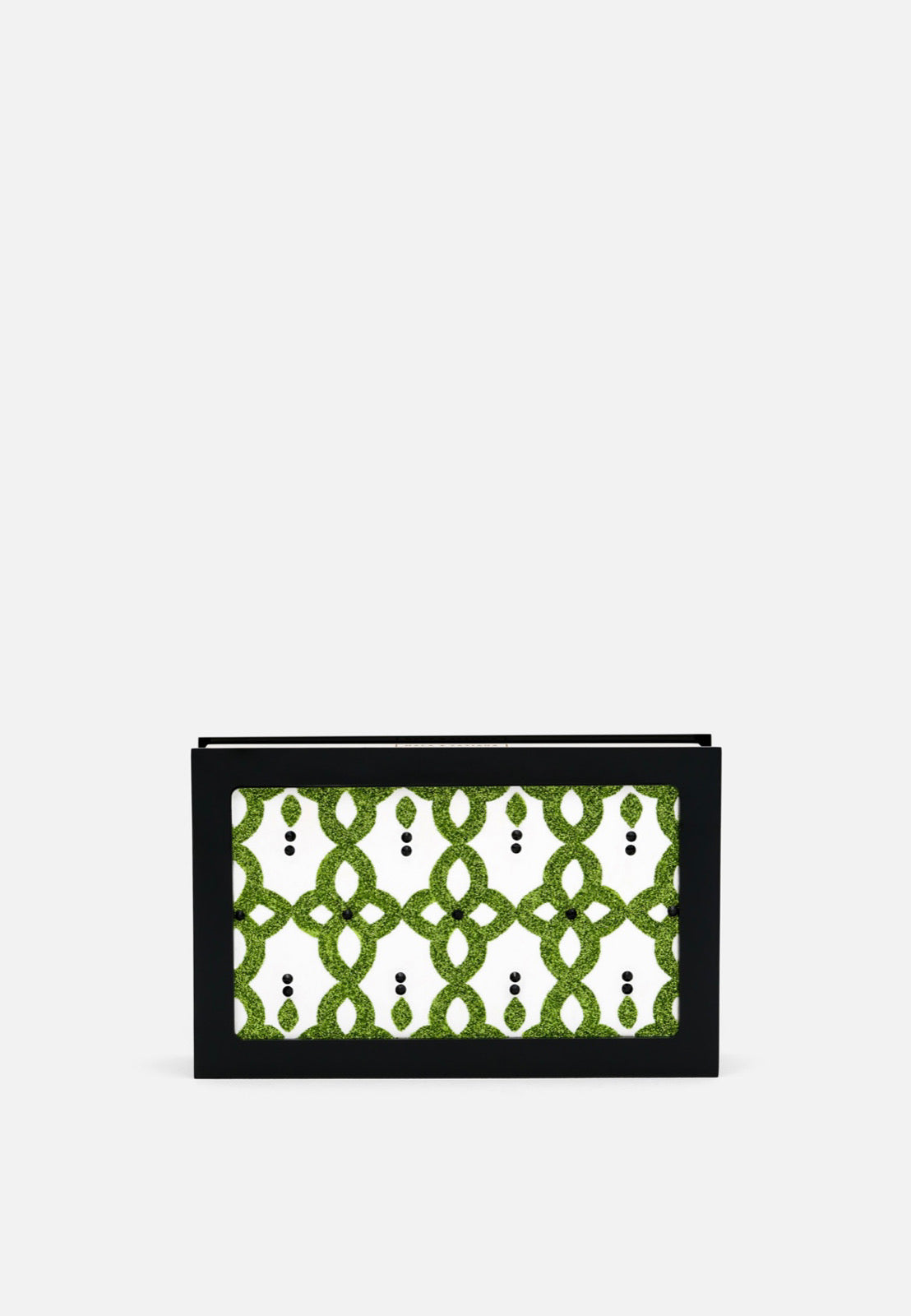 تصاميم عربية مصنوعة يدويًا من زجاج شبكي، مطلية يدويًا بألوان لامعة ومزينة بكريستالات سوداء. تأتي هذه الحقيبة مع إطار معدني مطلي بالفضة منقوش عليه الشعار.