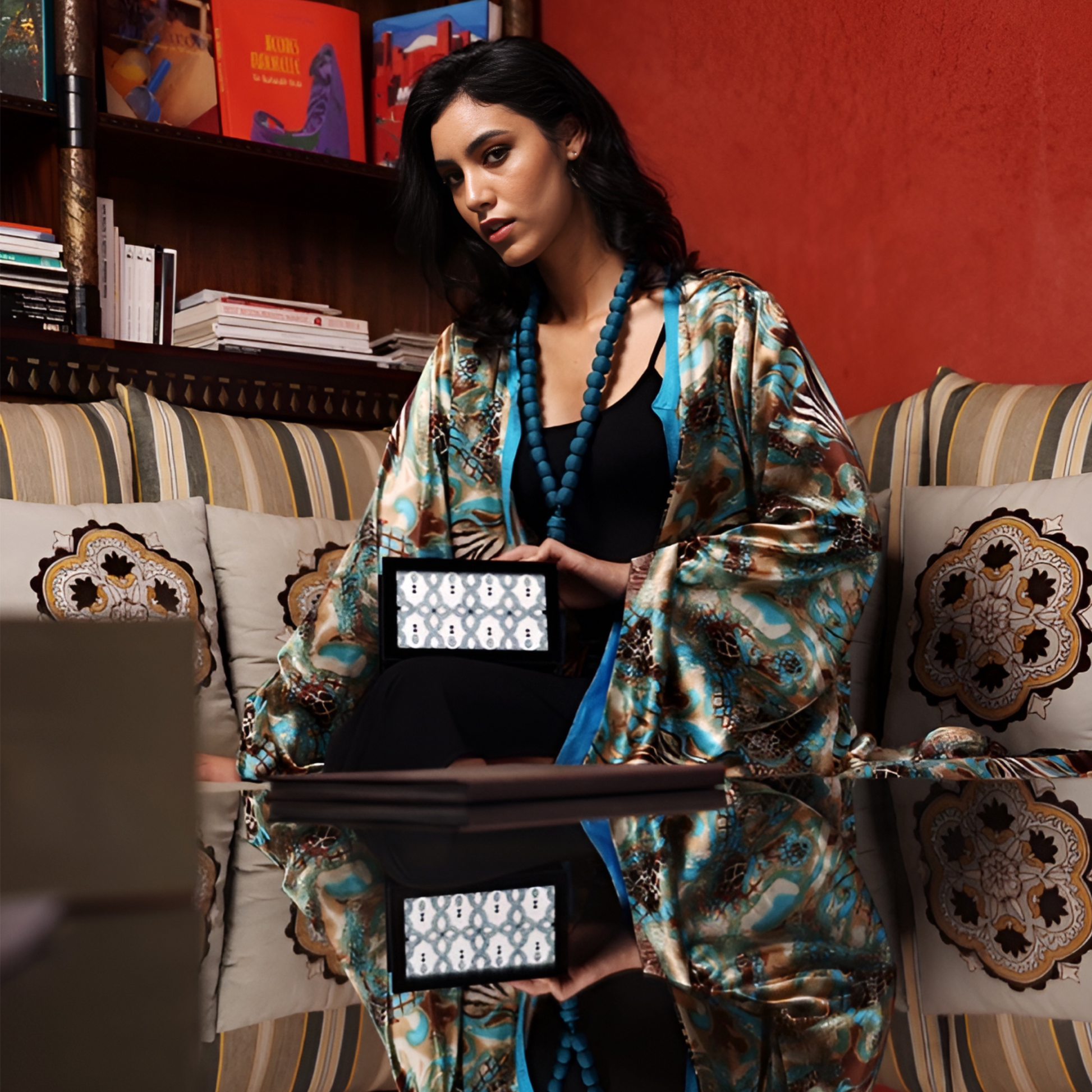 تصاميم عربية مصنوعة يدويًا من زجاج شبكي، مطلية يدويًا بألوان لامعة ومزينة بكريستالات سوداء. تأتي هذه الحقيبة مع إطار معدني مطلي بالفضة منقوش عليه الشعار.