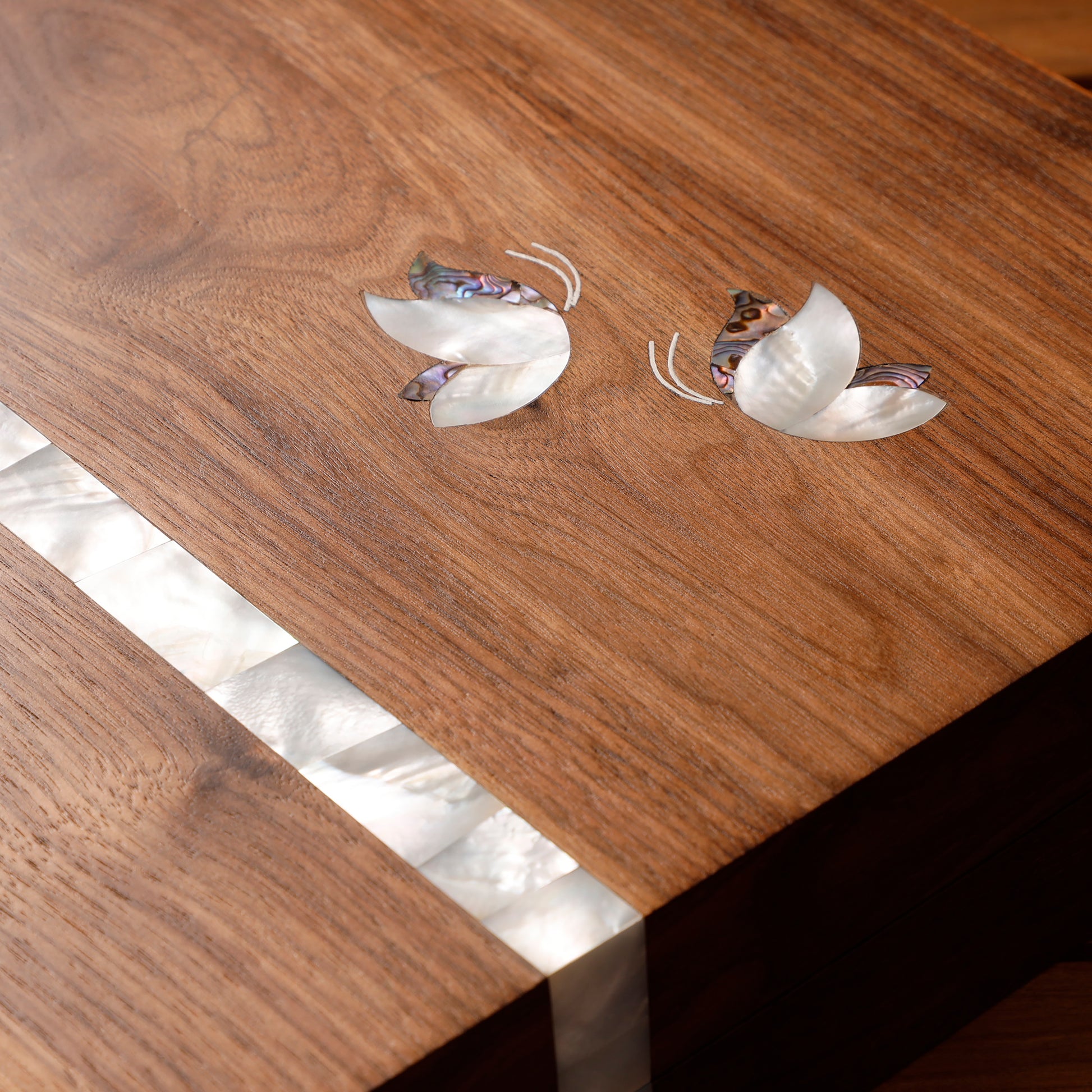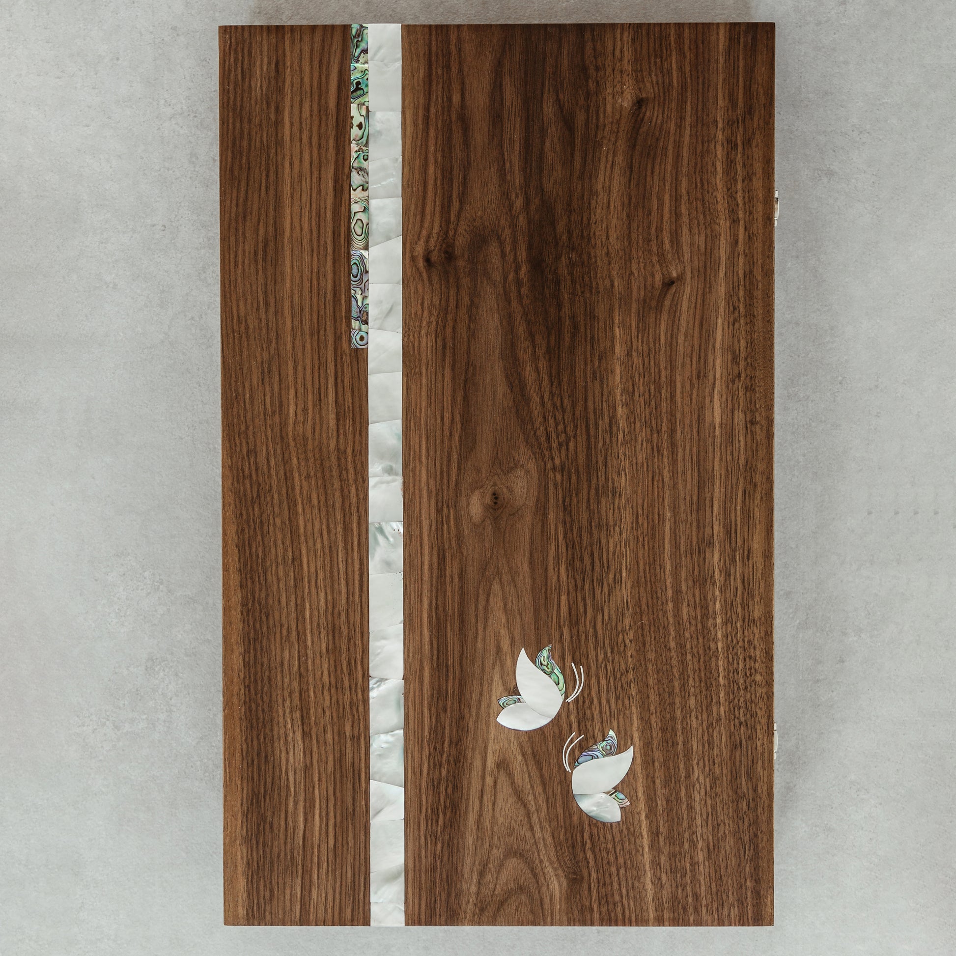 Where craftsmanship meets couture, this artisanal backgammon set, hand made from solid wood and inlaid with lustrous mother of pearl, transforms the timeless game into a statement of opulence. A tactile symphony of elegance, made for those who play with style, inspired by the delicate dance of butterflies, captured in every shimmering detail.
