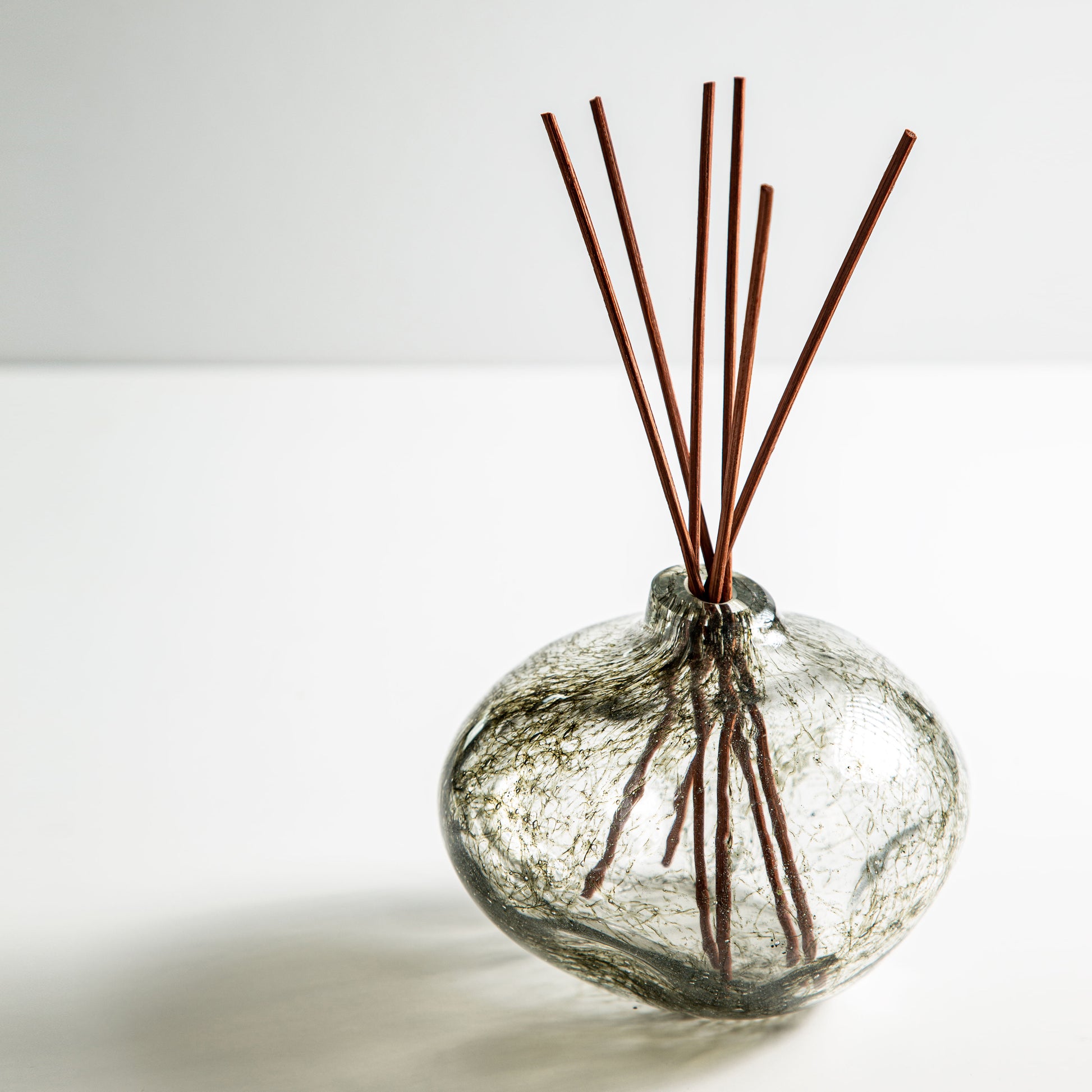 The frozen bubble, mouth-blown by craftsmen in Murano, combines recycled glass and metal threads, invoking a historical appreciation for the art of glassblowing. It is not intended to follow a specific style; instead, it embraces the freedom of form and the randomness of metal threads that merge with the glass. This frozen bubble captures a moment of material spontaneity and expressive texture.