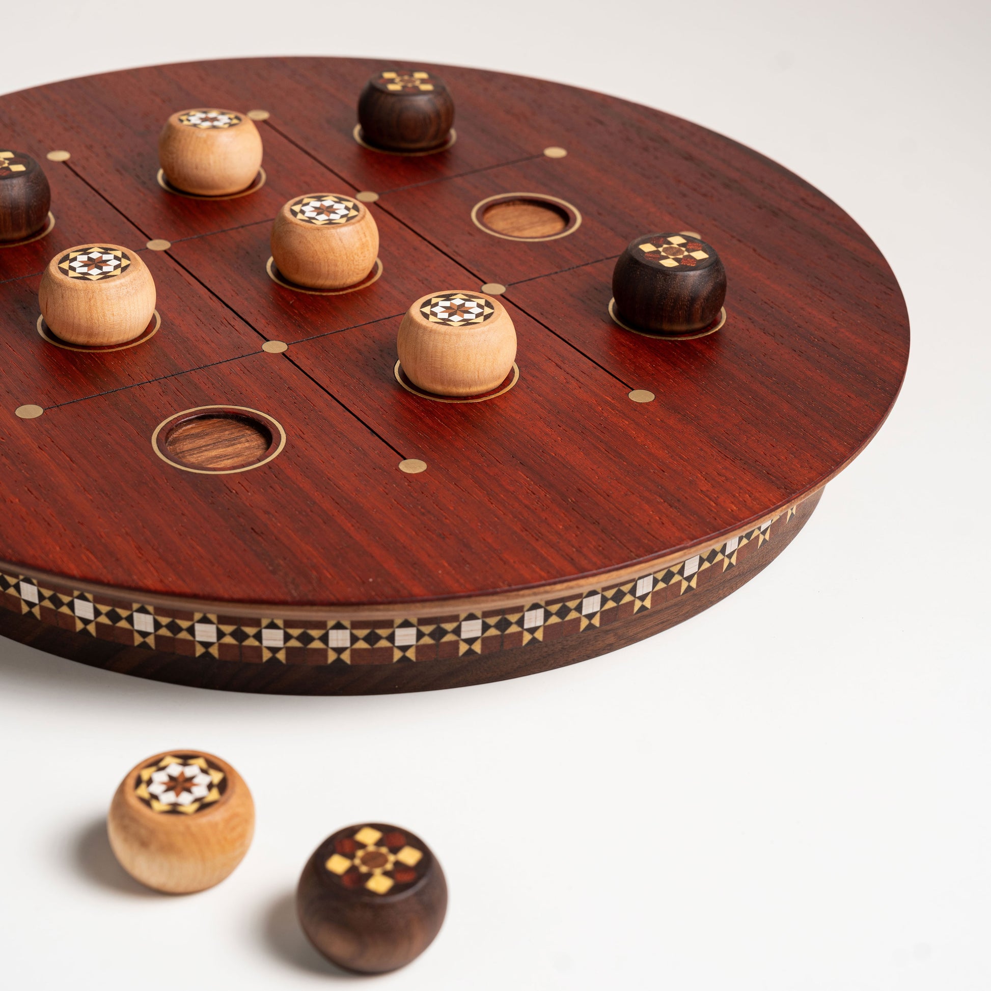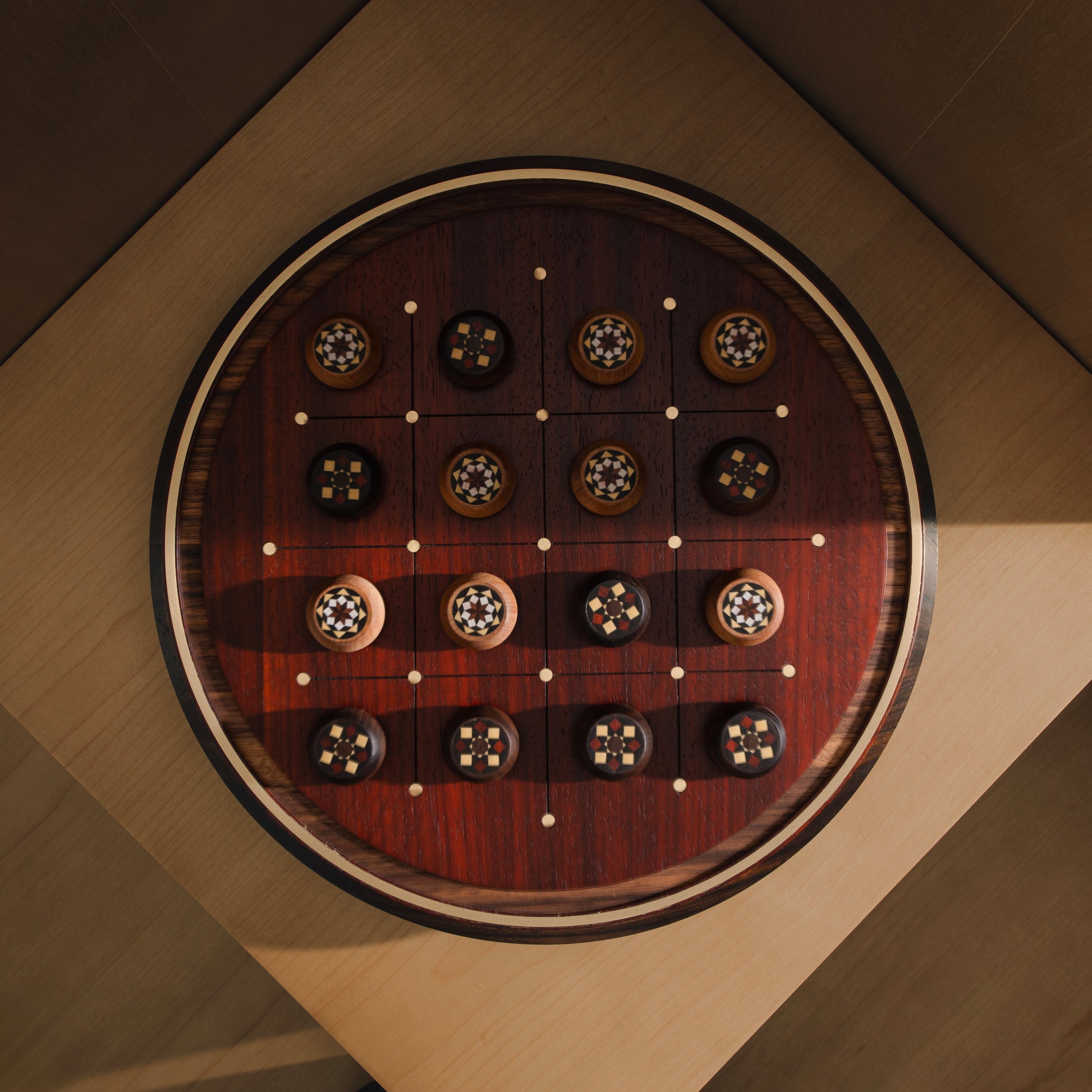 This intriguing piece of artwork is an expertly crafted wooden game board, showcasing an elegant blend of artistry and craftsmanship. The game pieces themselves are captivating in their design. Each piece is a smooth, rounded form, divided into sections via delicate, engraved Levantine mosaic patterns on their tops. The use of natural solid wood and brass evokes a sense of organic warmth and timeless elegance, encouraging interaction while also serving as a stunning visual display.