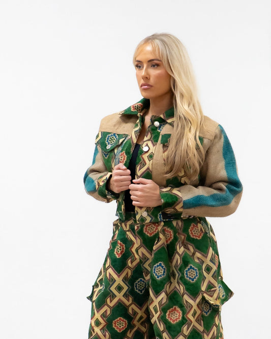 ANOURI - Green & Gold Crop Burlap Bomber Jacket