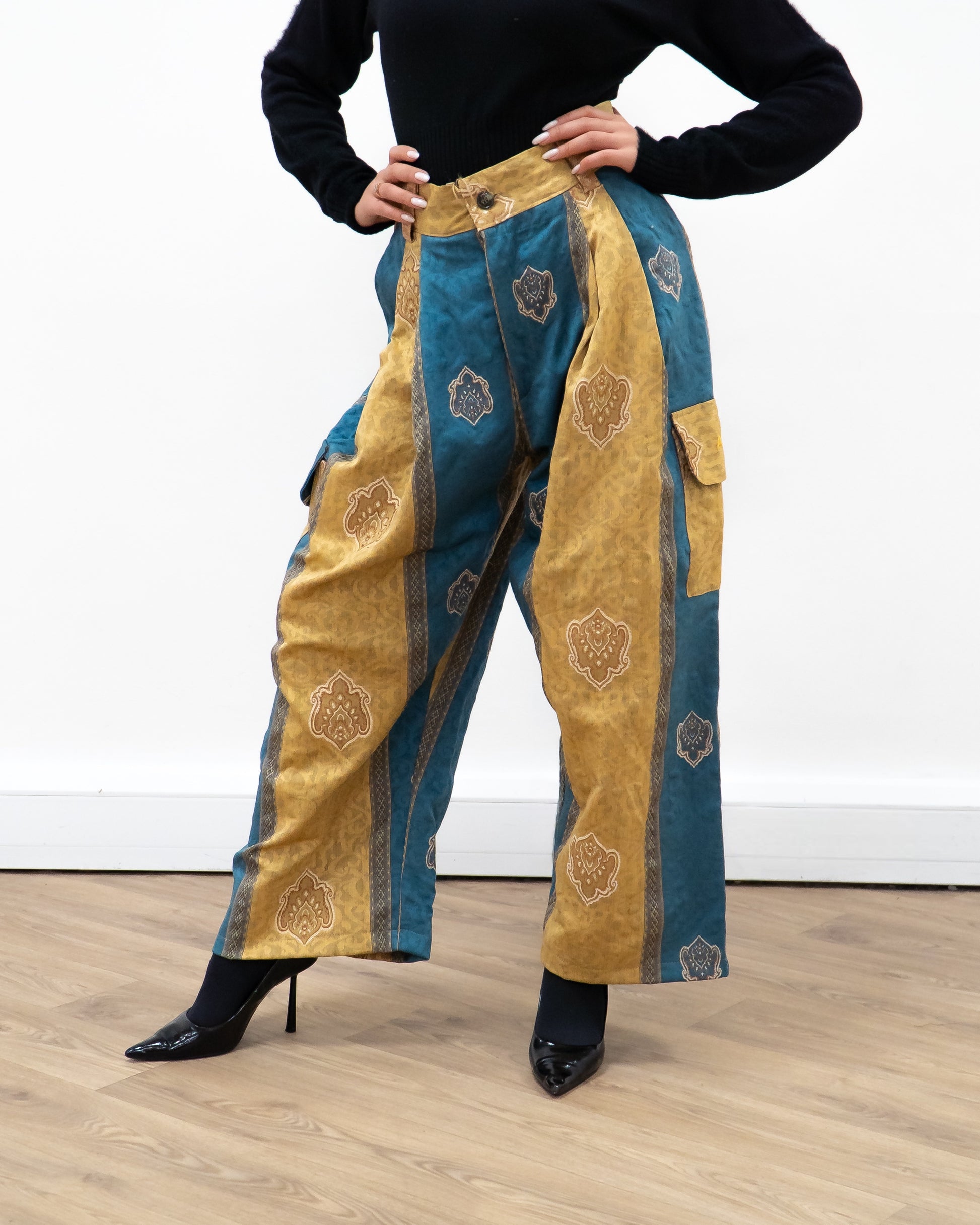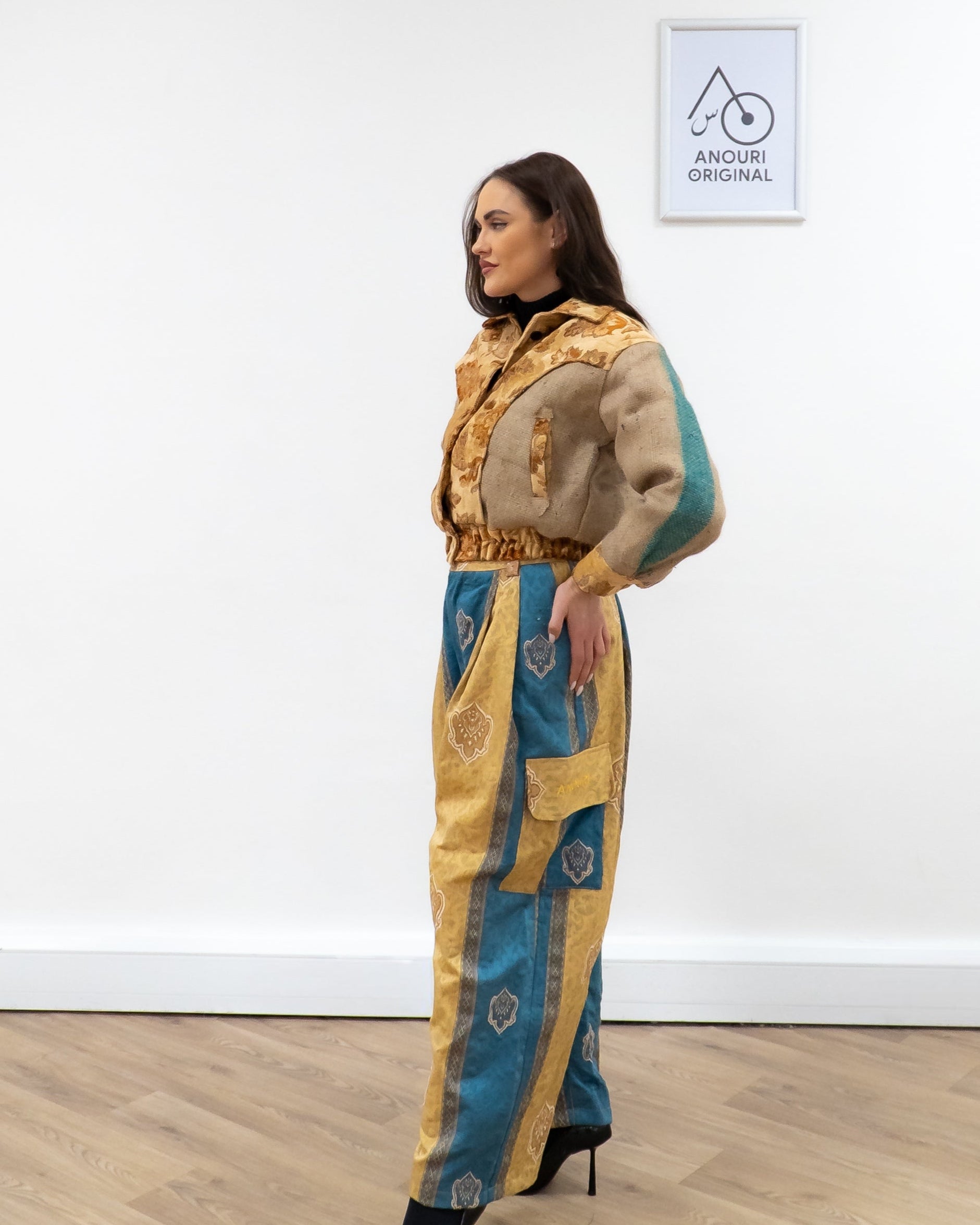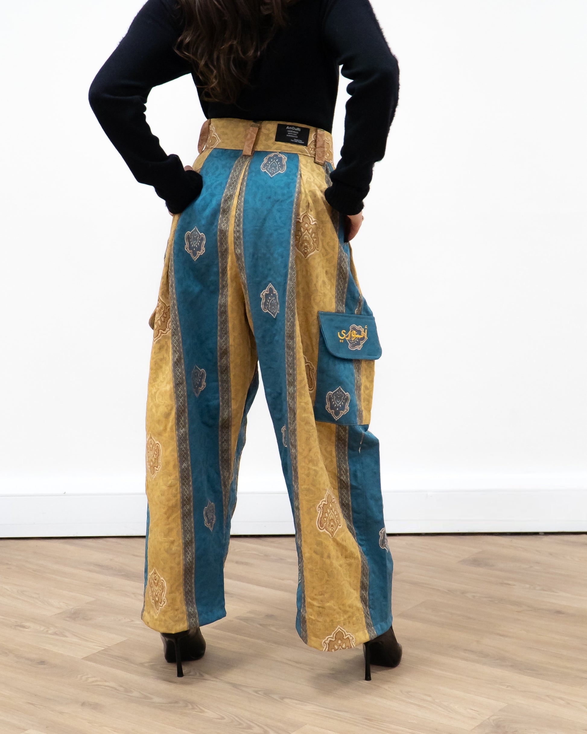 Blue & yellow unisex carpet trousers. Cargo pocket detailing & tapered leg. Made from recycled Moroccan carpet fabric. Pair with an ANOURI jacket for the ultimate statement look.