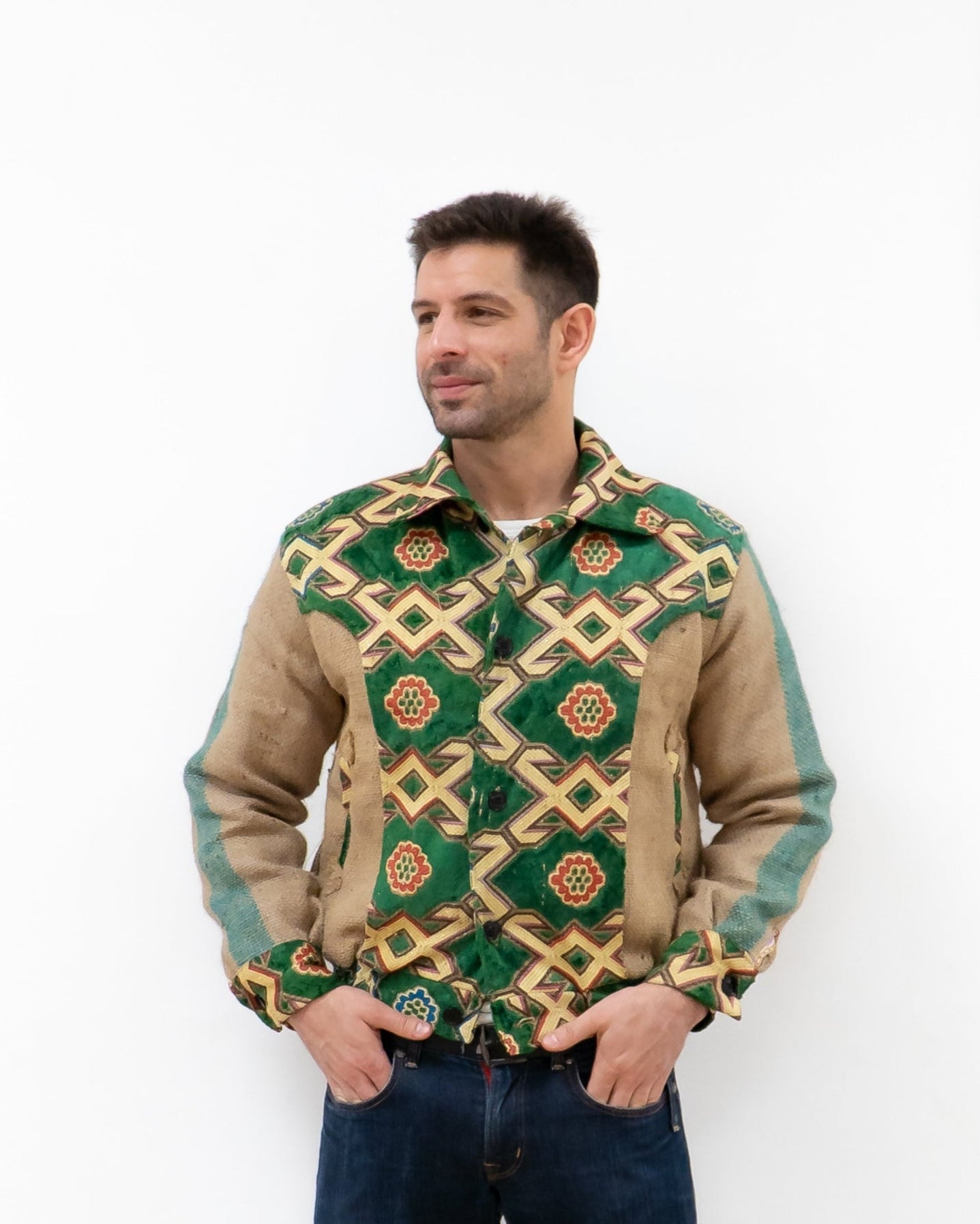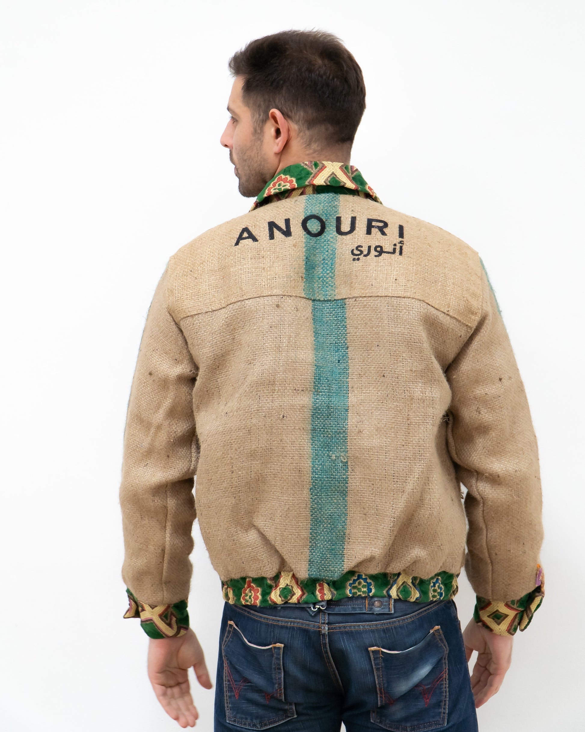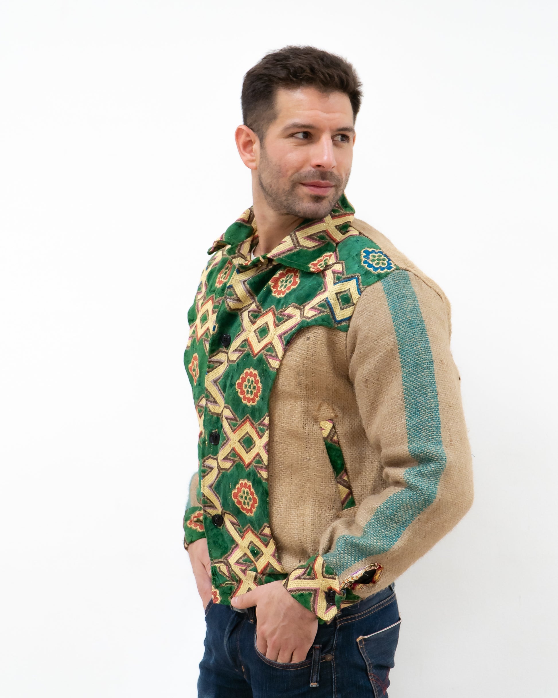 This unisex burlap jacket features distinctive green carpet panel accents. It includes button closures and a cinched hem to create a tailored fit at the waist. Crafted completely from recycled Moroccan burlap and carpet fabric, ANOURI logo printed on the back.
