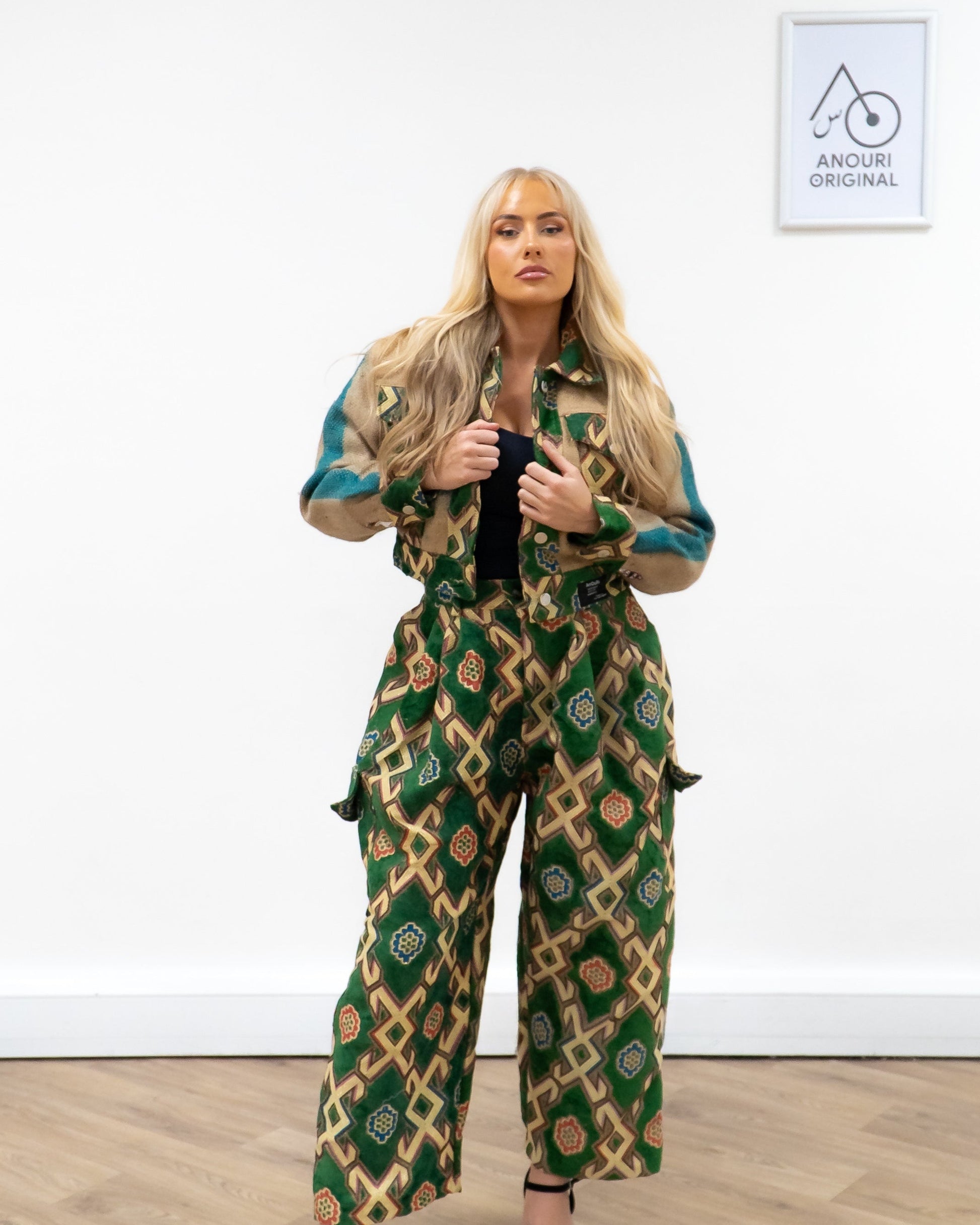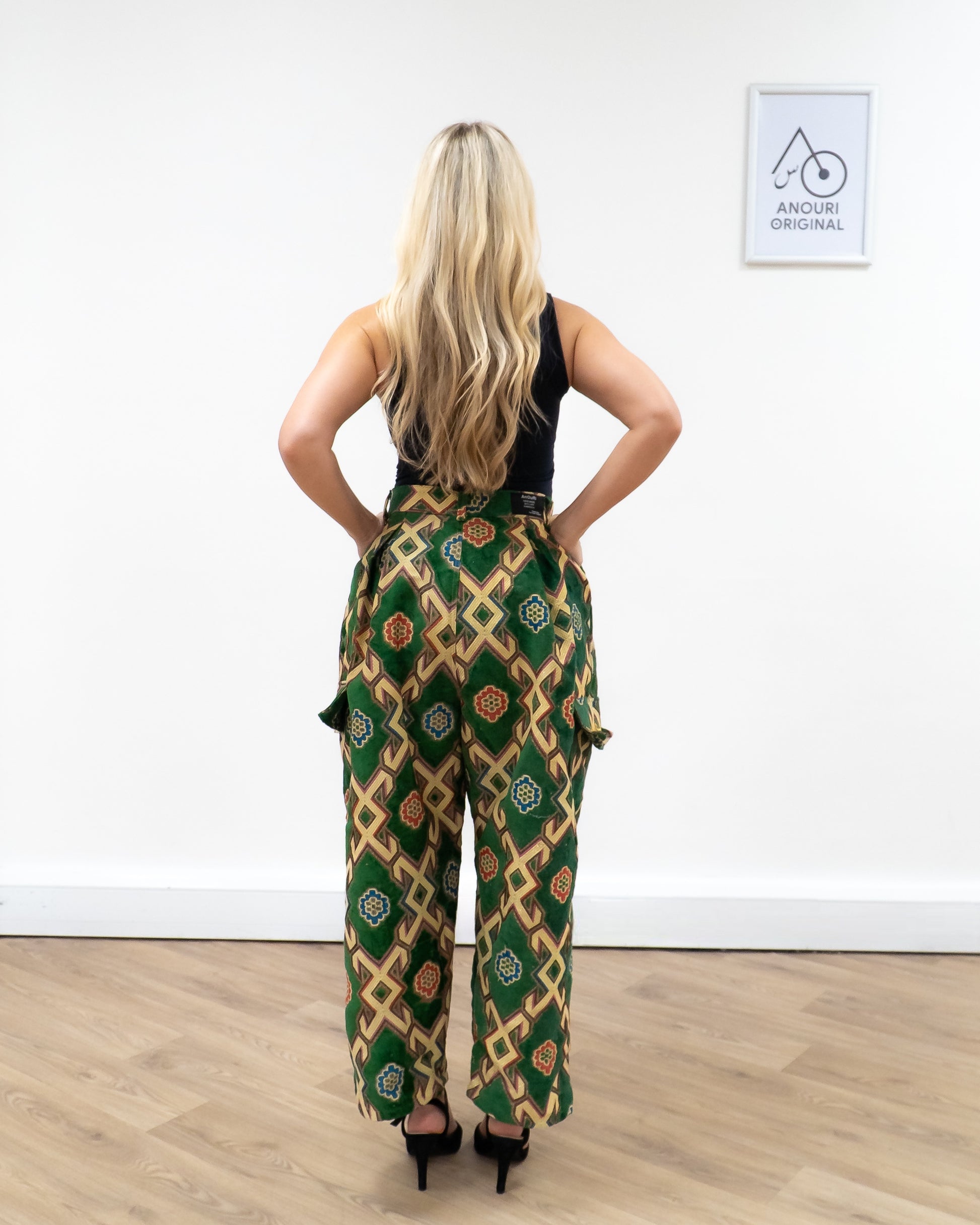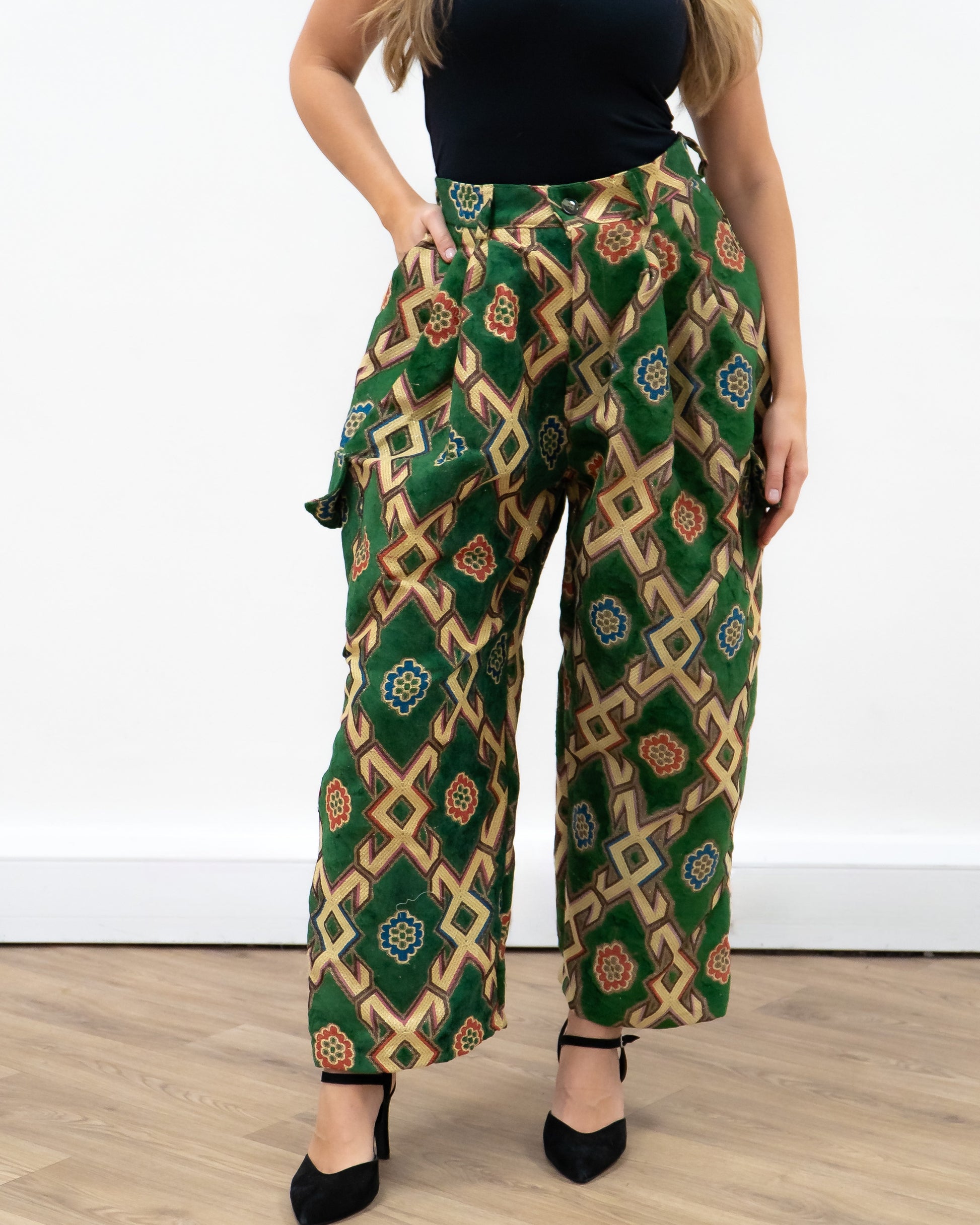 Unisex green & gold print carpet cargo trousers. Darted front & balloon tapered shape. Cargo pocket detailing. Made from recycled Moroccan carpet fabric.
