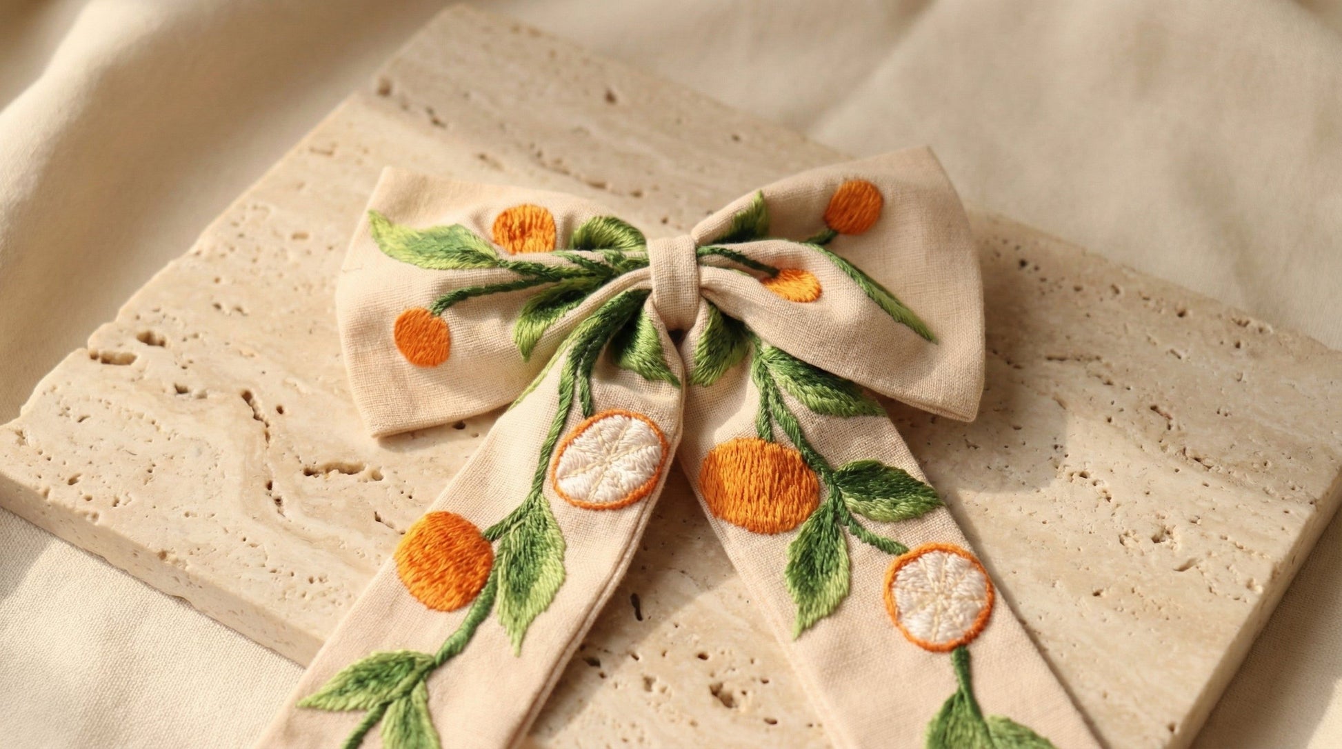 Inspired by the iconic oranges of Jaffa, this linen hair bow is adorned with vibrant orange motifs and leafy branches. Made from natural linen, it blends cultural heritage with timeless charm.