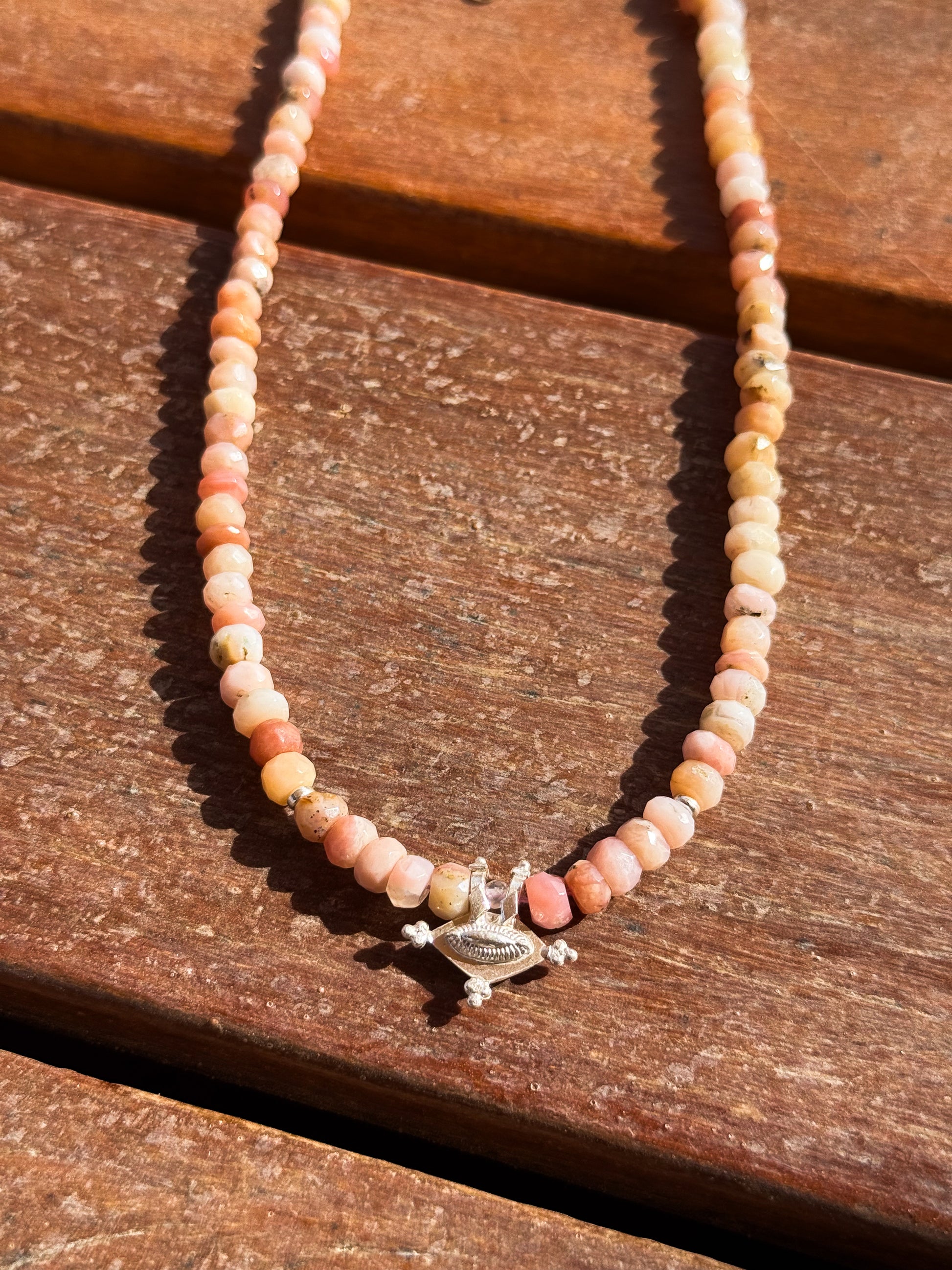 Materials: Sterling silver pendant and findings, stainless steel nylong wire and natural Pink Opals.
