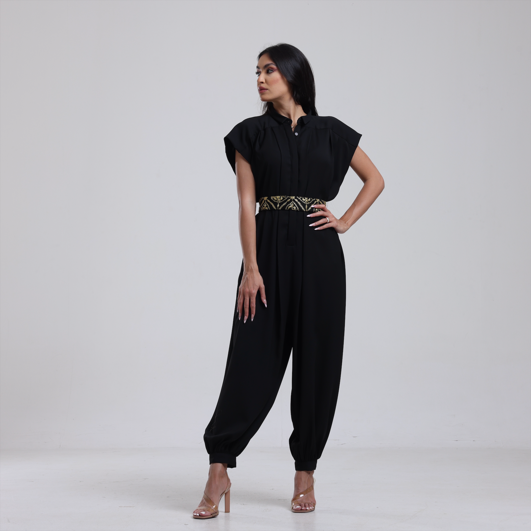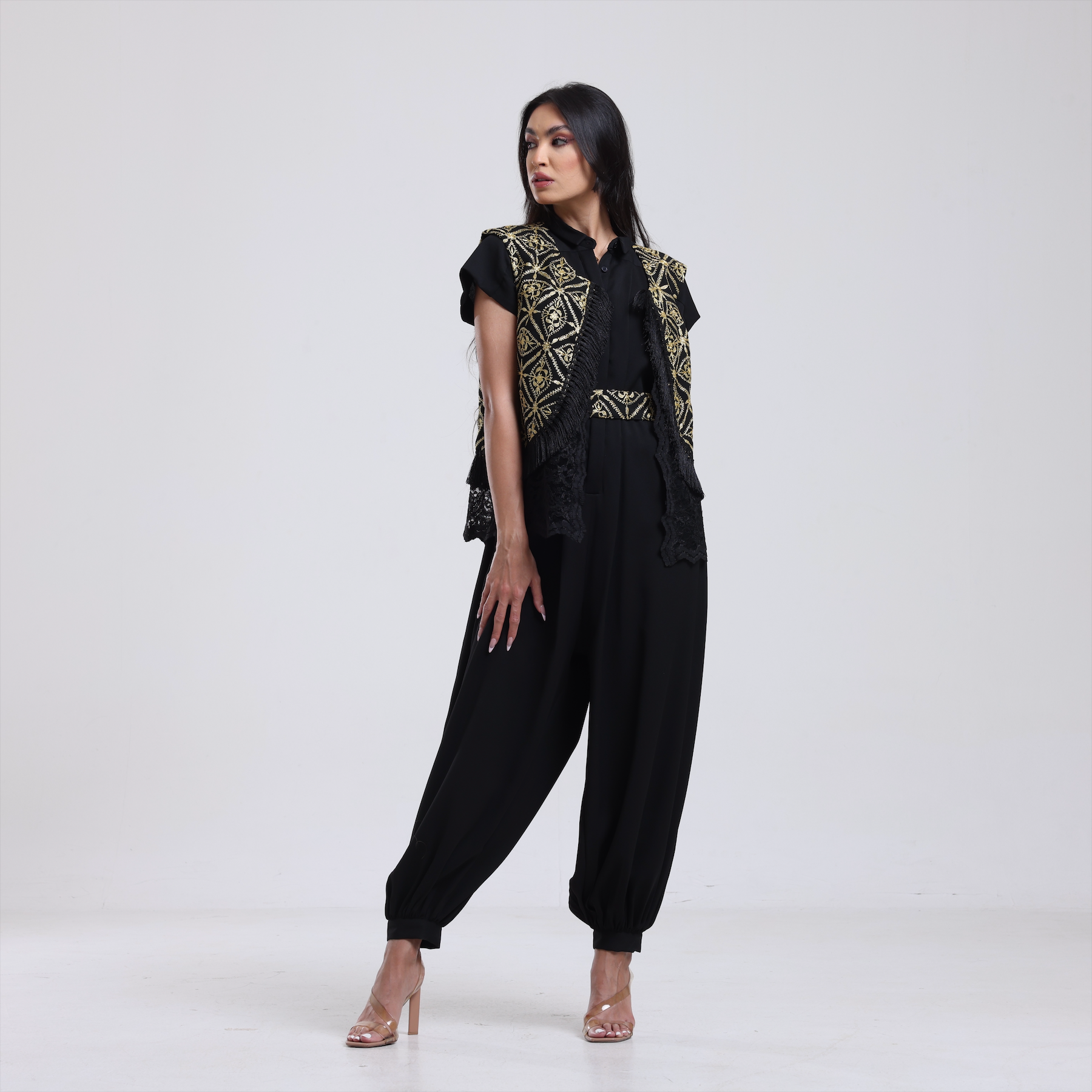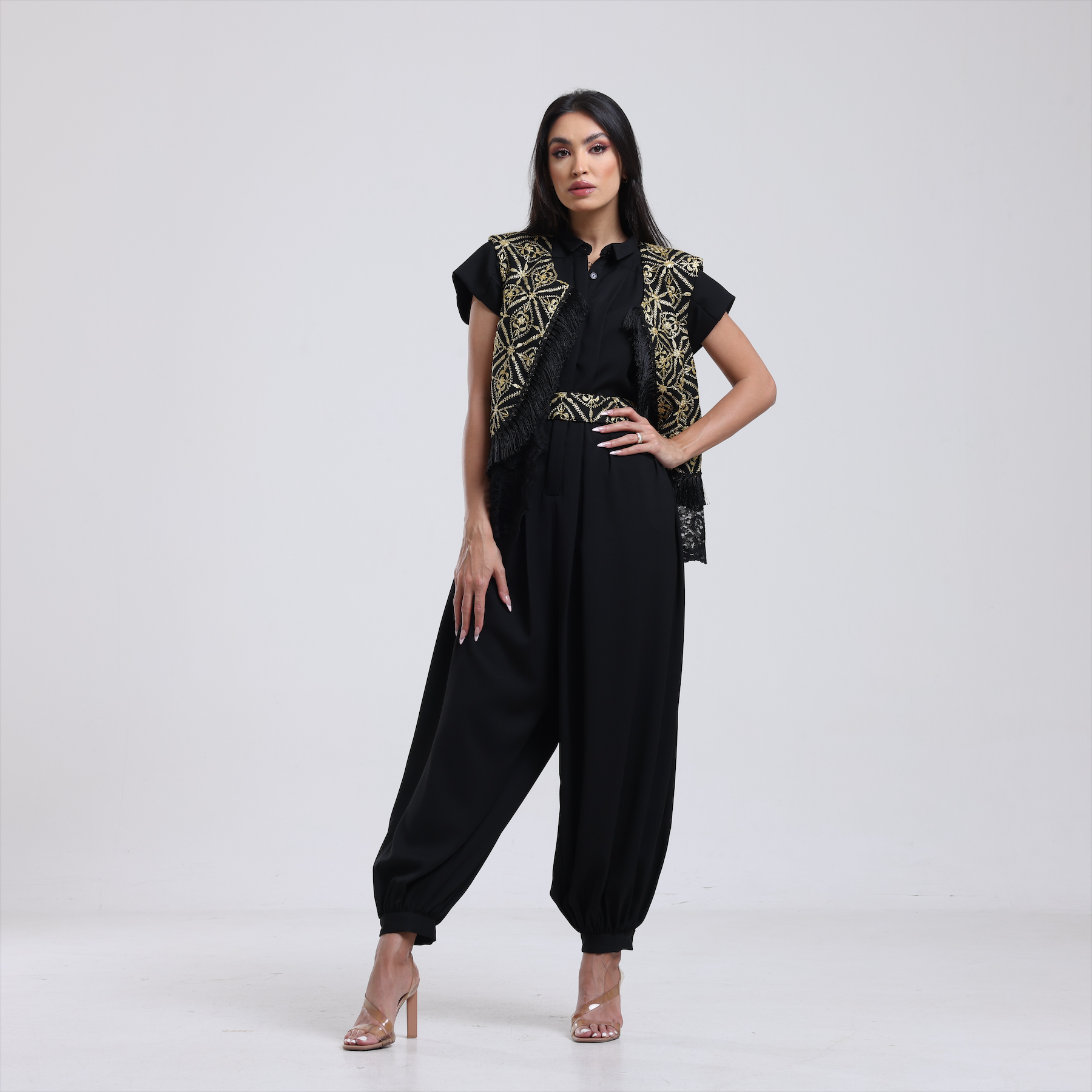 Short-sleeved black jumspuit featuring relaxed harem-style trousers. Paired with a gold-embroidered waistcoat and a matching embroidered belt.