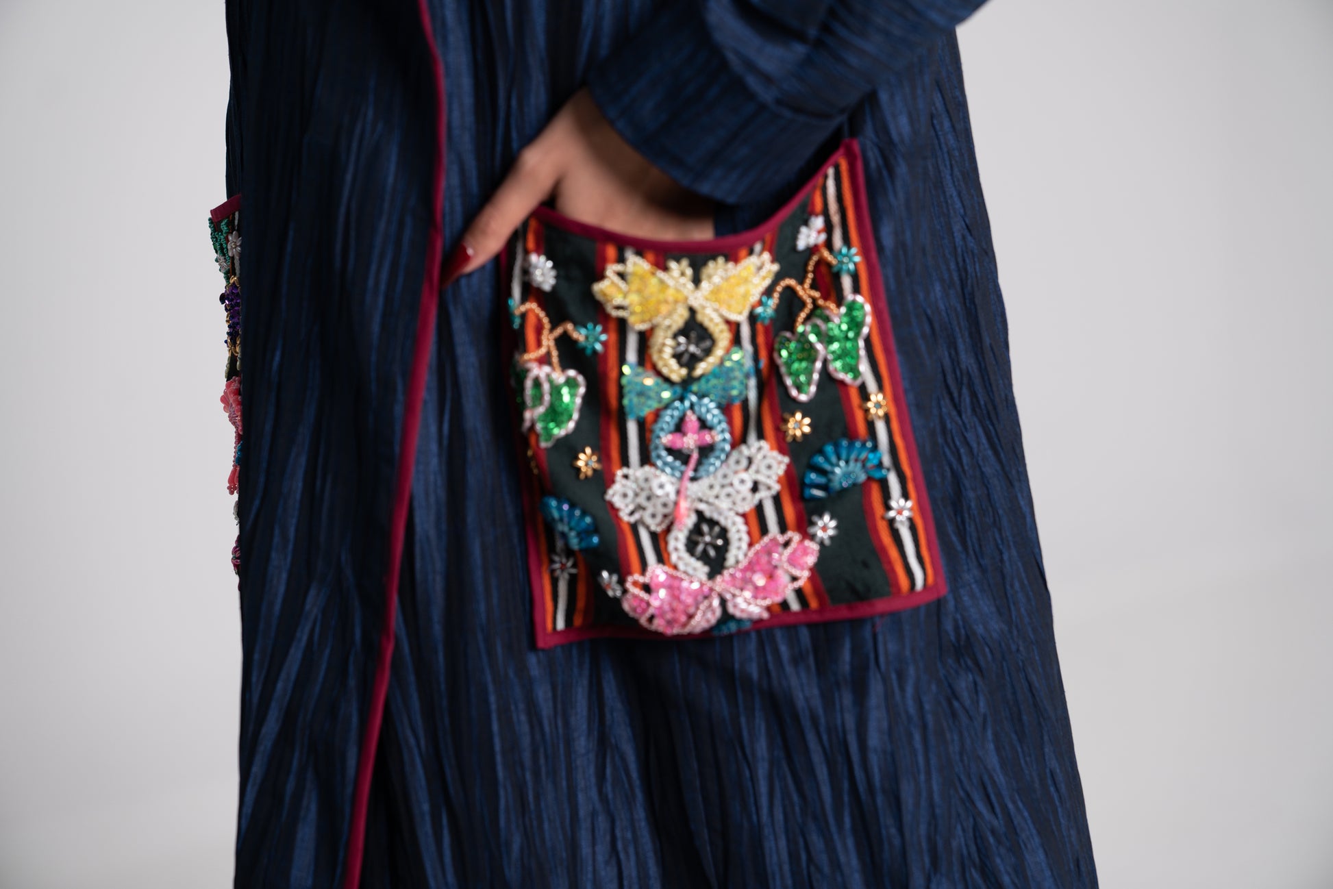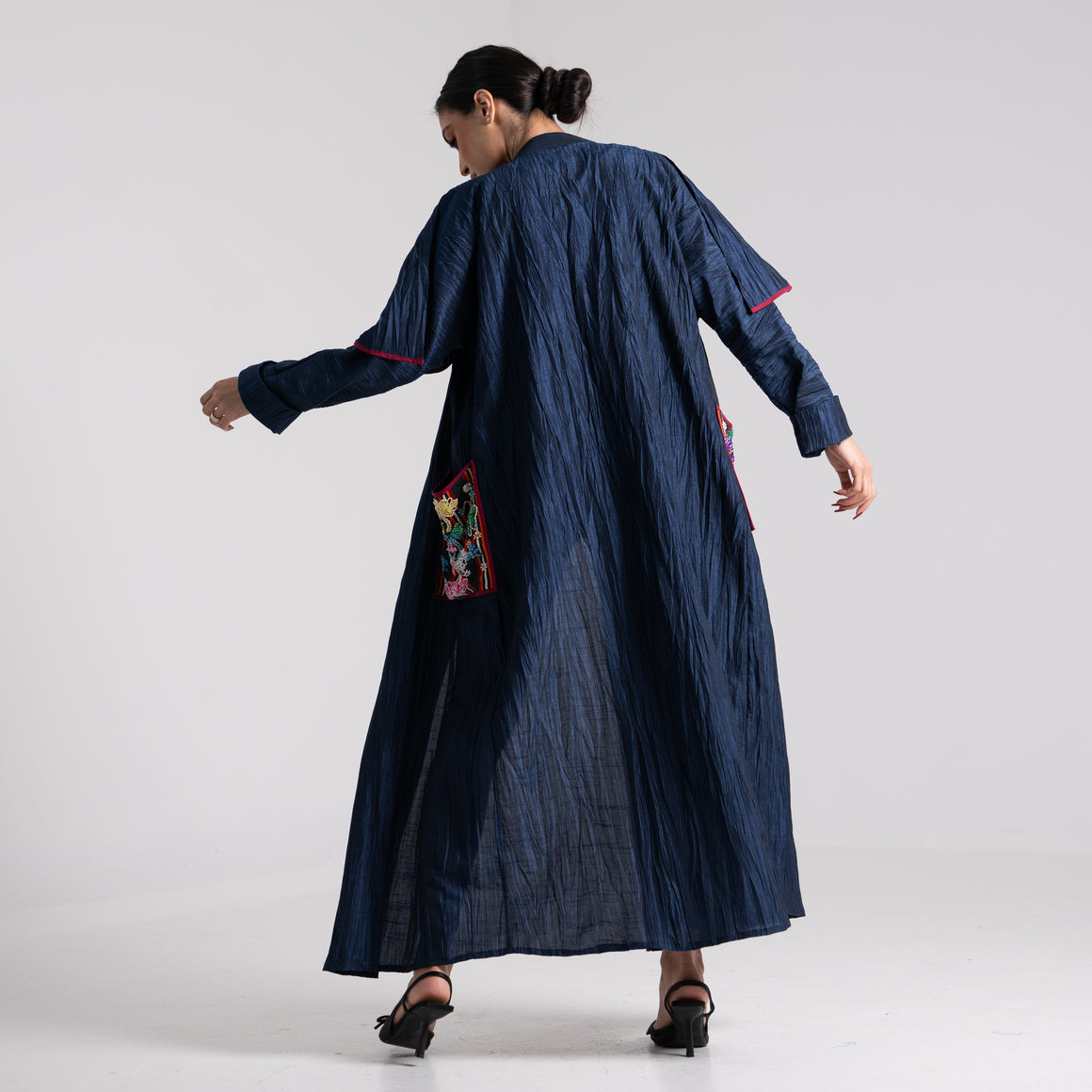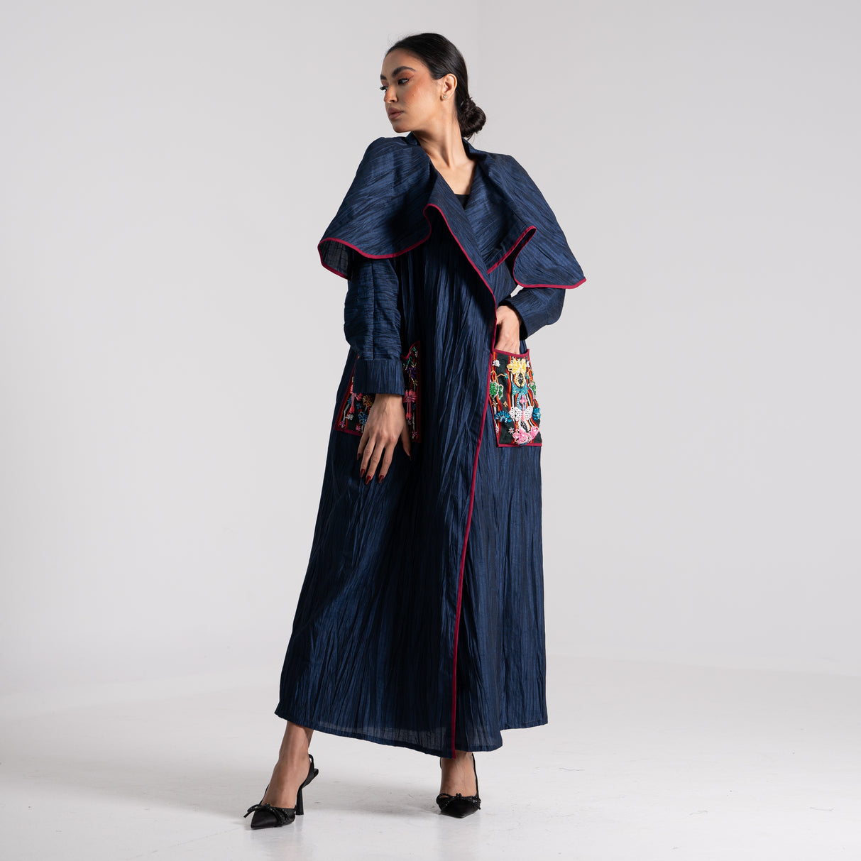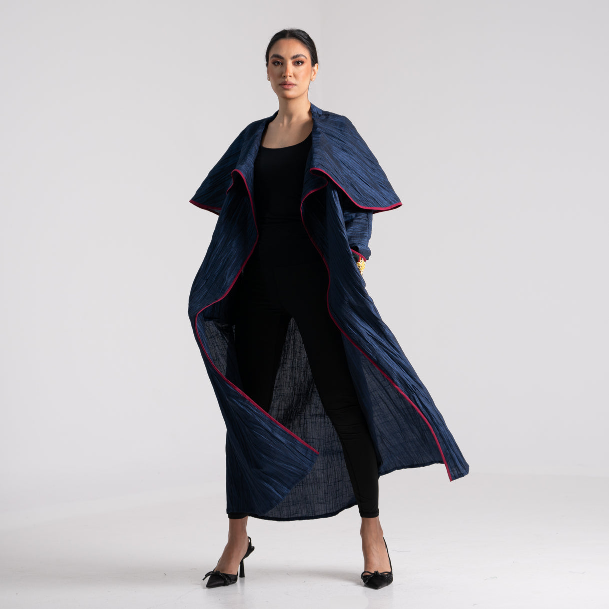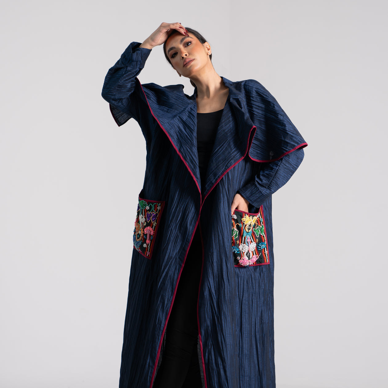 Longline navy crinkled kimono, designed with wide lapels through the shoulders and an open front silhoutte. Finished with contrast piping and hand-embroidered Siwa pockets for an artisinal touch.