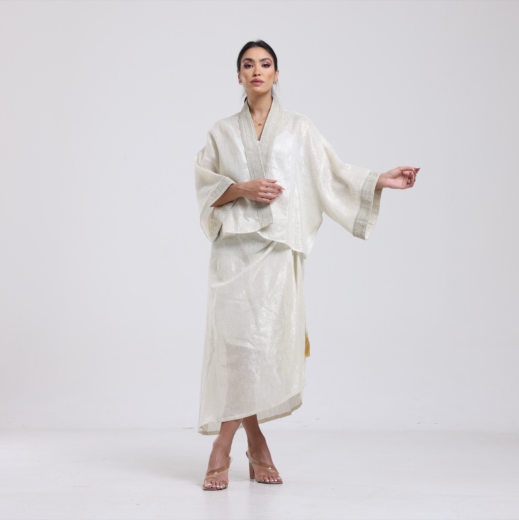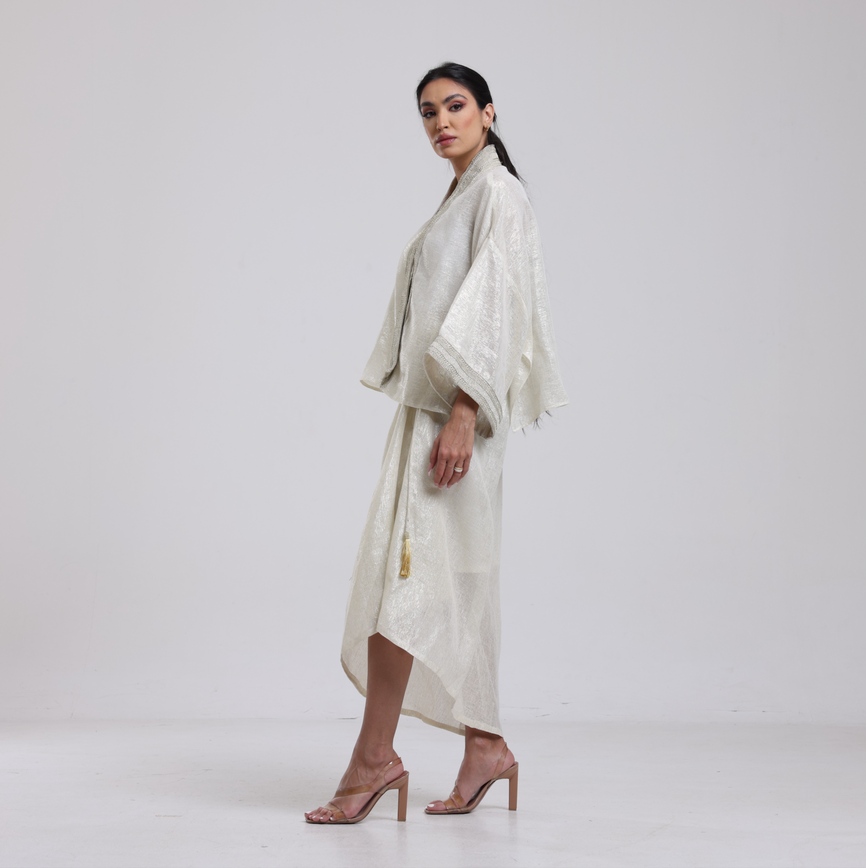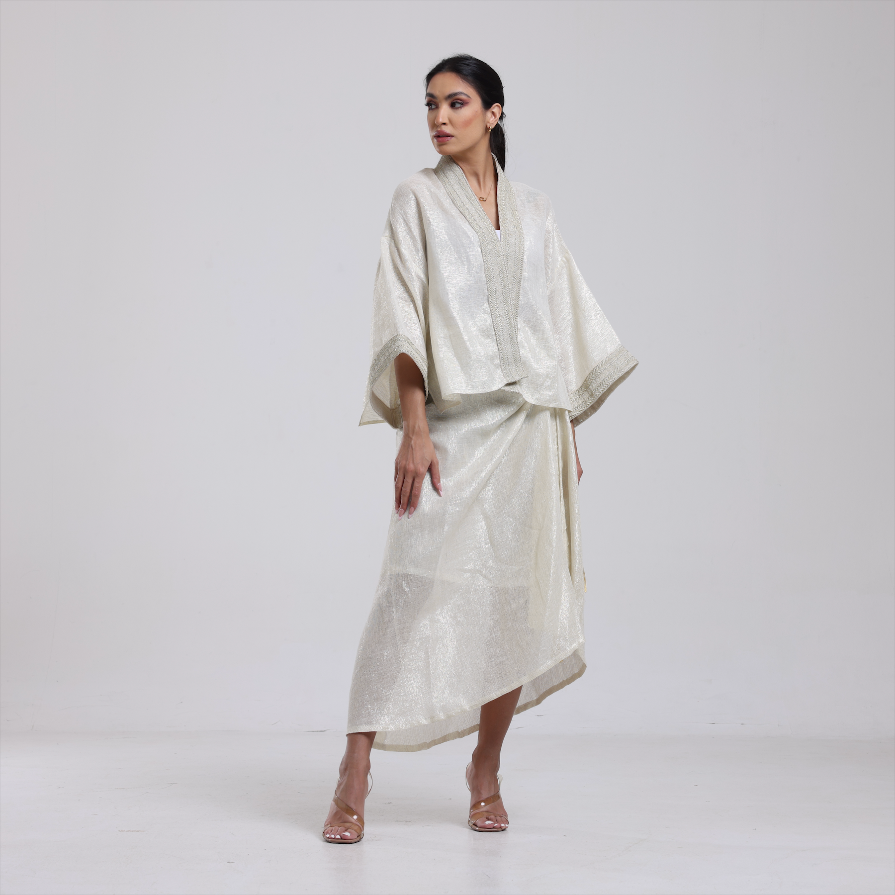 Two-Piece ivory set, featuring a relaxed kimono jacket with wide sleeves and a contrast woven trim along the neckline and sleeve edges. Paired with a matching asymmetric midi skirt.