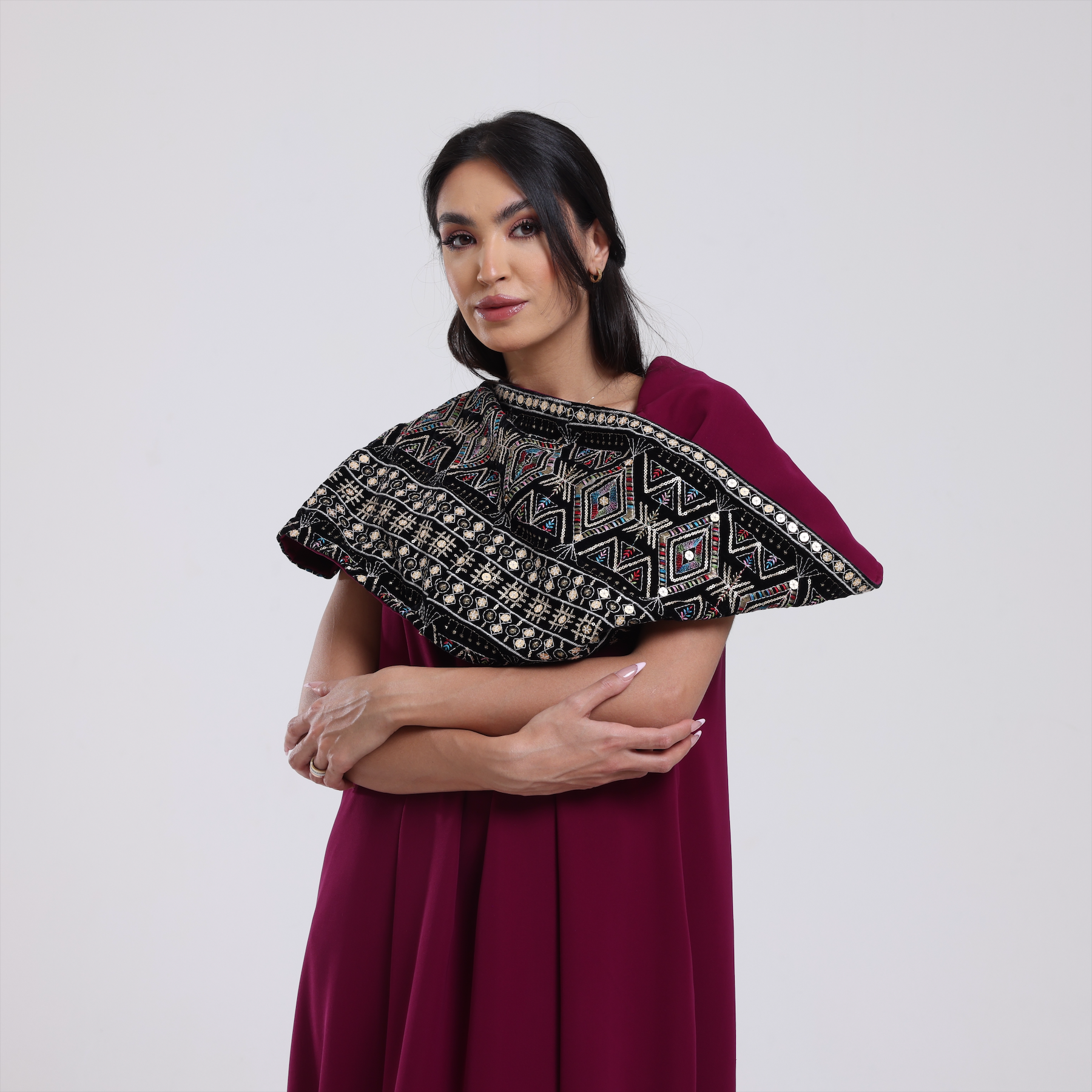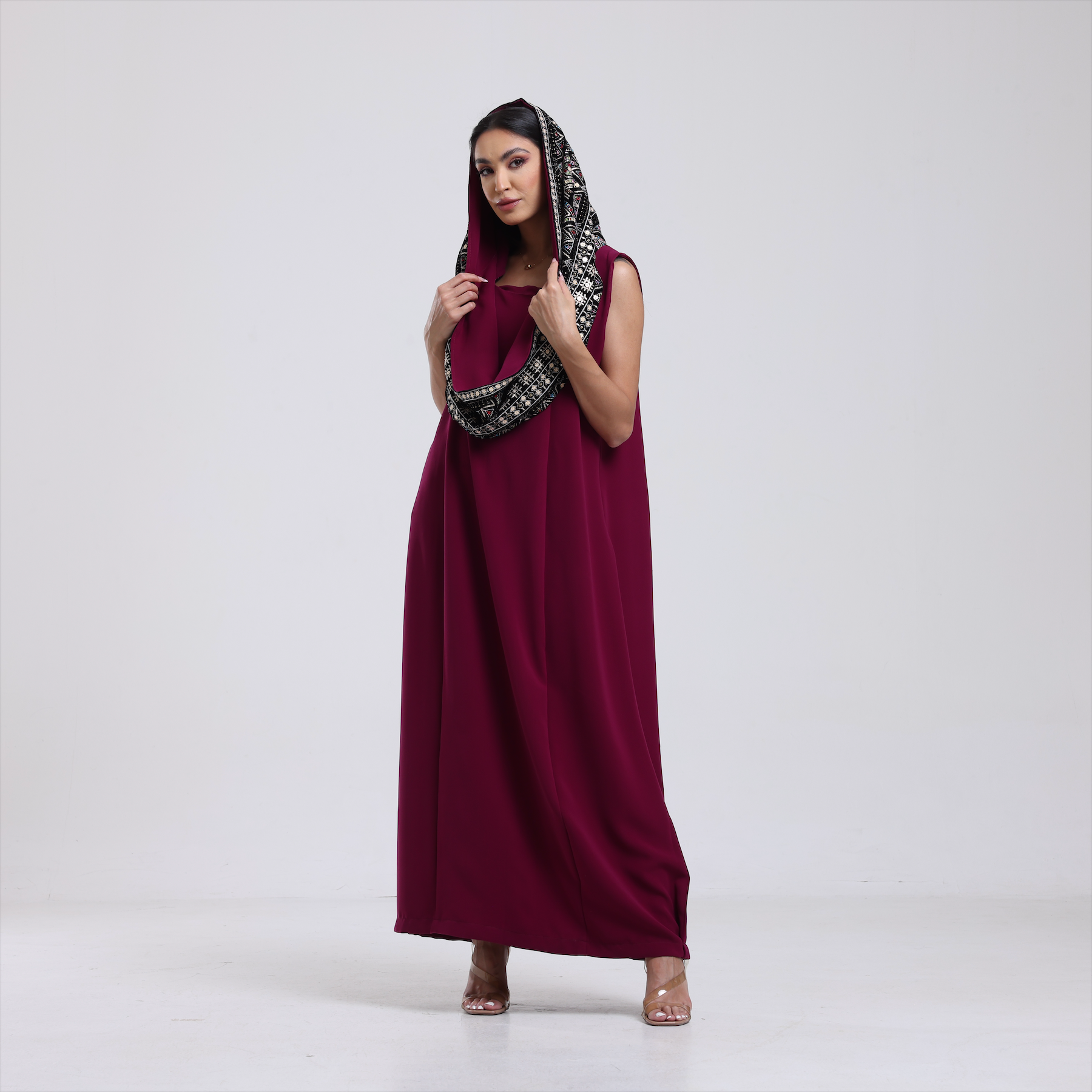 Magenta purple, sleeveless straight maxi dress paired with an embroidered draped hood. This versatile piece can be styled in many ways — over the shoulders, draped, and more — allowing you to create multiple looks.
