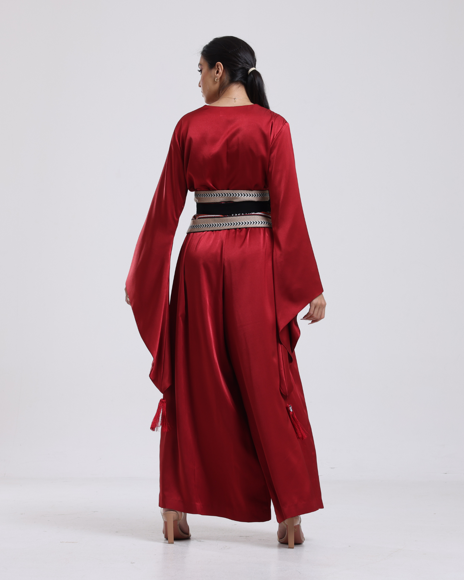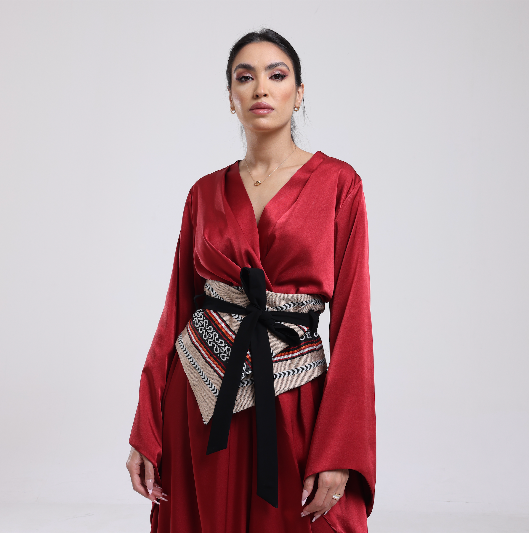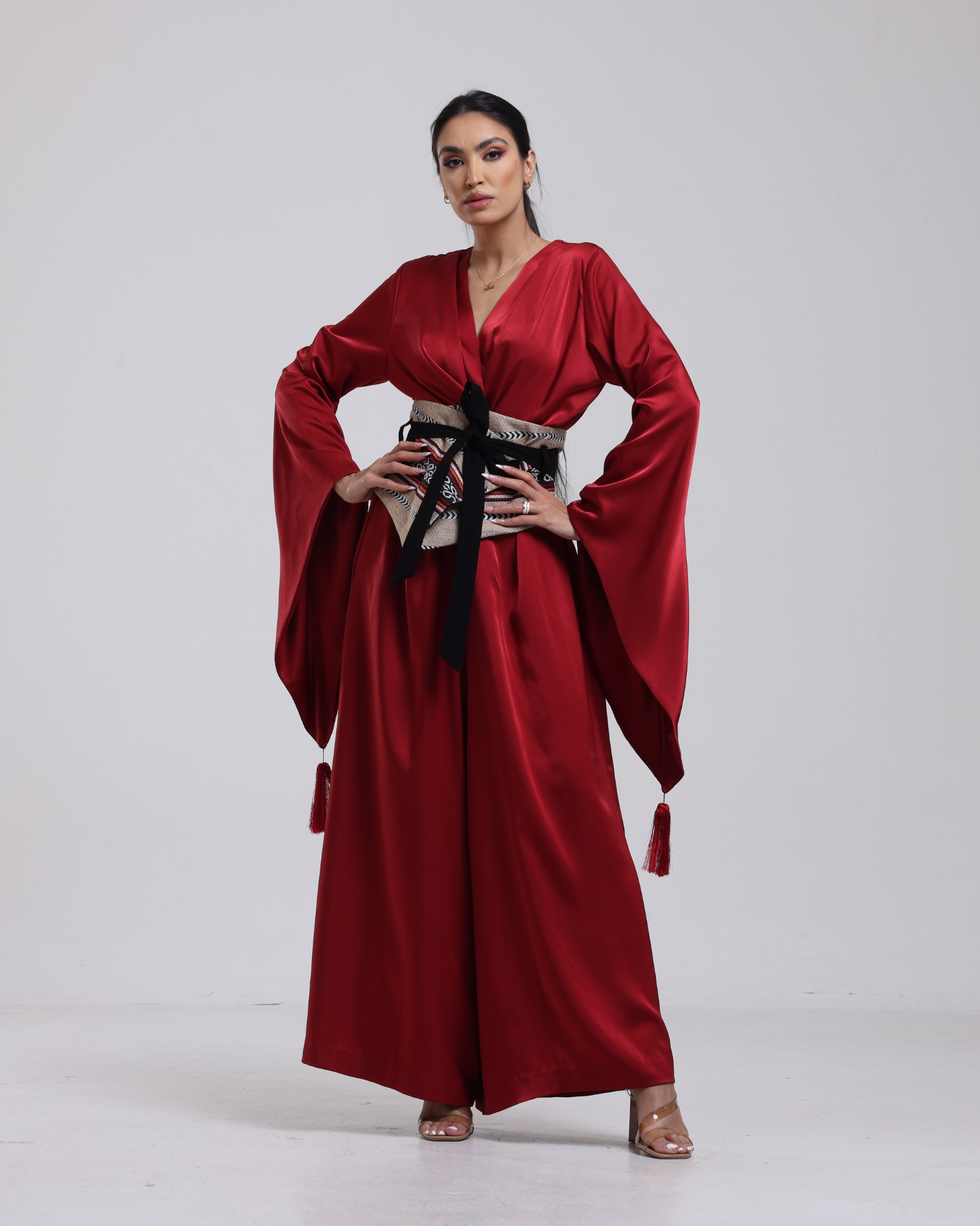 Wide-Leg jumpsuit featuring long, flared sleeves finished with tassel accents. Styled with a wide Sadu-patterned wrap belt, bringing contrast through its traditional woven detailing. The belt can be wrapped and tied in multiple ways to adjust the fit.