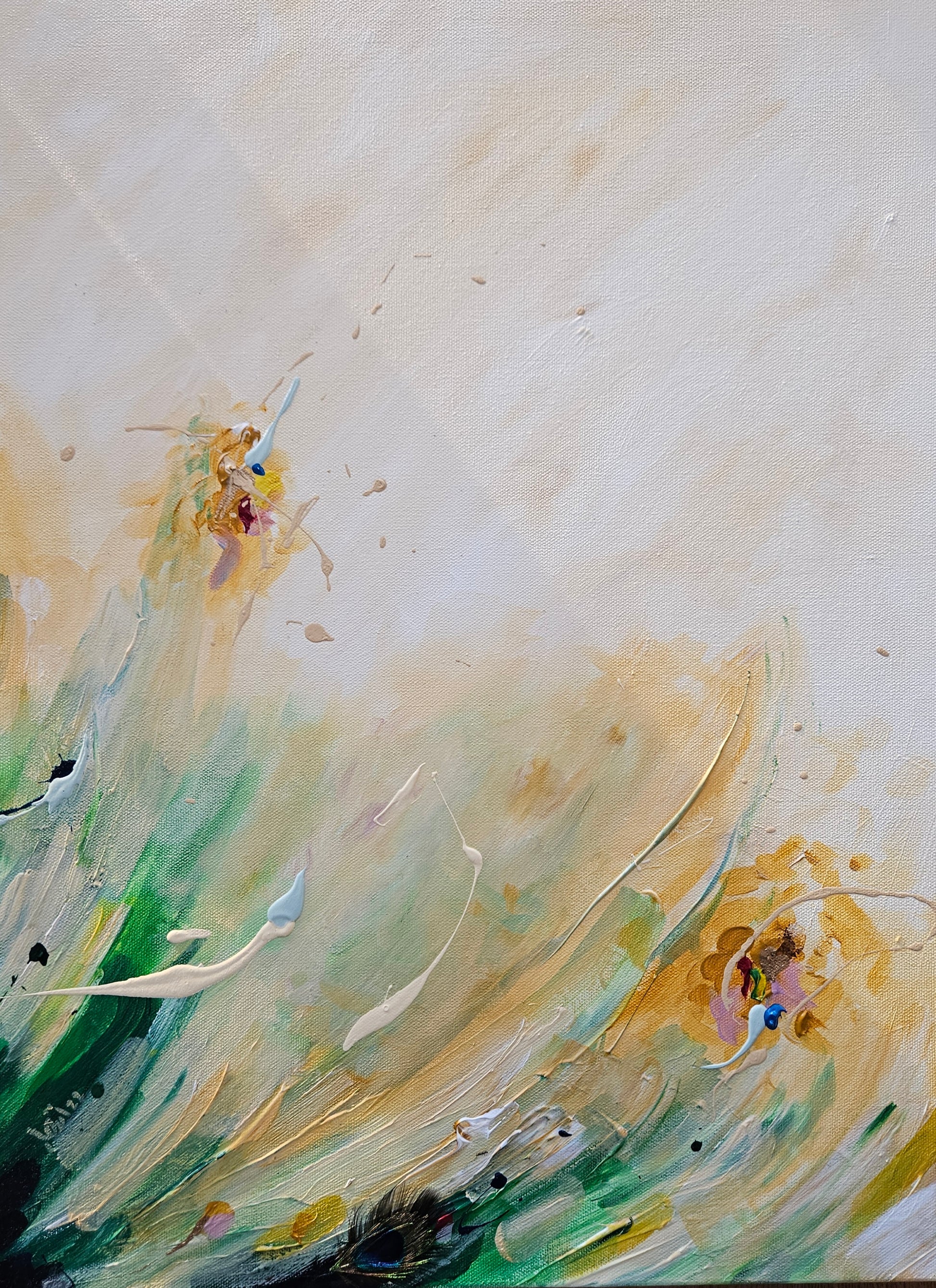 The pieces from the Harmony exhibition are what the artist refers to as an extension and a portal into her experience of bi-cultural harmony. The paintings are an aligned interplay between dynamism and stillness.