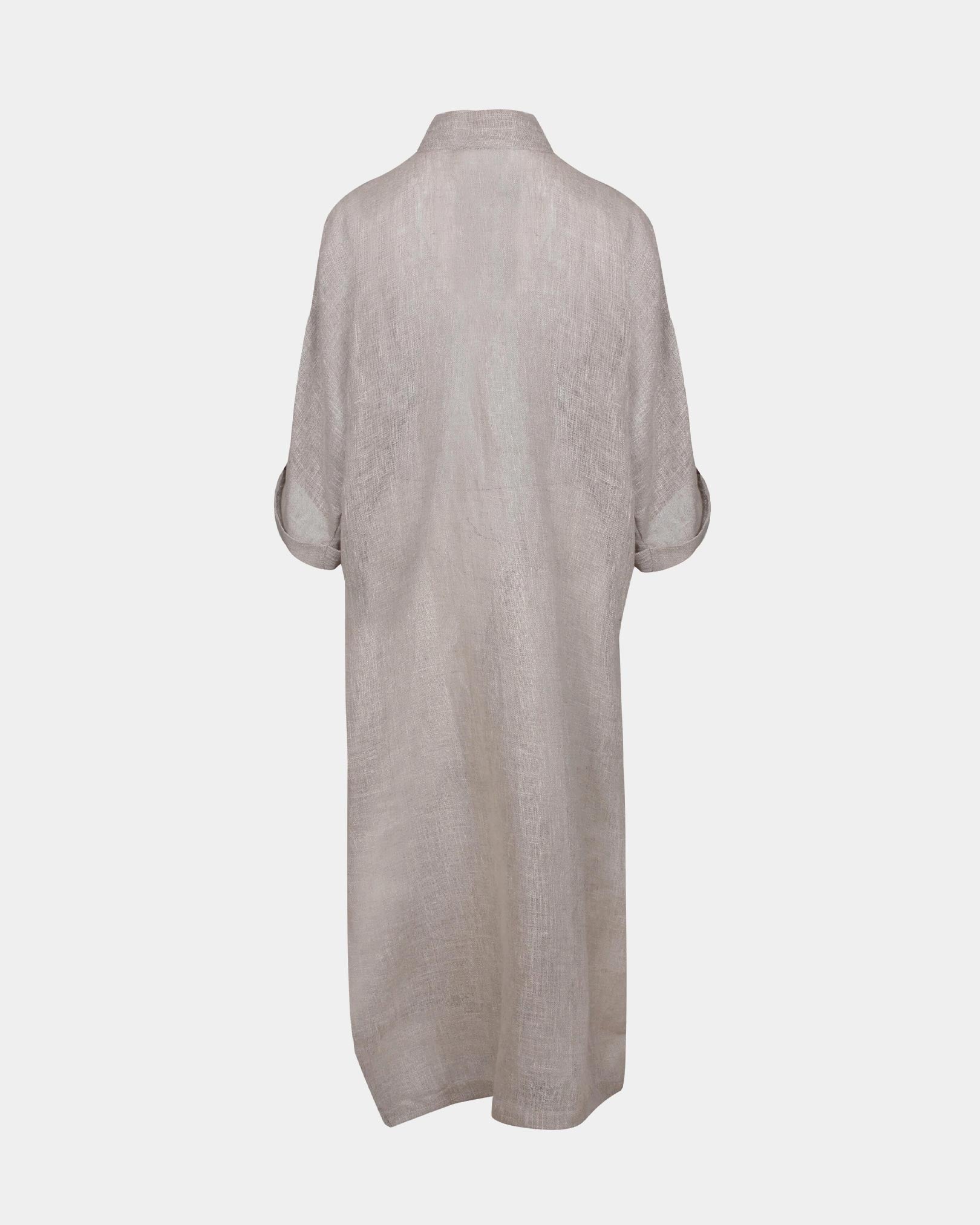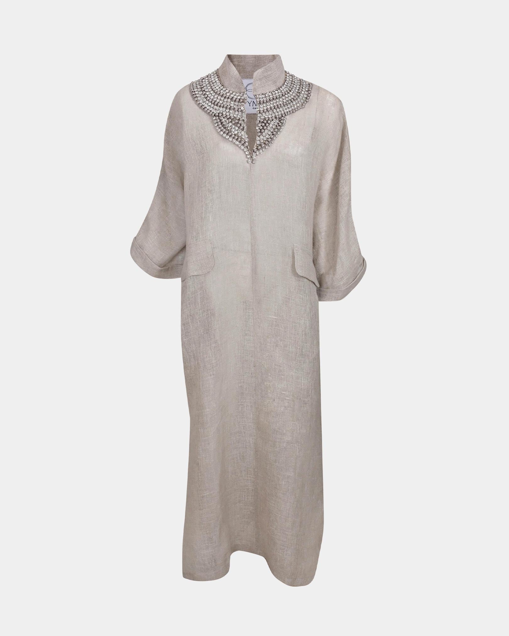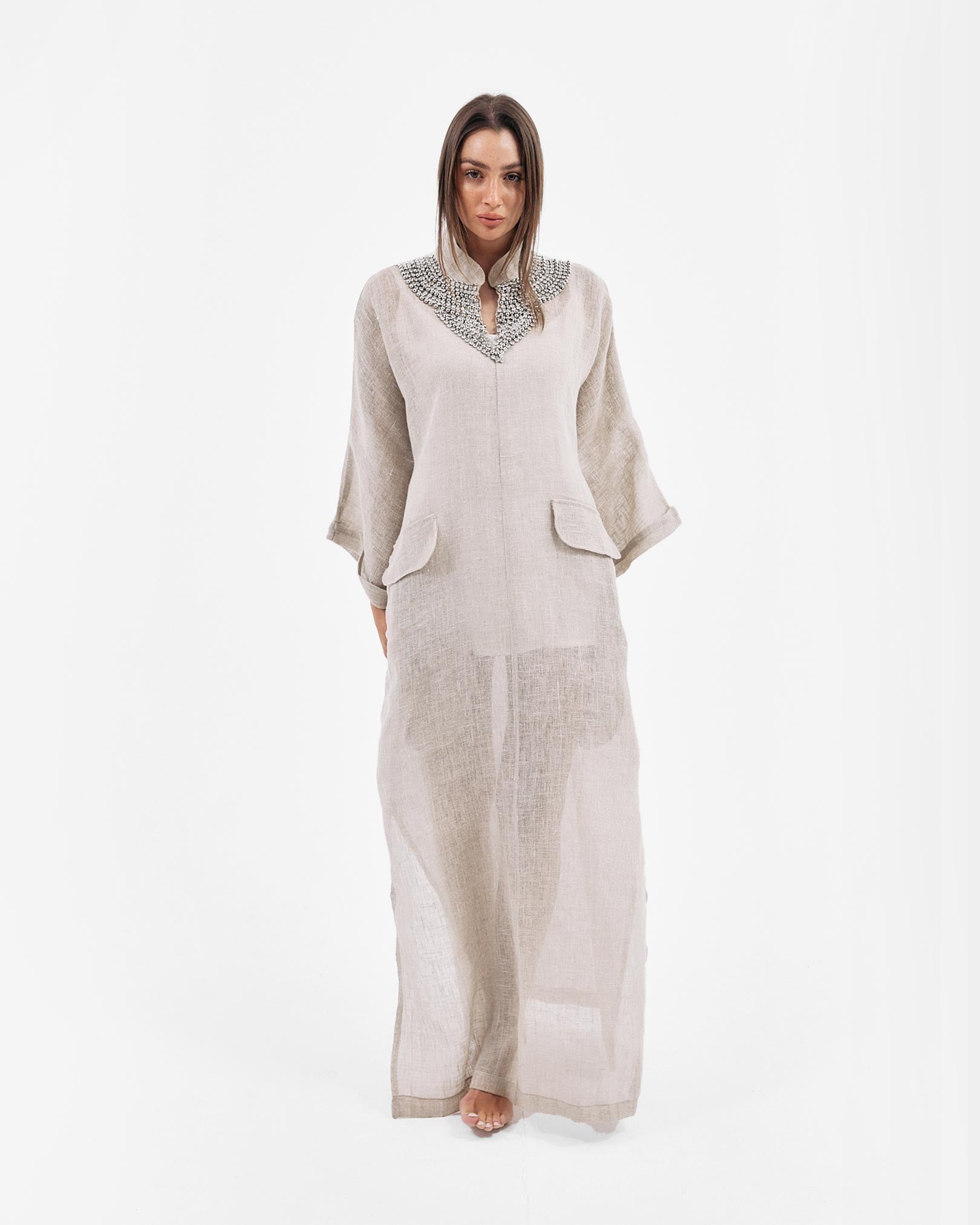 La Raffia Gioiello Kaftan crafted from Raffia in beige embodies a lose fit, half sleeves, maxi-length, collar and bold front pockets. Embellished by hand embroidered silver beading and clear rhinestones forming a jewel necklace.