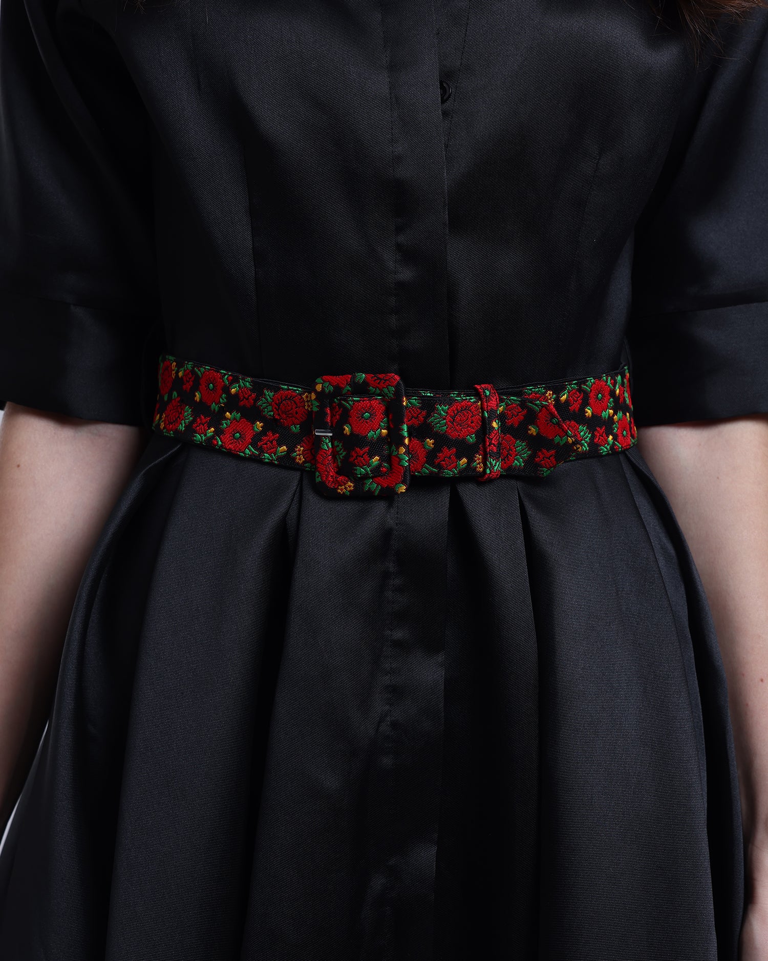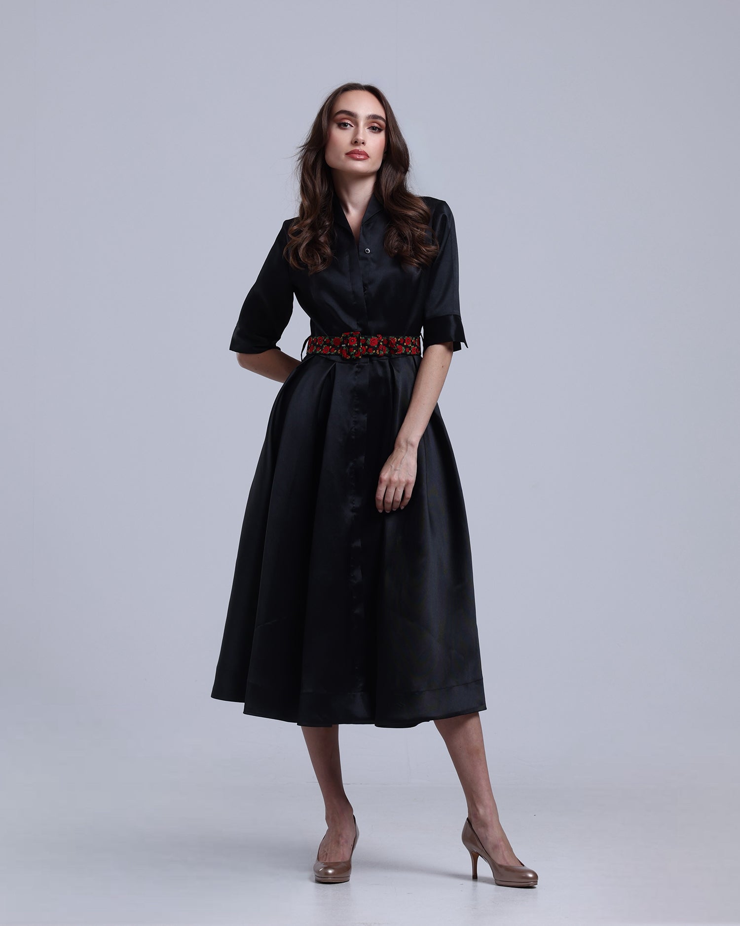 Black mikado satin midi dress, defined by a shalky-print belt accenting the waist.