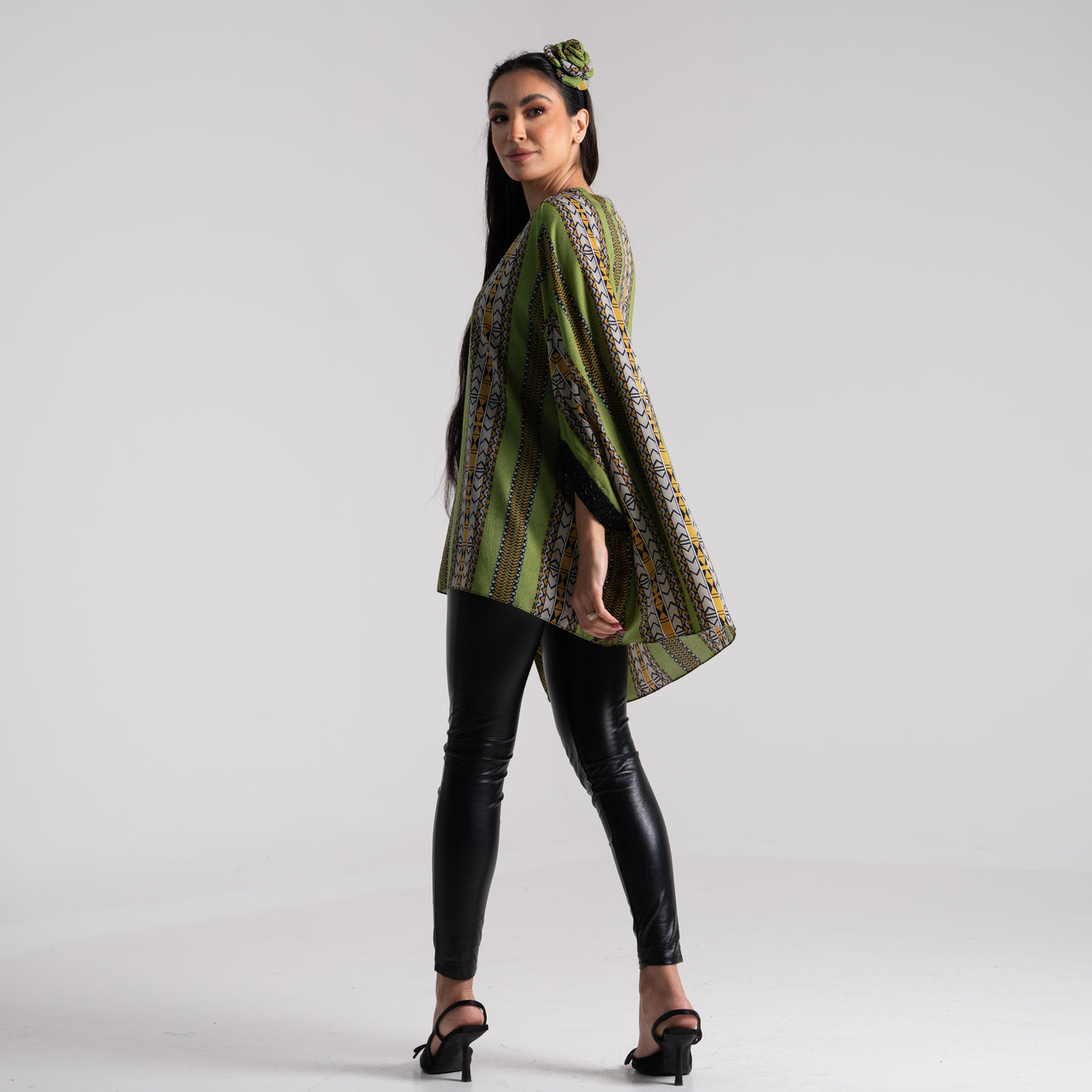 Batwing top featuring traditional Saudi sadu print in green. Finished with beaded embellishment along the sleeve hems.