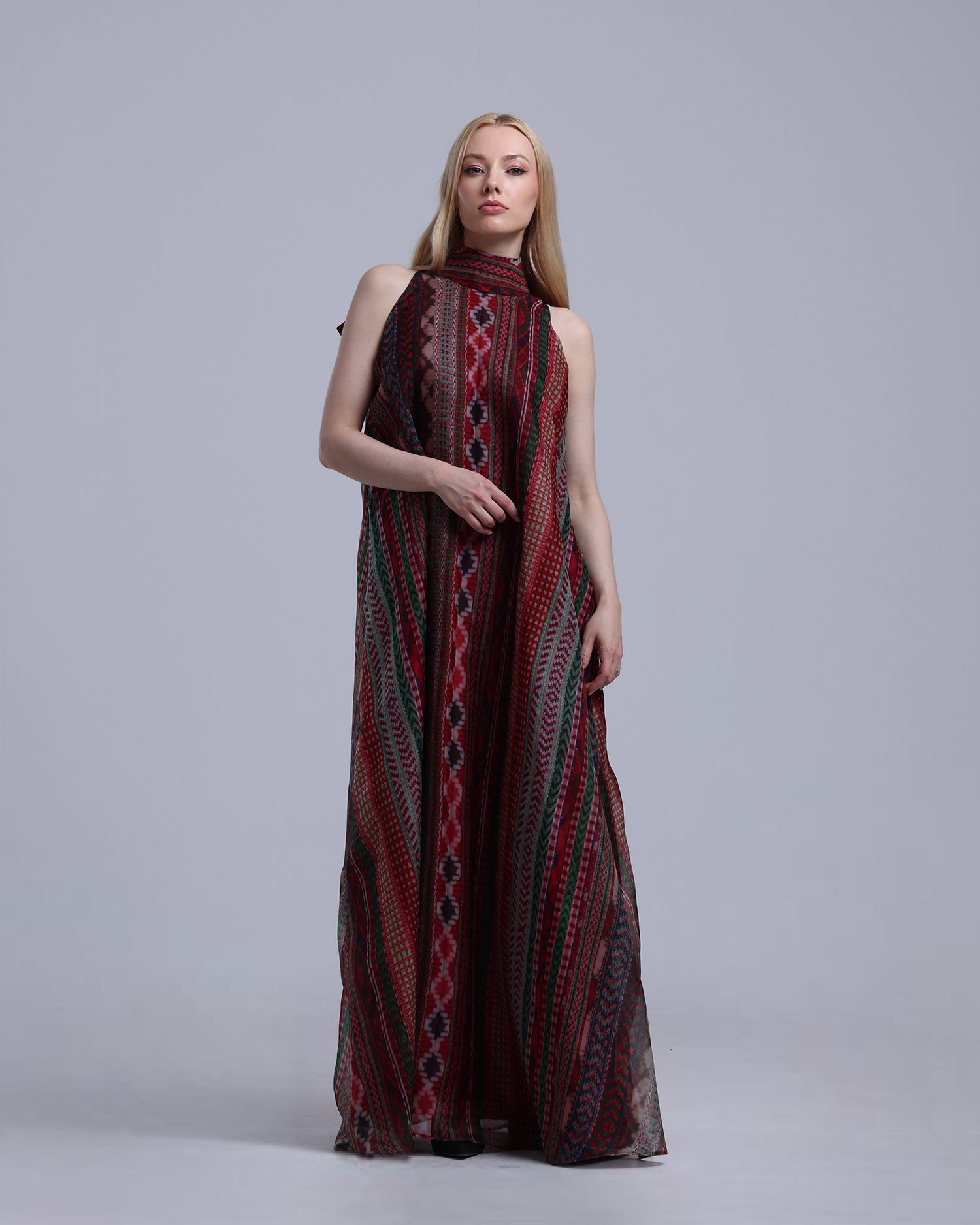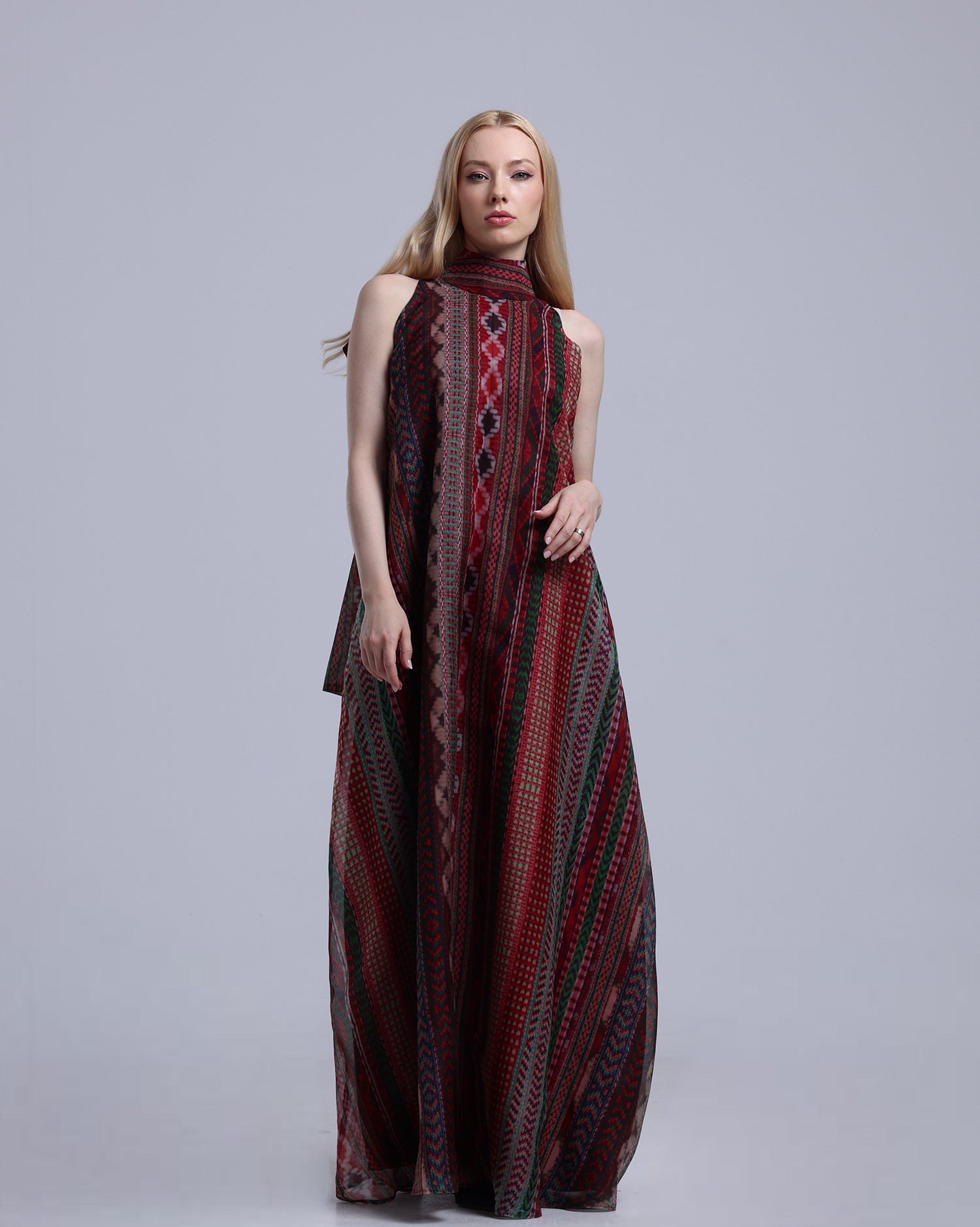 Organza maxi halter-neck maxi dress with a Sadu-inspired vibrant print. Finished with a large bow at the back of the neck and an A-line silhouette.