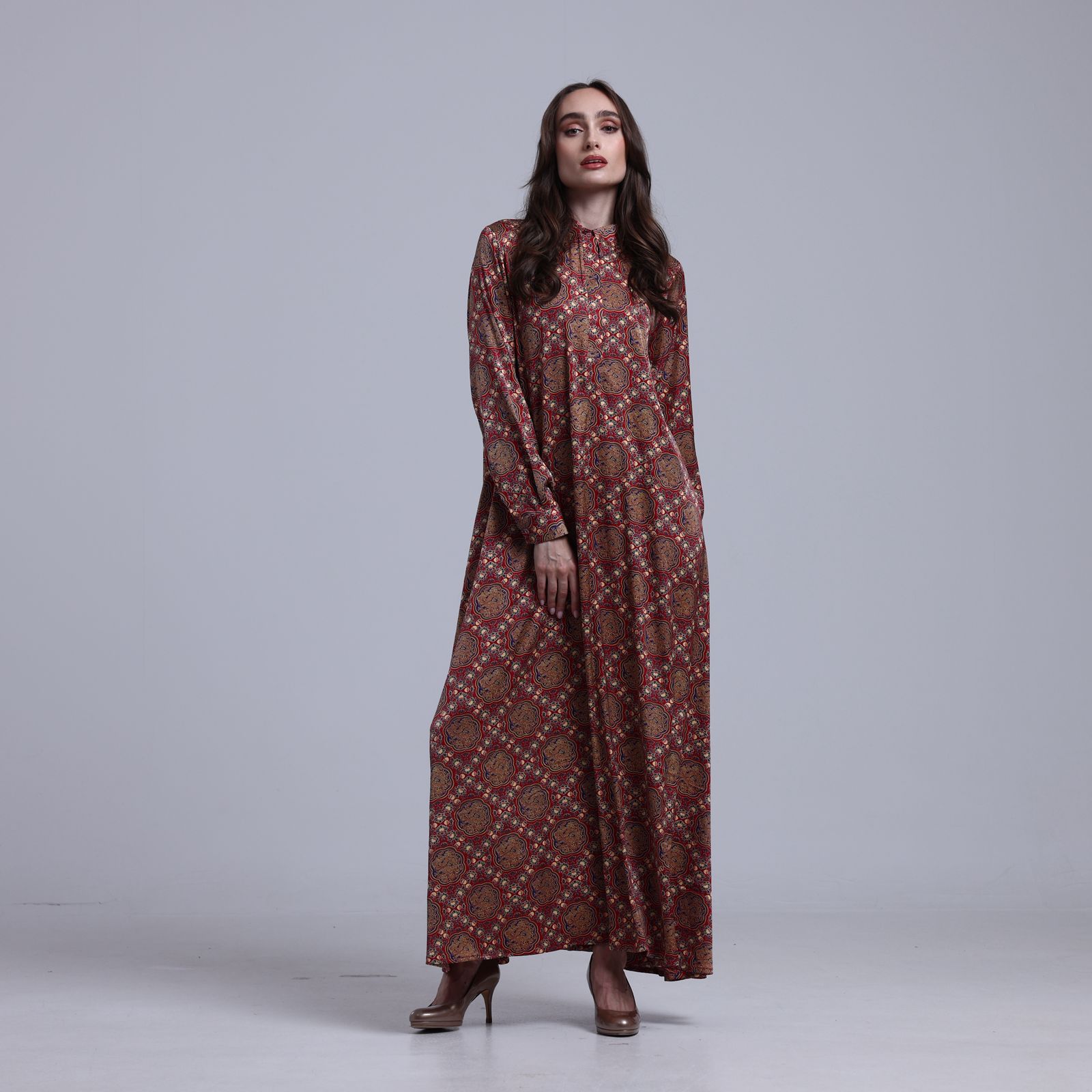 Collared satin maxi shirt dress with long sleeves, and an all-over ornamental medallion print.