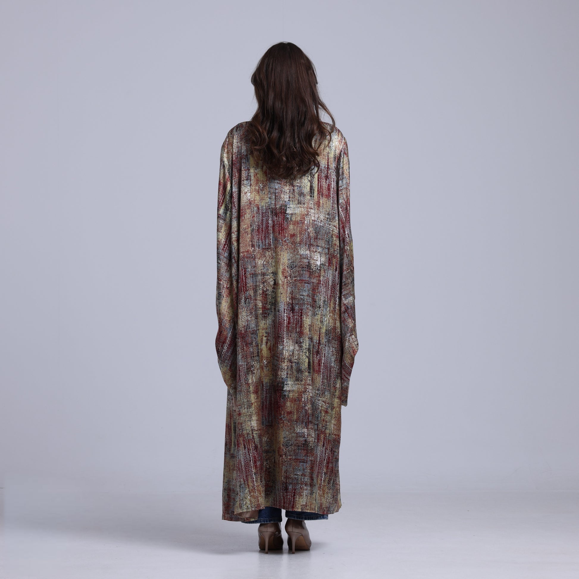 Printed maxi kimono featuring an all-over brushstroke print in earth tones and multi-colour, with a fluid drape. Cut in a longline silhouette with a relaxed form.