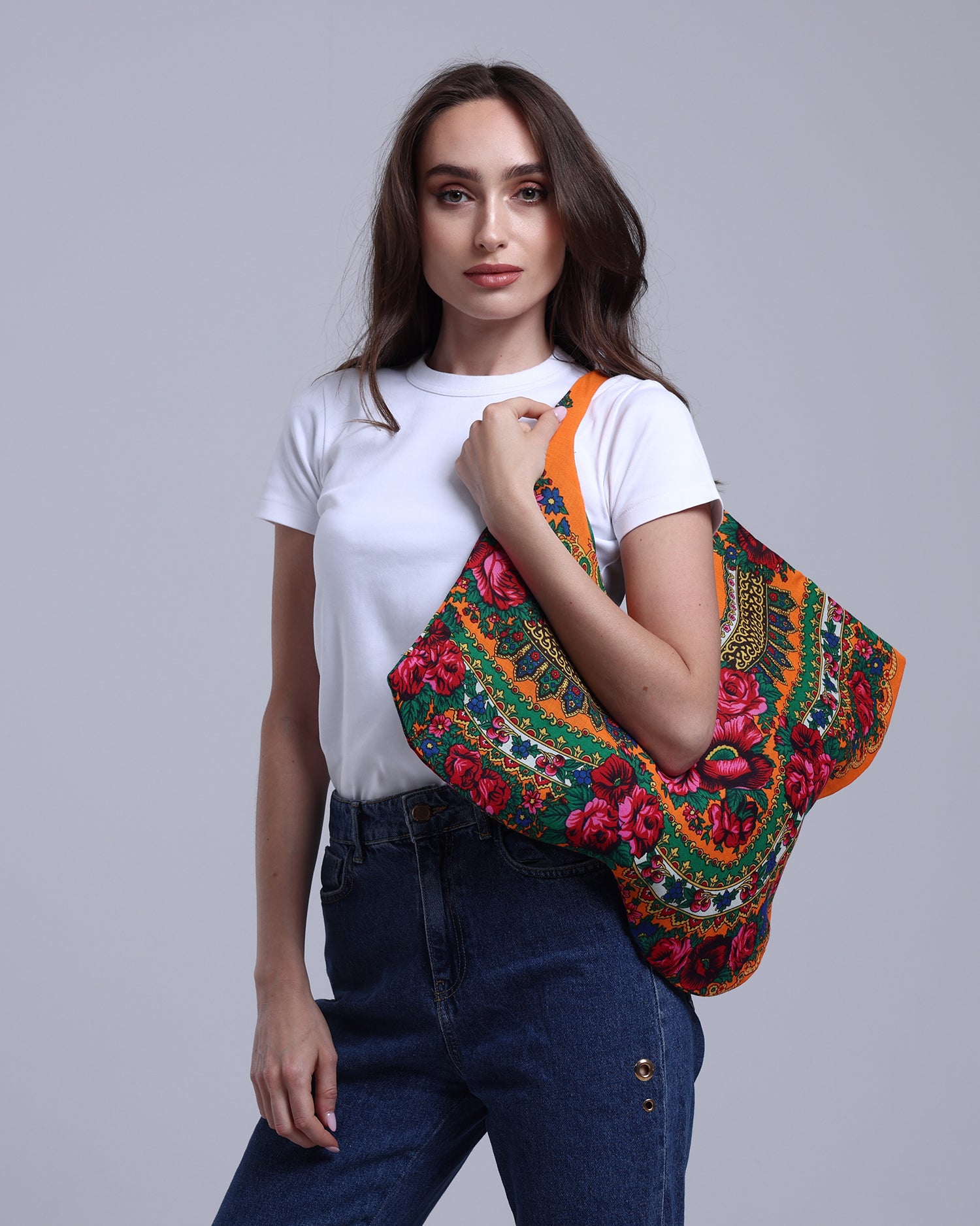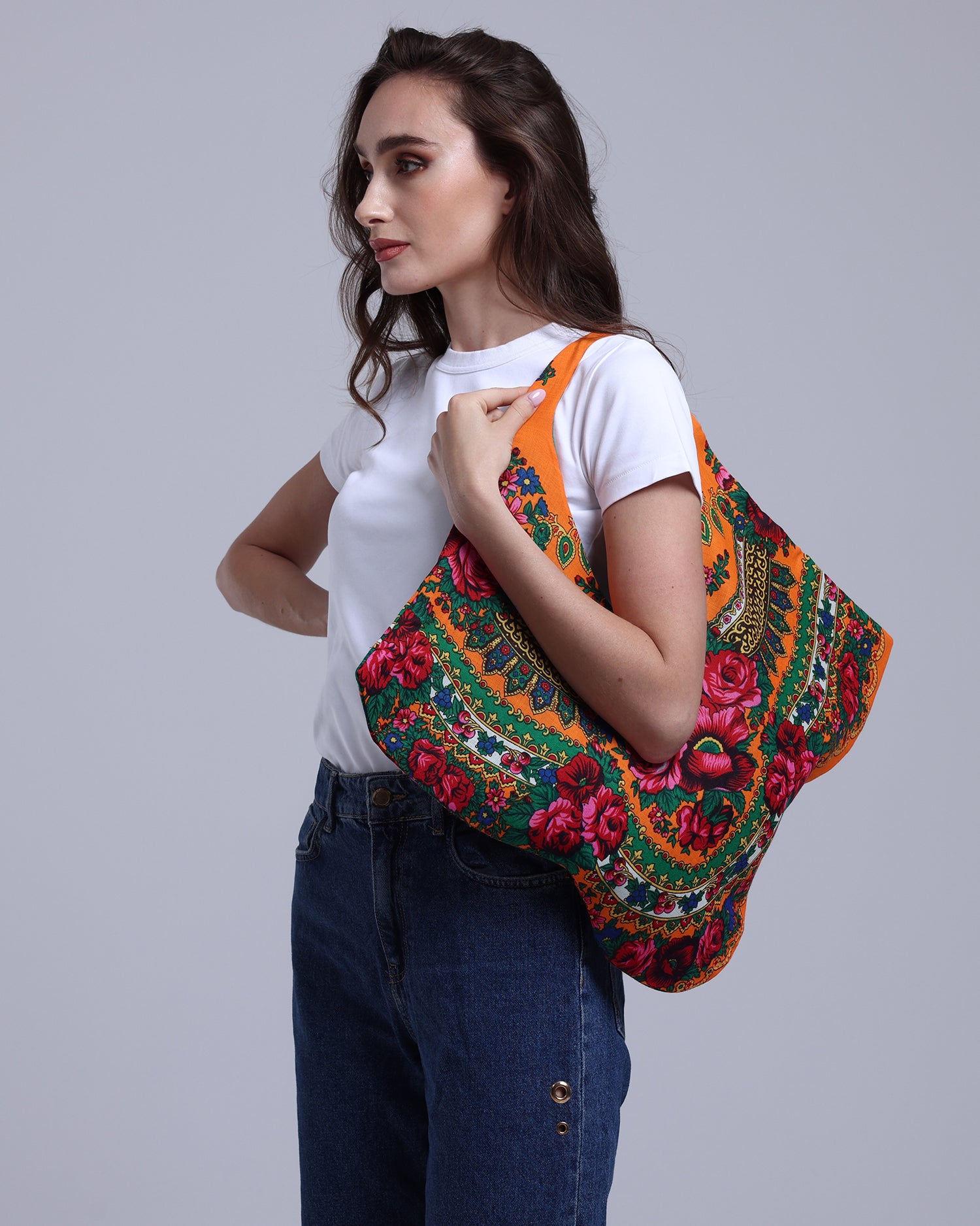 Tote bag featuring the traditional Saudi Shalky print, defined by bold colours and decorative patterning.