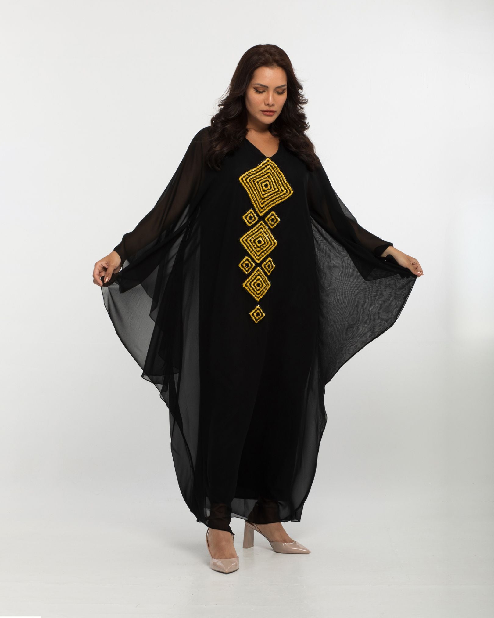 Black silk chiffon batwing kaftan. The front is adorned with handmade crochet crafted from silk thread and finished with sequin embelishment. Fully lined.