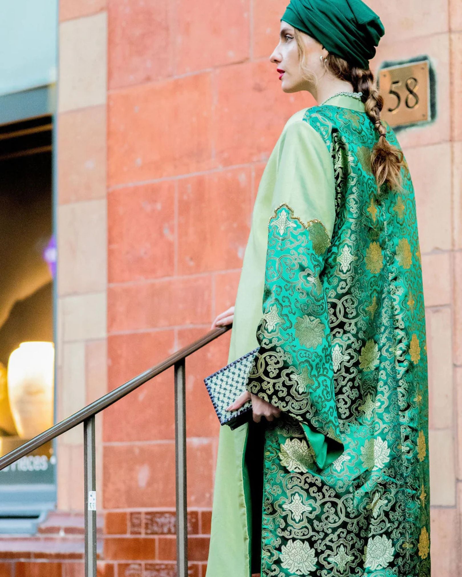 Kimono-style coat crafted in green silk shantung, designed with an open front and wide sleeves. Detailed with tonal embroidered panels and subtle sequin accents.