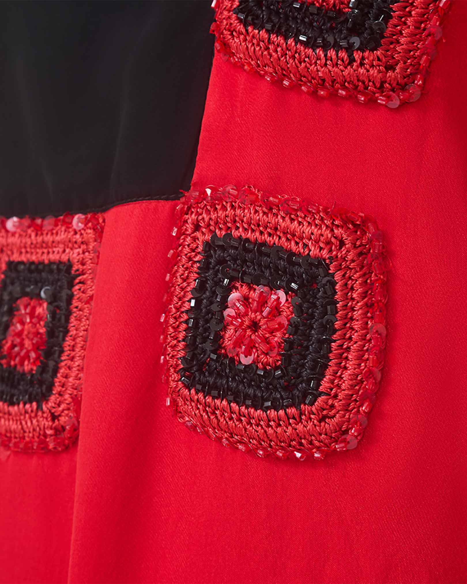 Red silk chiffon batwing kaftan featuring handmade silk-thread crochet detailing along the square neckline. Fully lined.