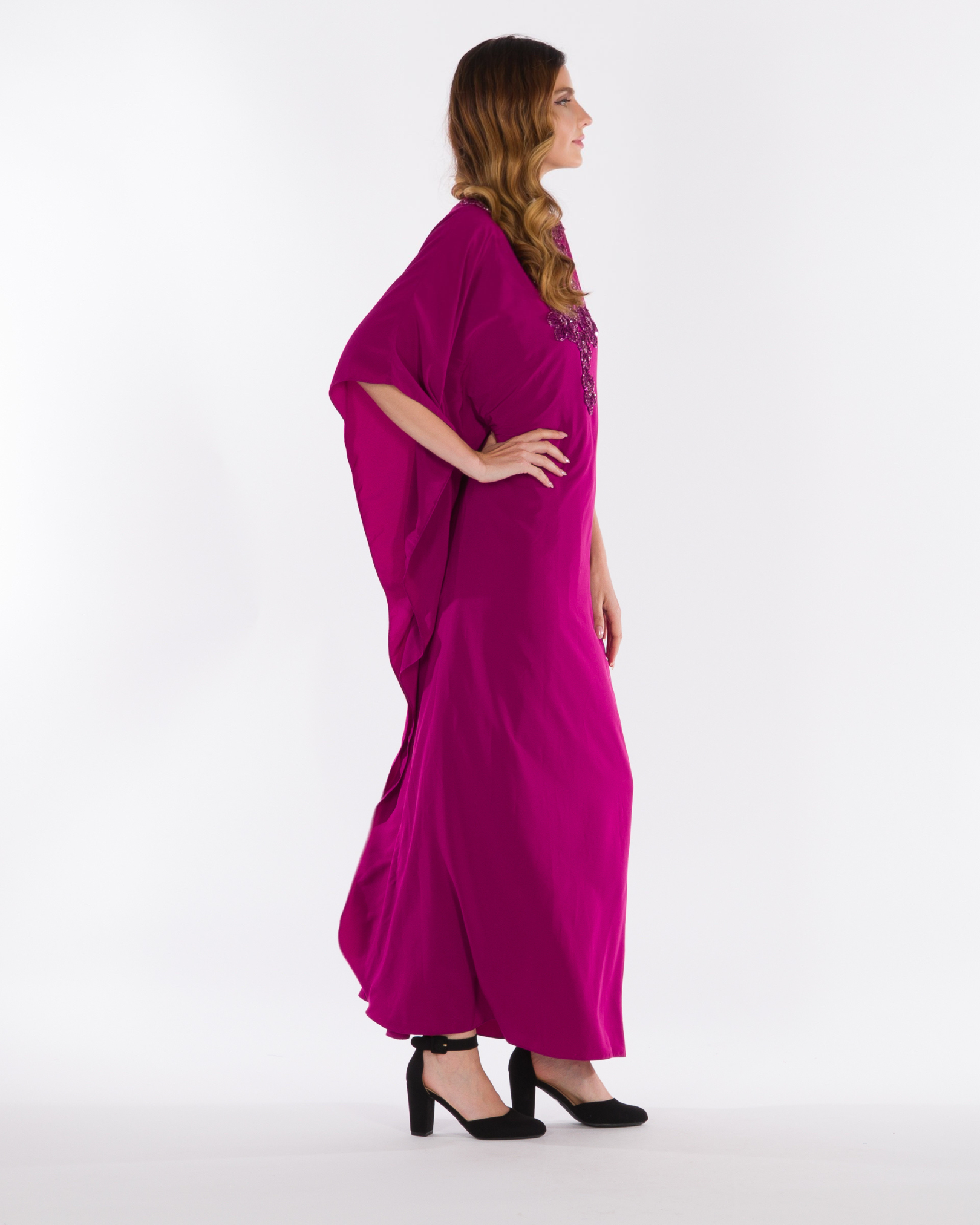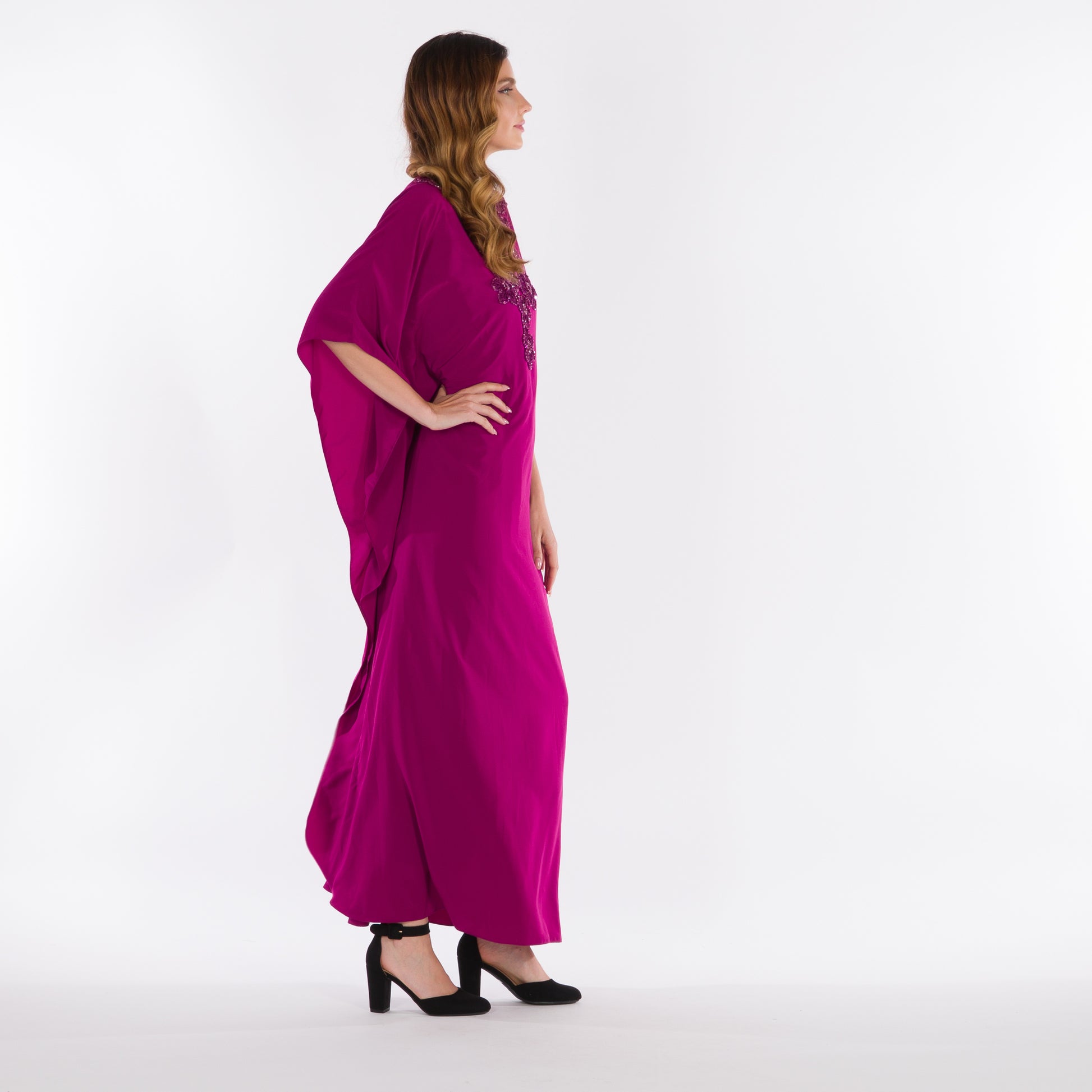 Magenta silk crepe batwing kaftan, adorned with handmade silk thread crochet detailing, finished with delicate sequin accents.