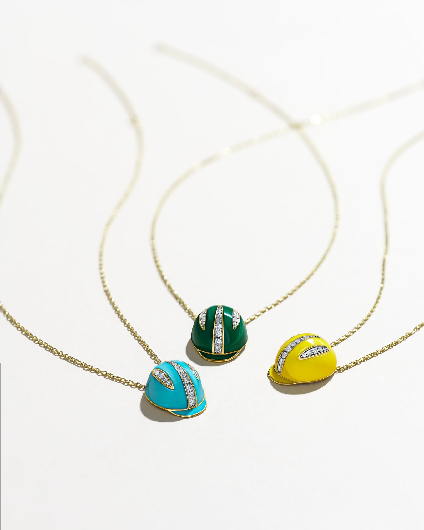 Yellow 18-karat gold hard hat necklace with green enamel and white diamonds.