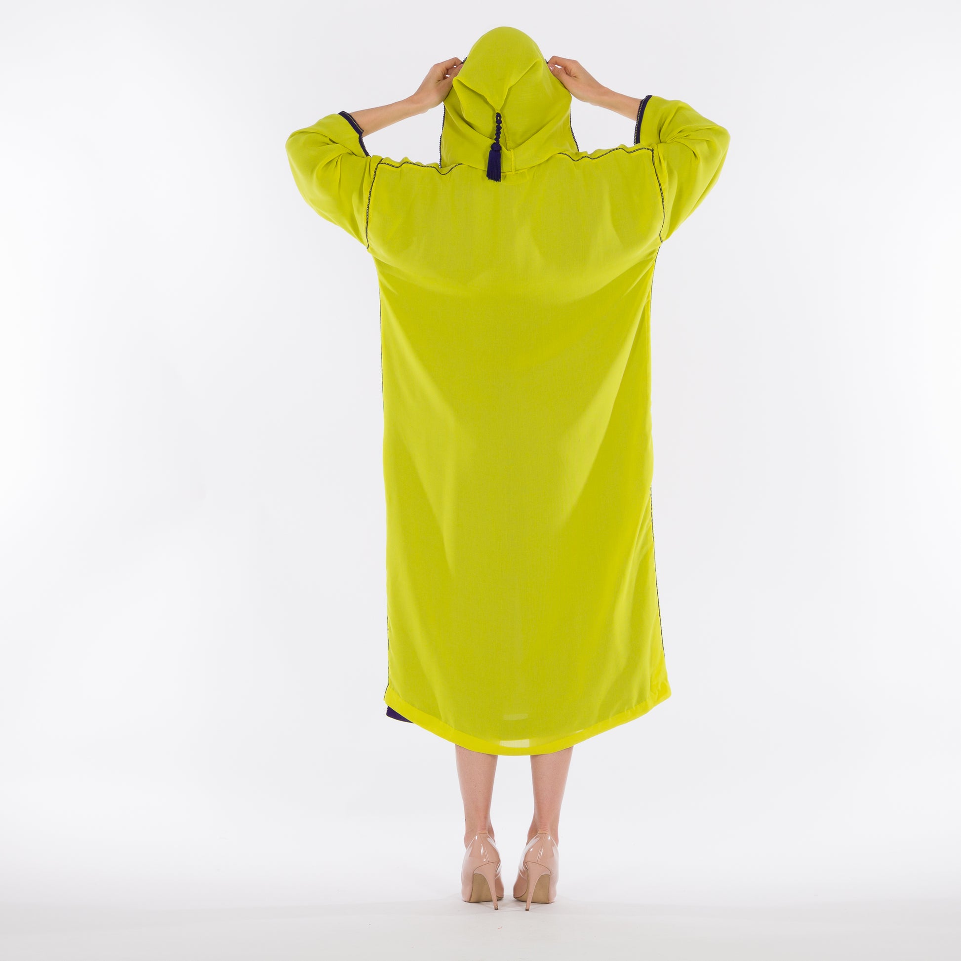Two-piece Moroccan yellow, sheer, hooded kaftan with contrast purple dress. The kaftan is adorned with handmade sfifa embroidery.