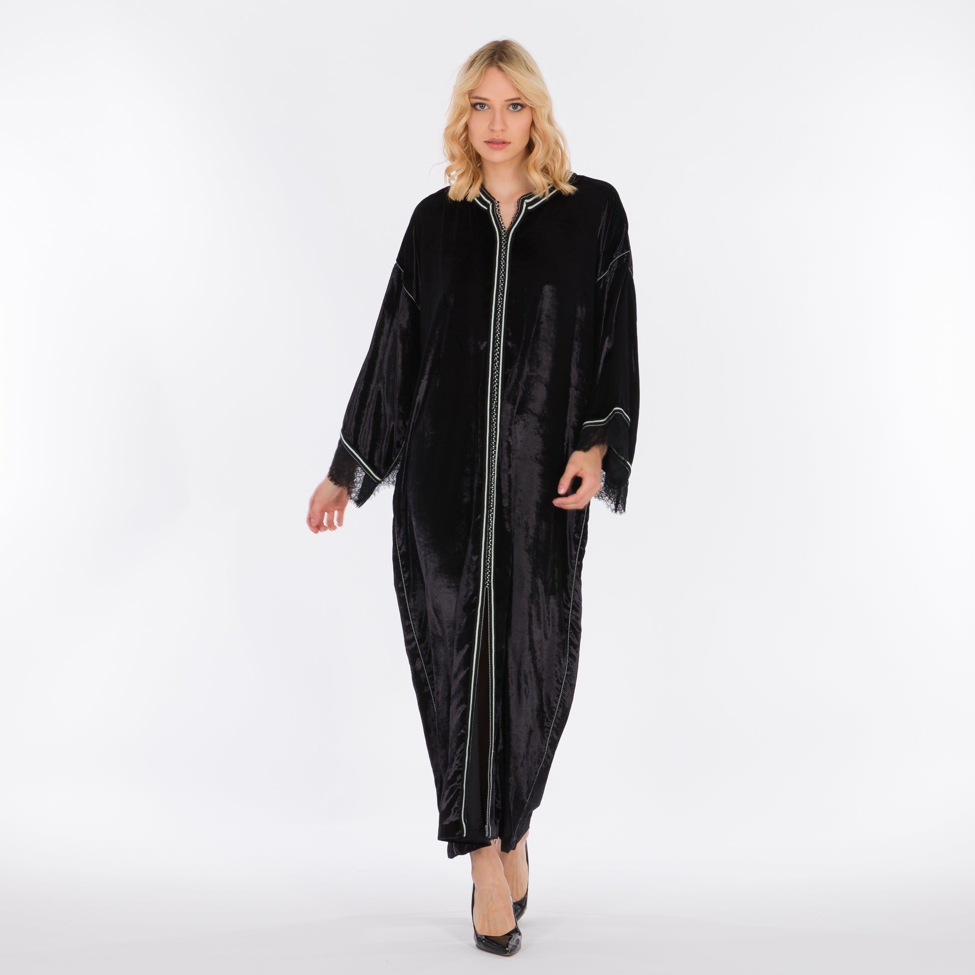 Black Moroccan kaftan featuring handmade sfifa embroidery and lace trimming on the sleeves.