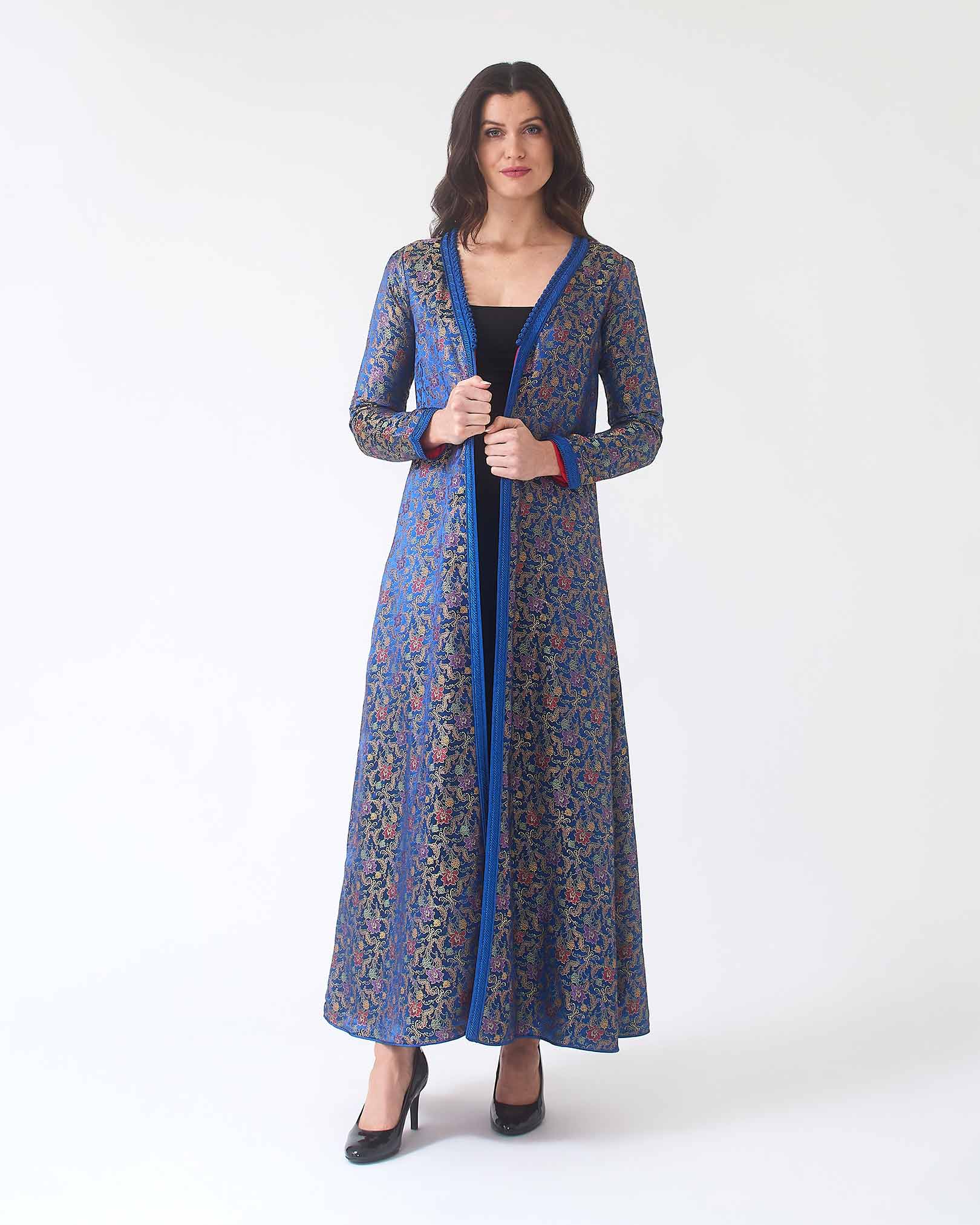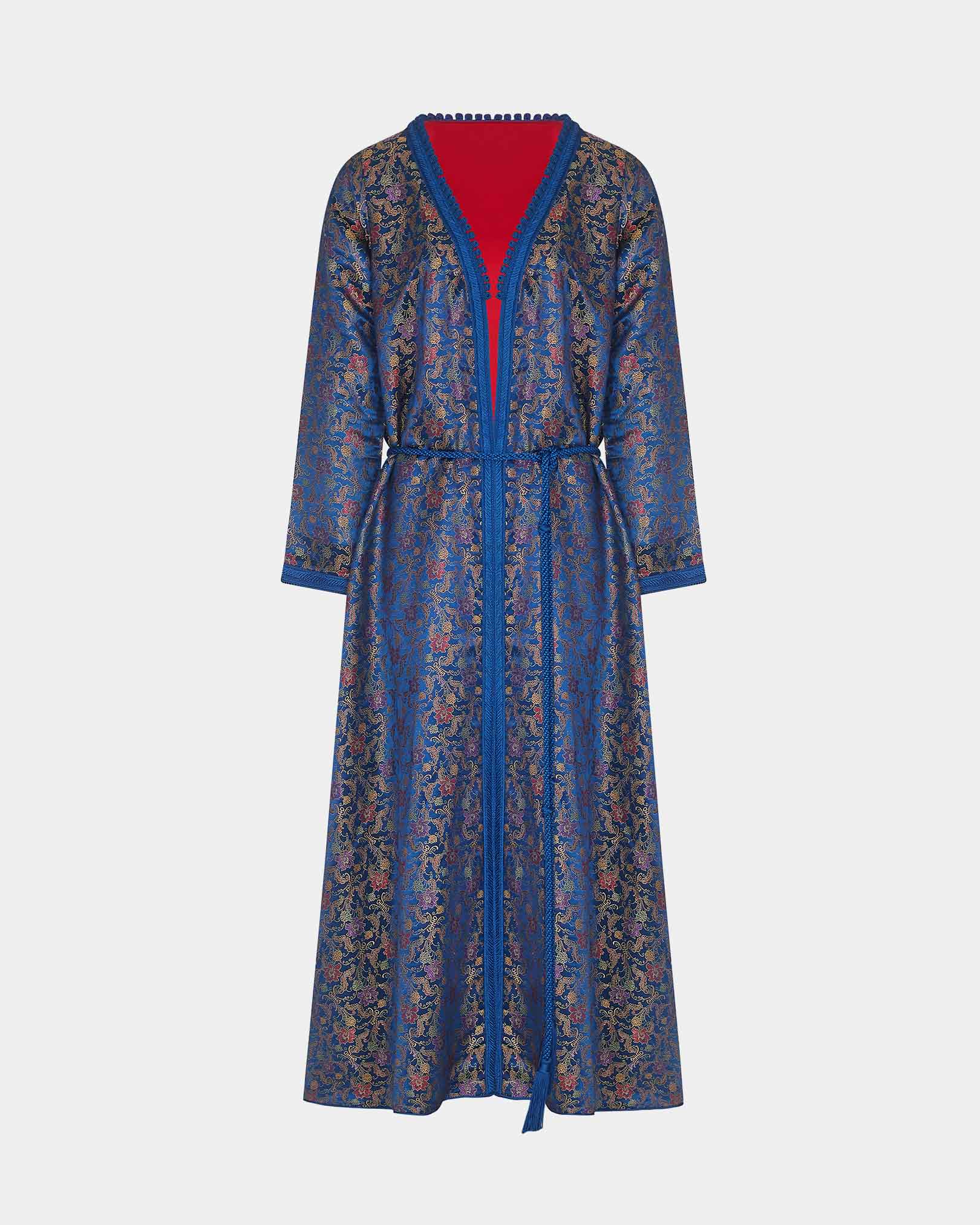 Jacquard kimono designed in a longline silhouette with an all over floral design. Styled with a V-neckline and long sleeves, and finished with a matching rope-style belt. Detailed with traditional Moroccan handmade trimming along the neckline, front opening, and cuffs.