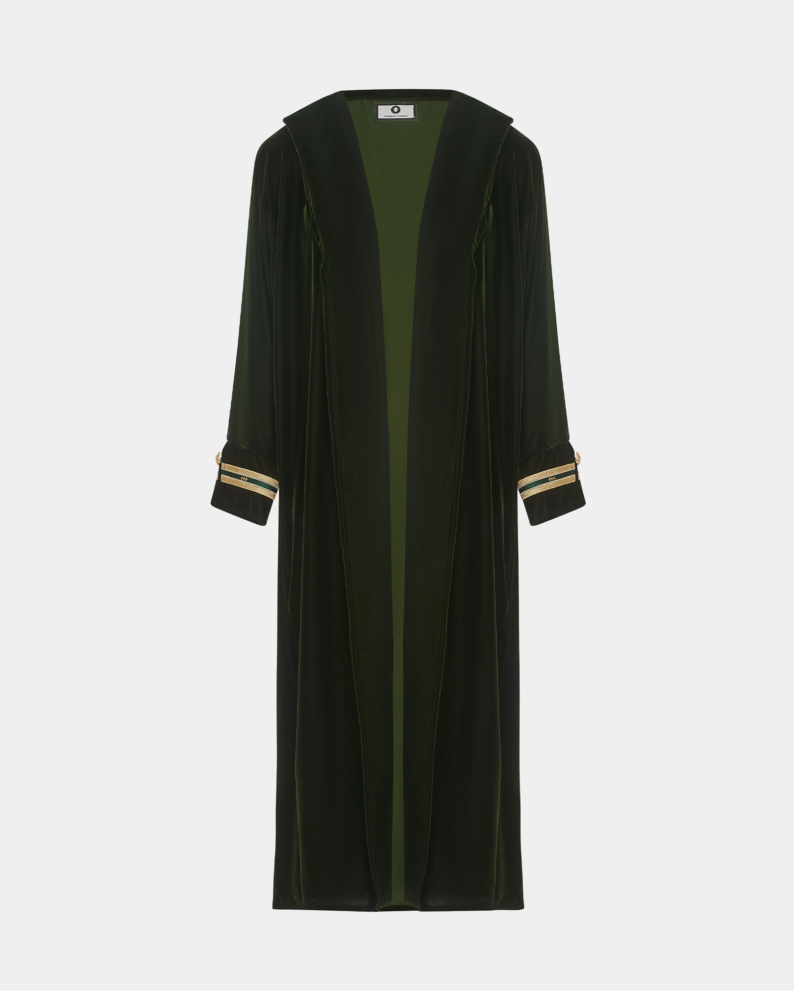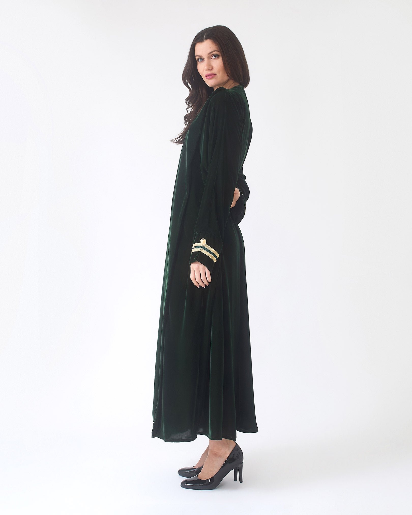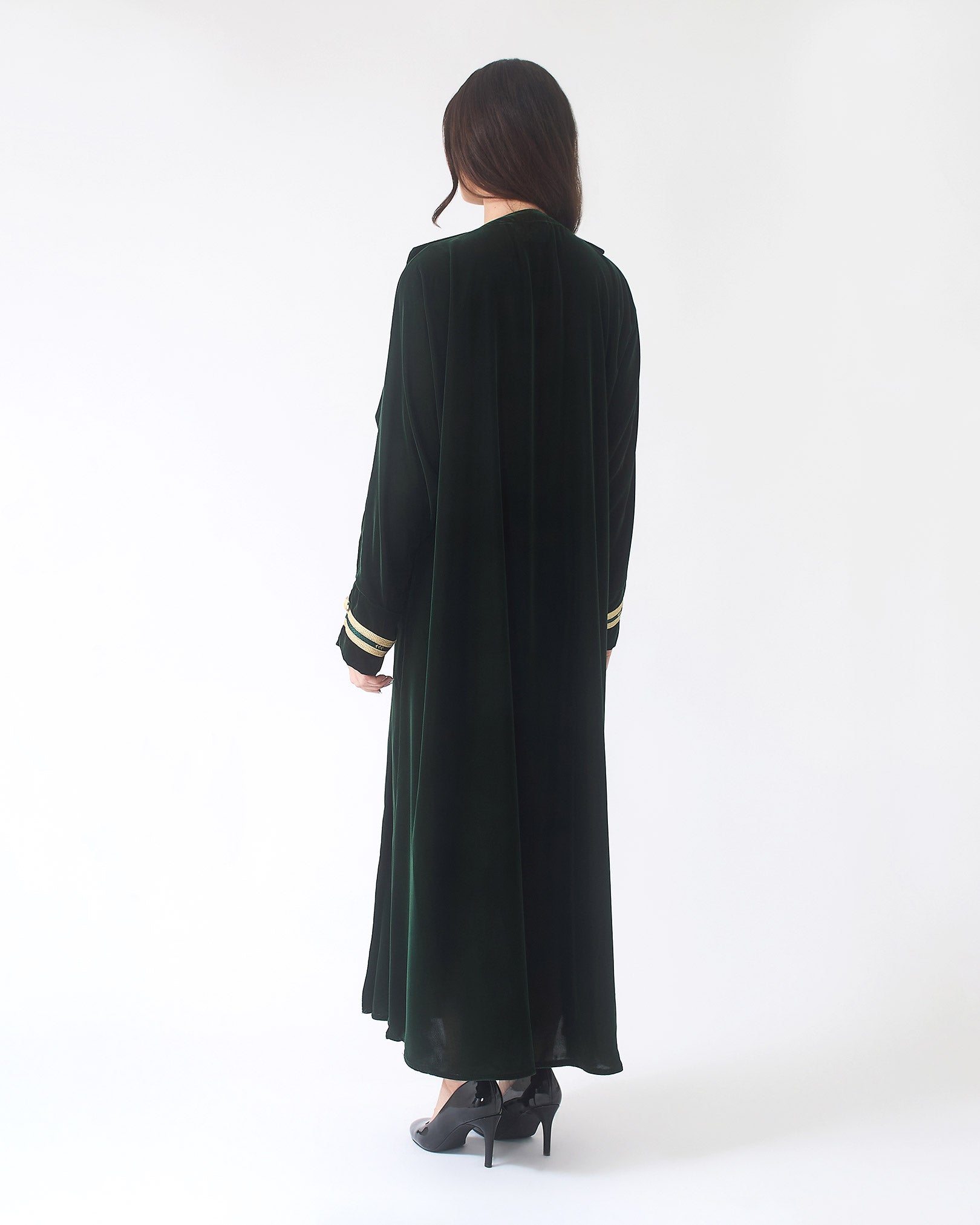 Dark green velvet toutch abaya detailed with embroidered sleeve edges. Designed in a long, straight silhoutte.