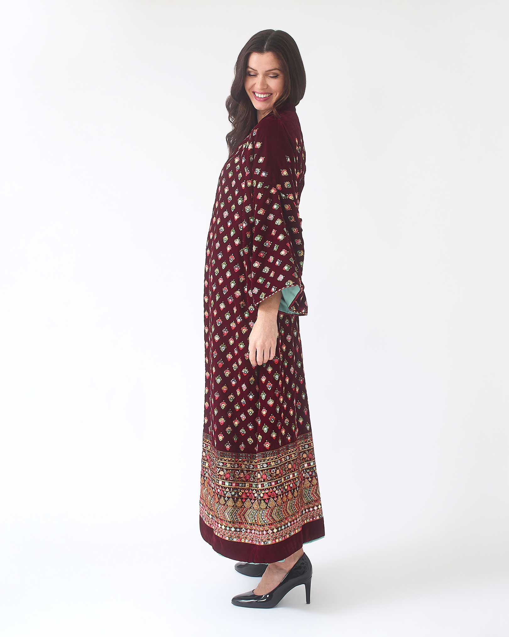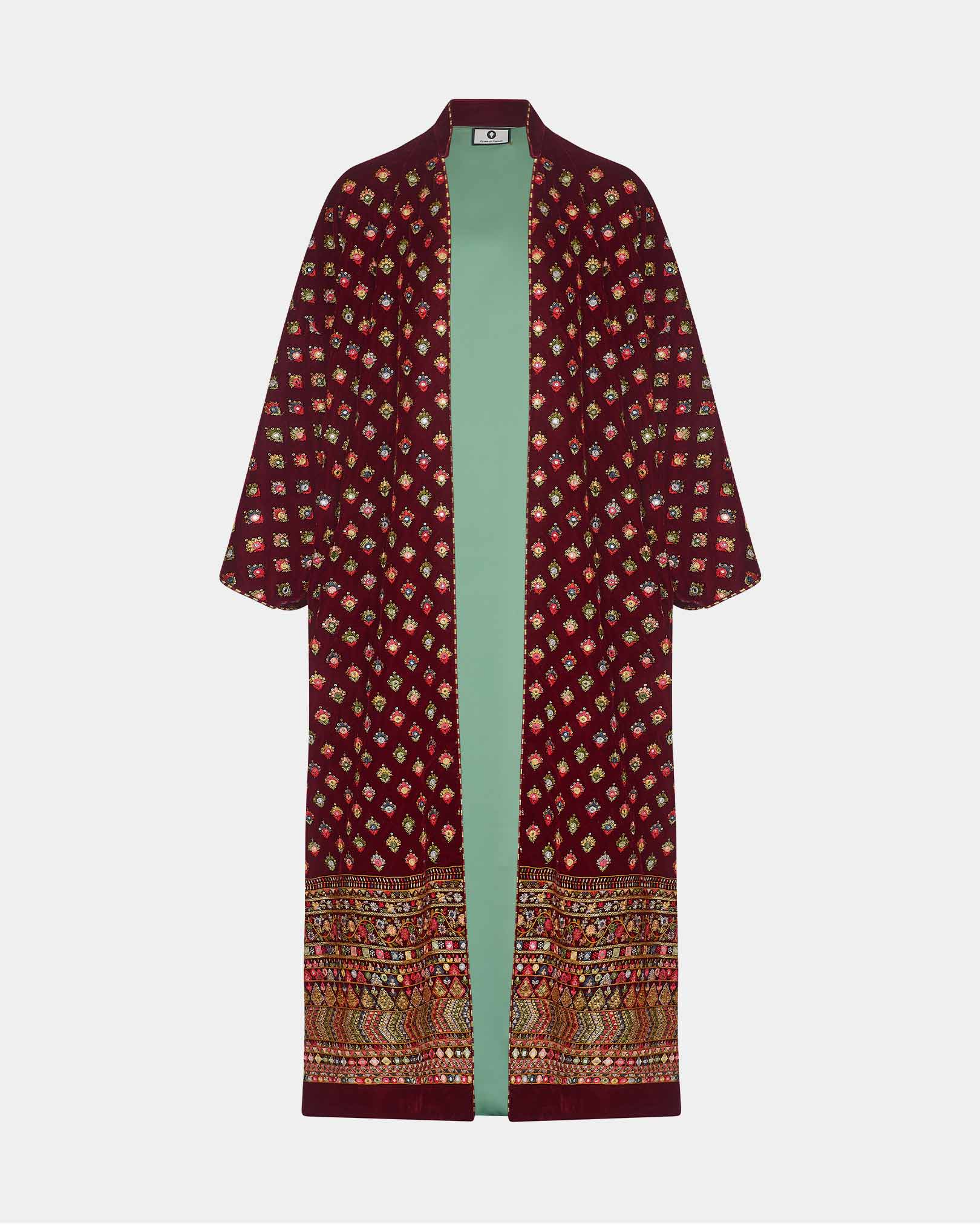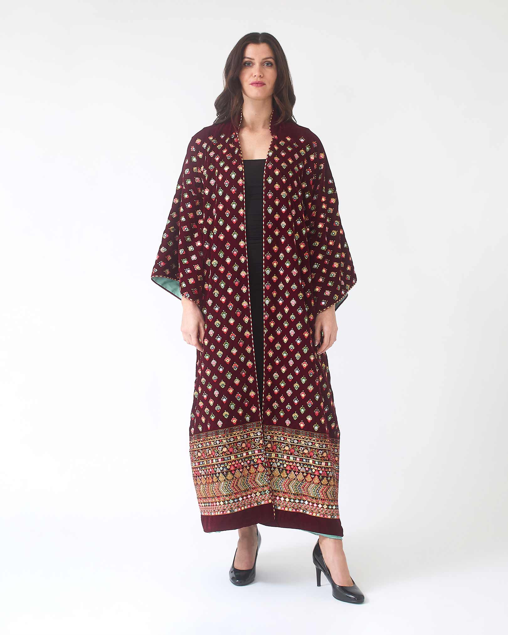 Burgundy abaya richly embroidered in multicoloured motifs and finished with a contrast aqua lining. Designed with a relaxed open silhouette and wide sleeves.