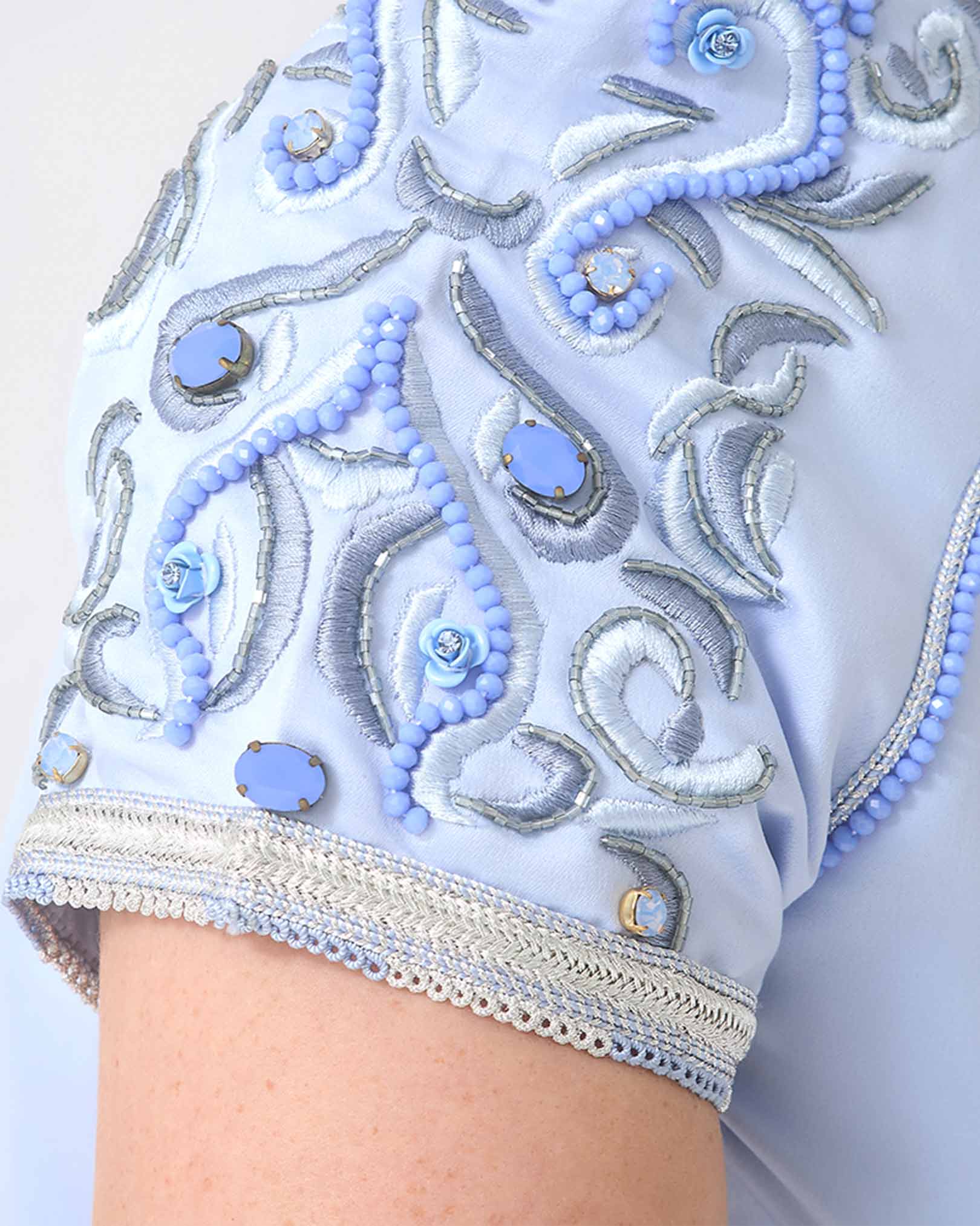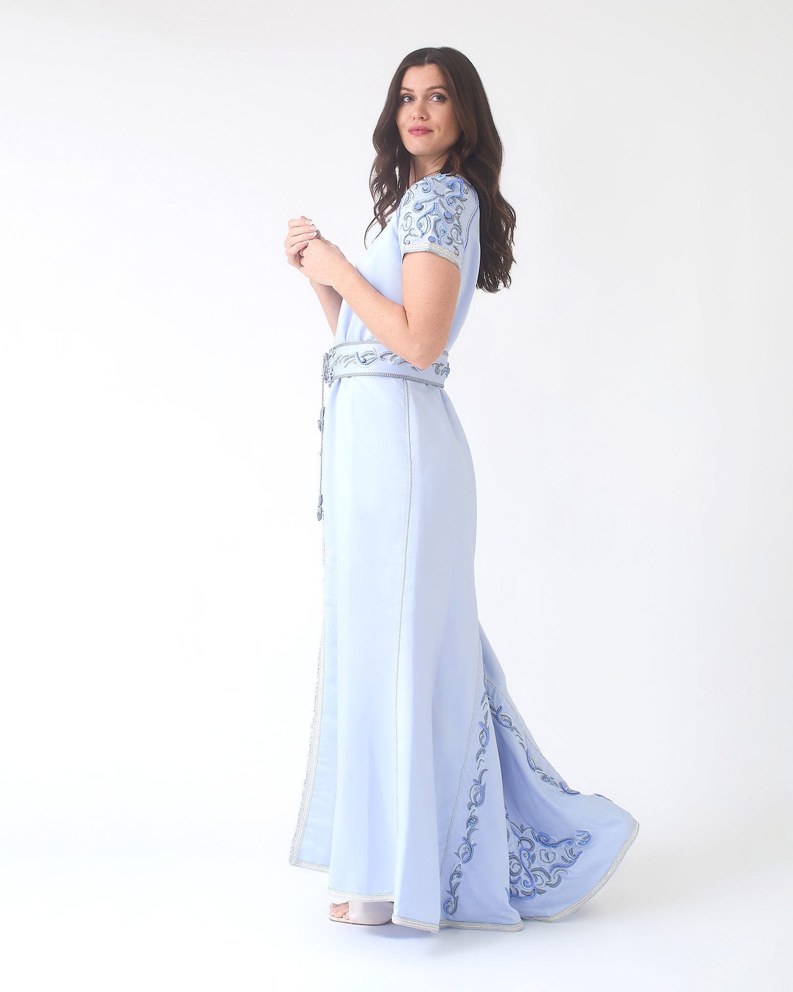 Light blue Moroccan kaftan featuring intricate hand-embroidery along the sleeves, front panel, train, and belt. Designed with a traditional handmade Moroccan belt and finished with a graceful embroidered back train.