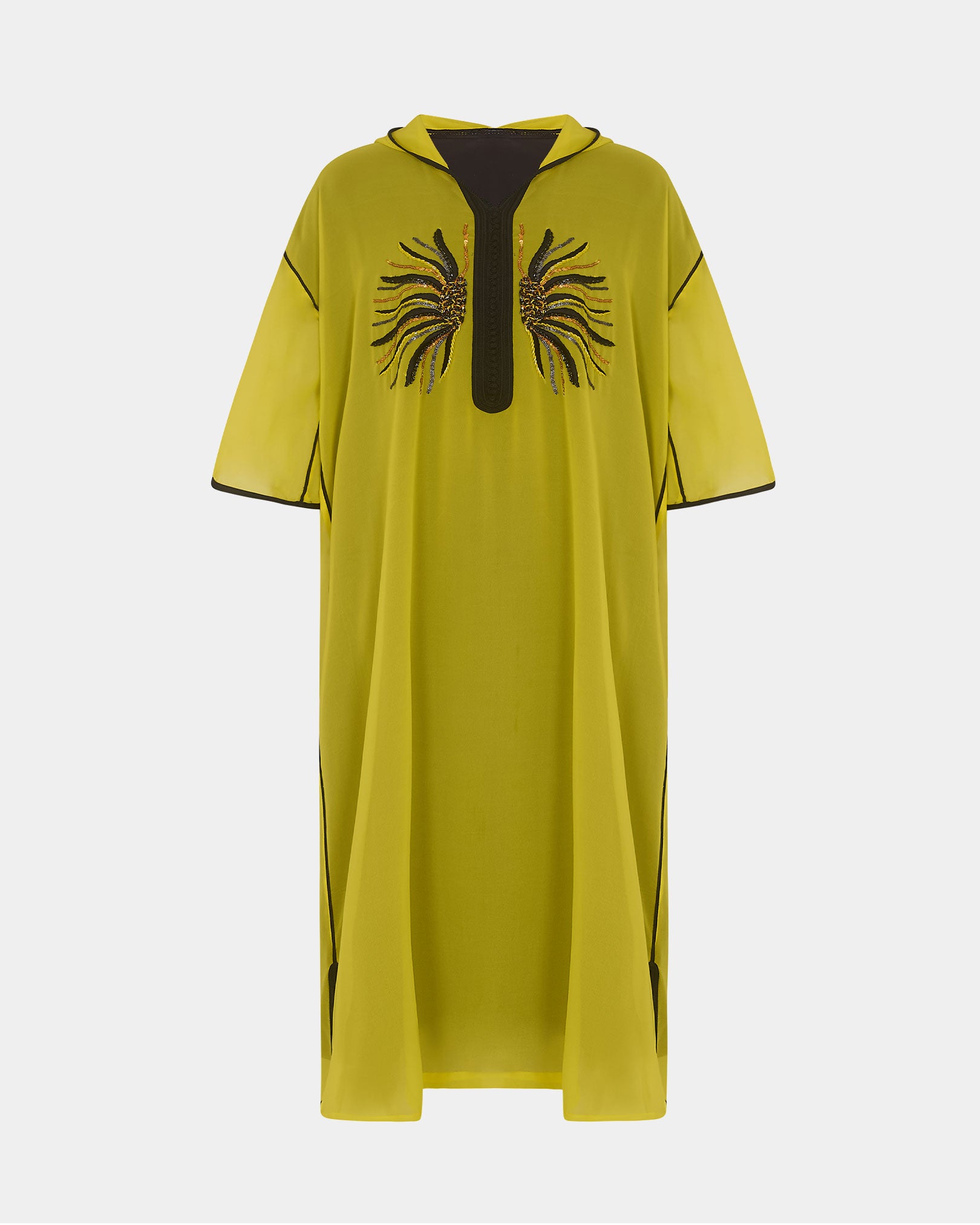 Sheer Moroccan kaftan in a vibrant yellow tone featuring a hood, wide sleeves, and hand-embellished embroidery. Finished with black contrast handmade trimming.