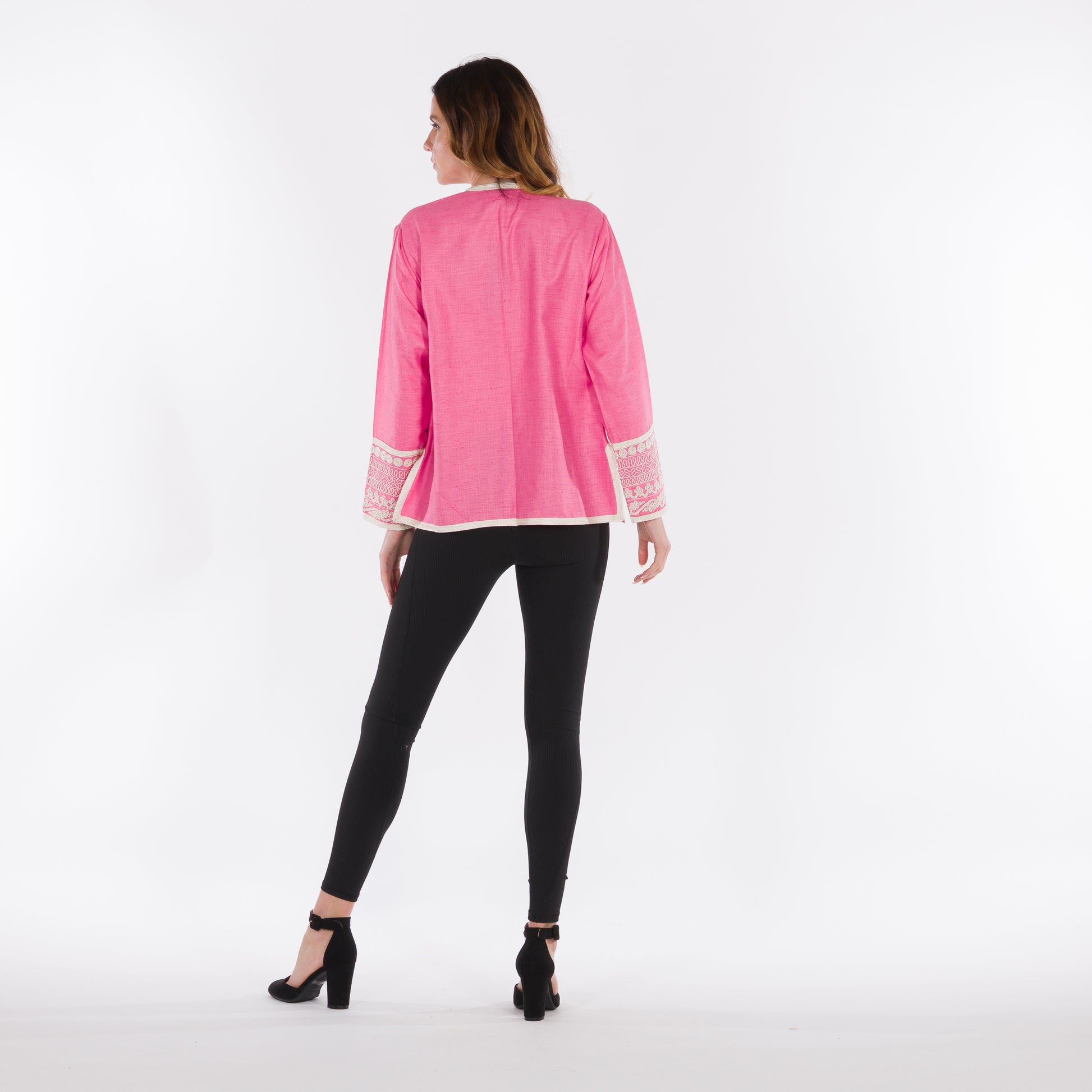 Pink jacket showcasing traditional Moroccan sfifa embroidery.