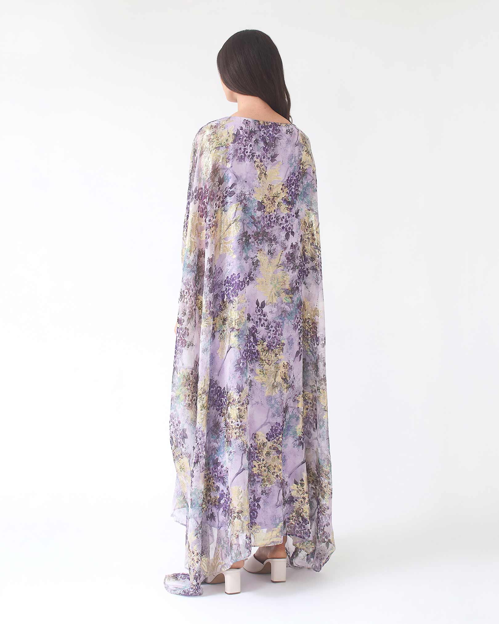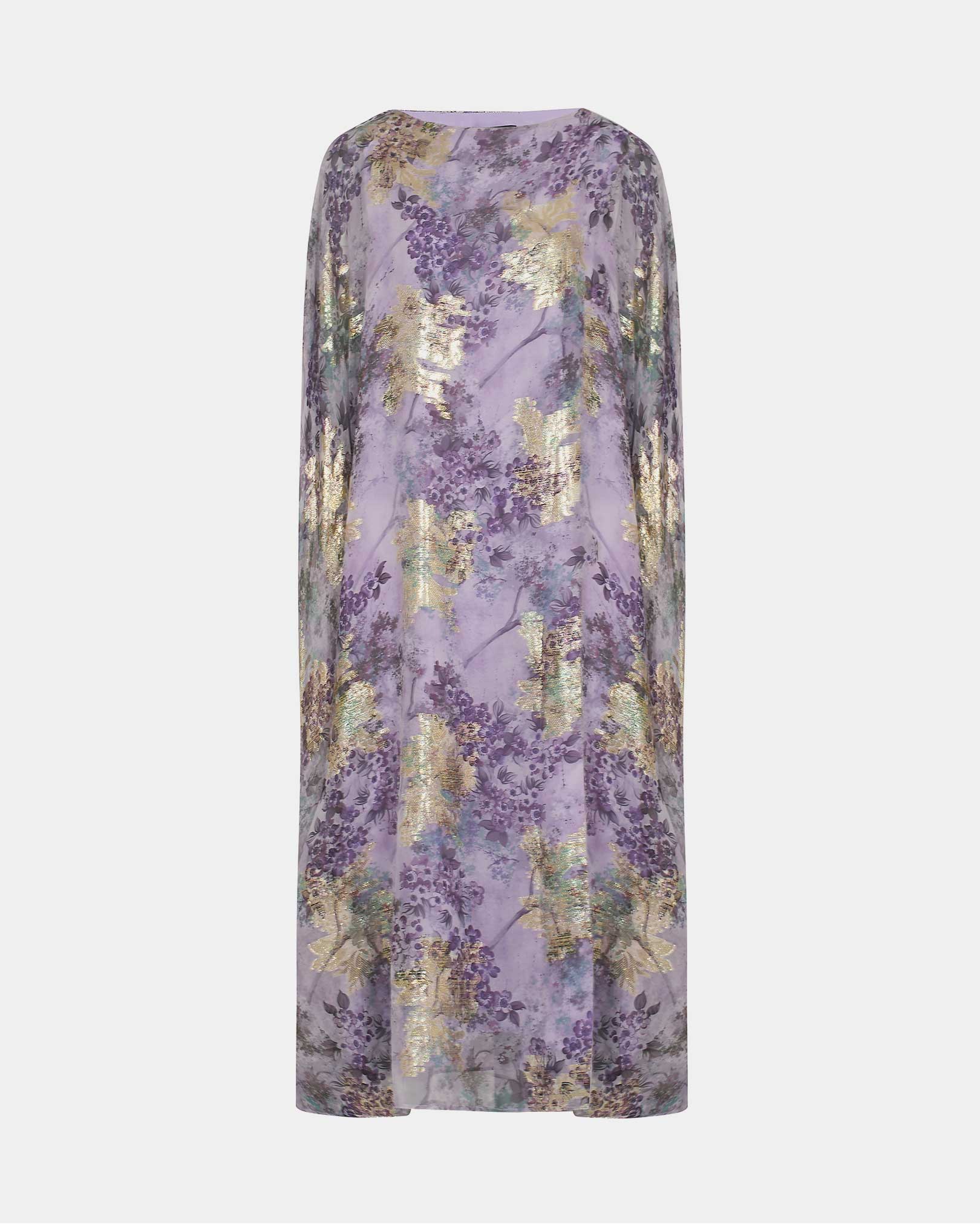 Batwing kaftan printed in soft lilac tones and finished with gold foil floral detailing. Designed in a free flowing silhouette.