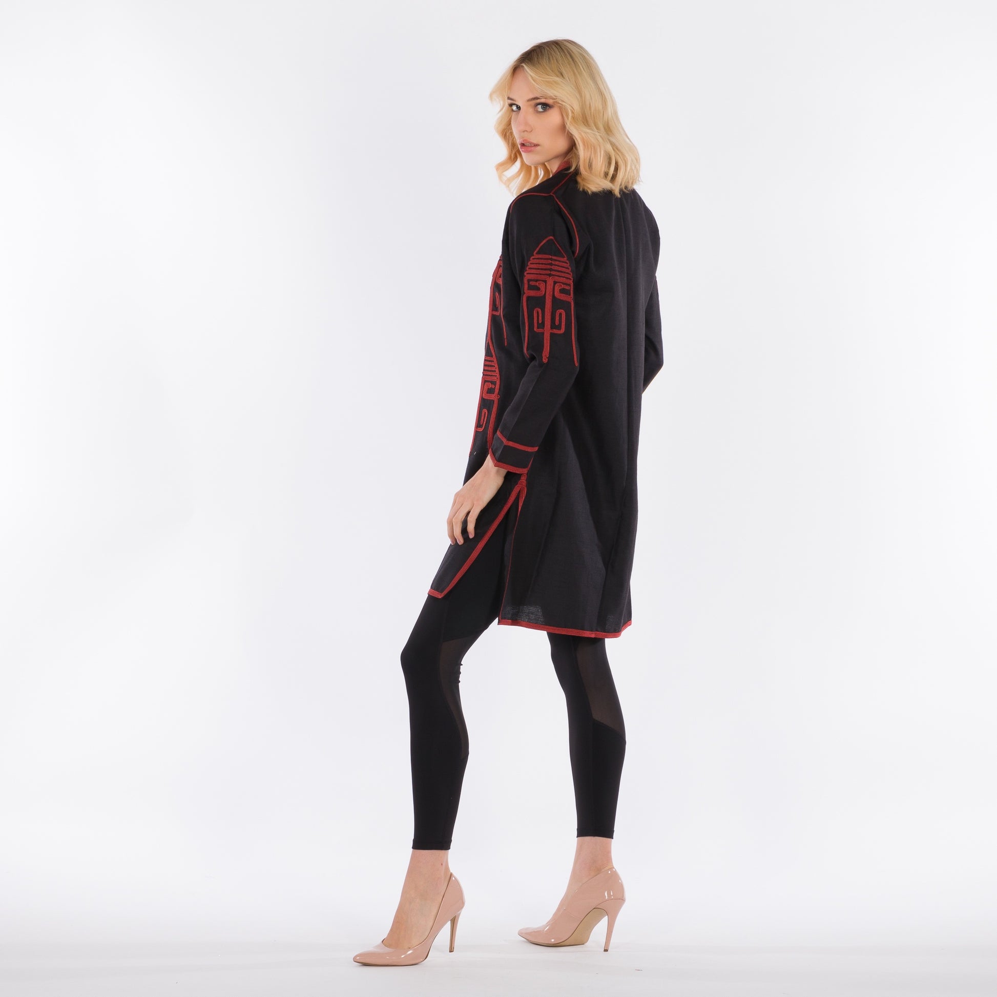 Black long-line jacket showcasing traditional Moroccan sfifa embroidery.