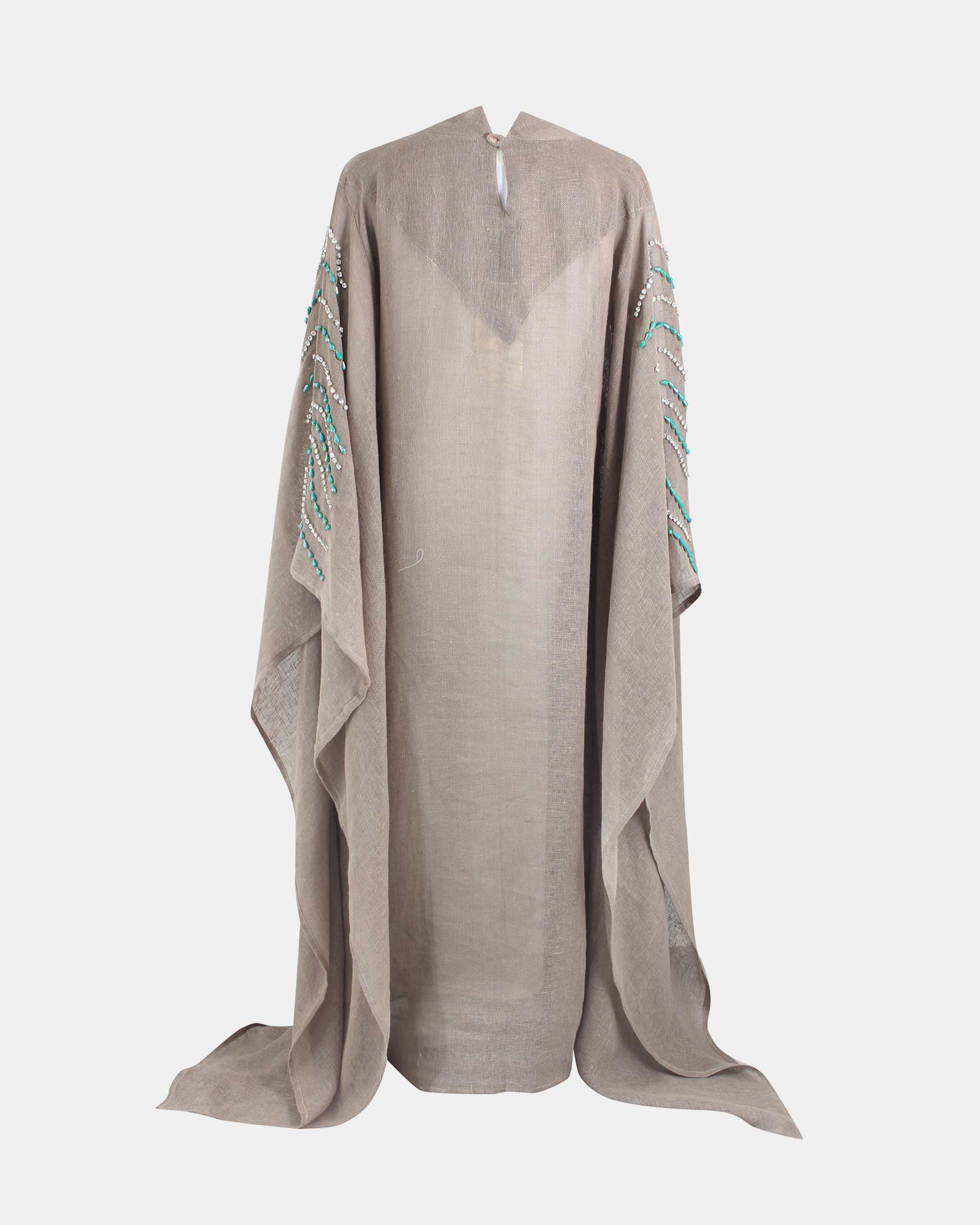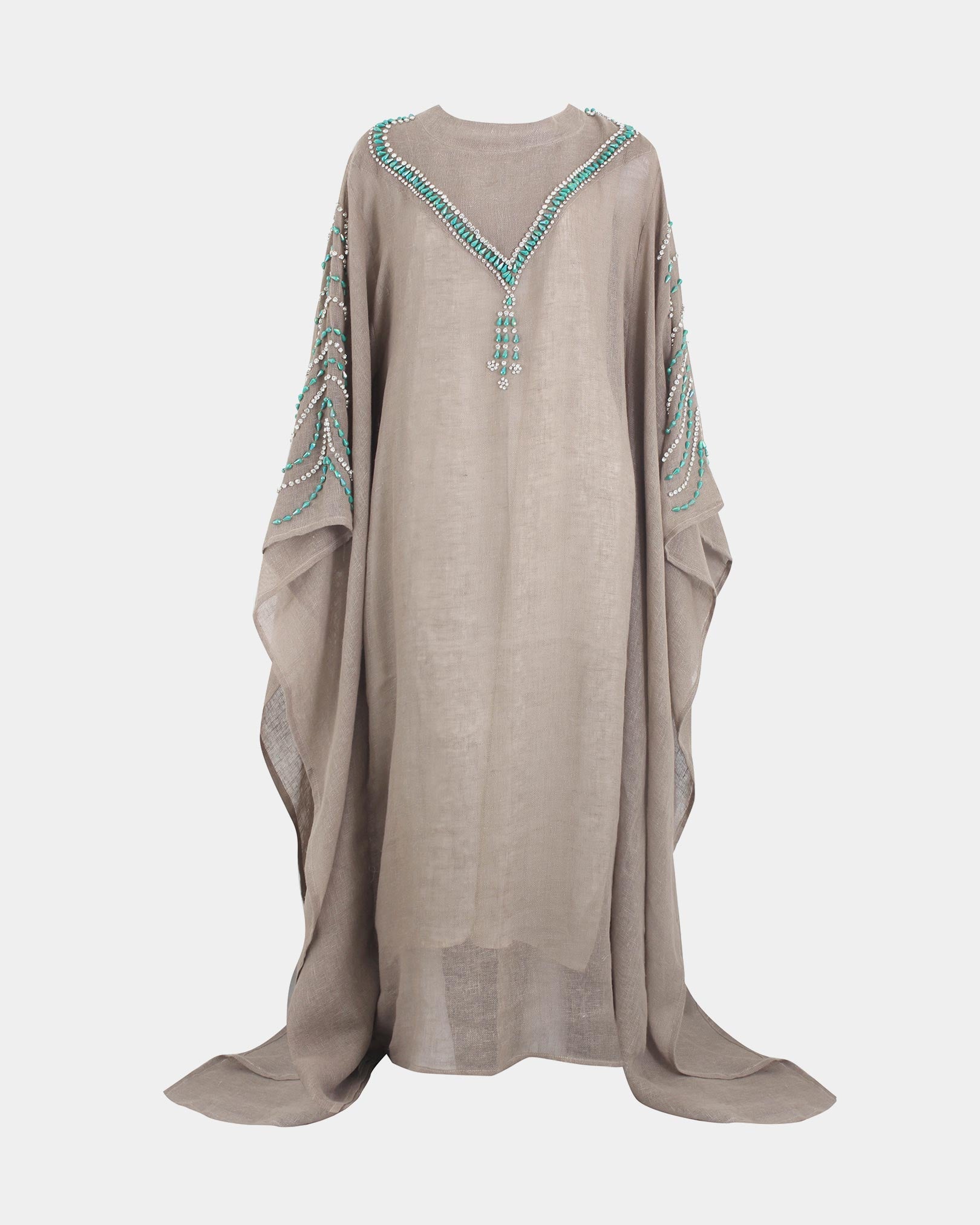 La Raffia Preziosa Necklace Green features our signature raffia linen in beige with a refined round neckline and wide sleeves. It is adorned with delicate handembroidered green signature Preziosa embroidery. Expertly crafted from soft, flowing fabric that drapes effortlessly around your silhouette.