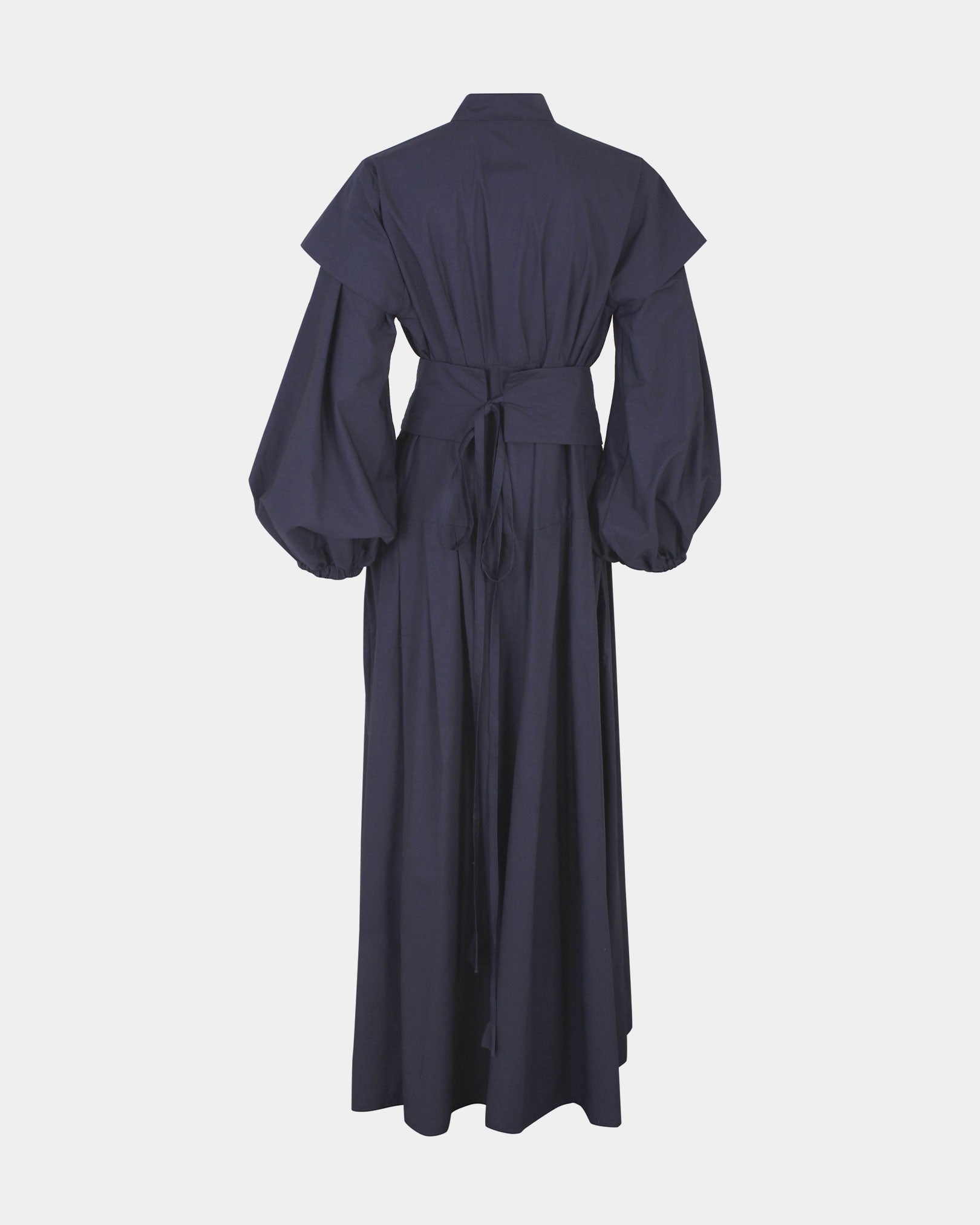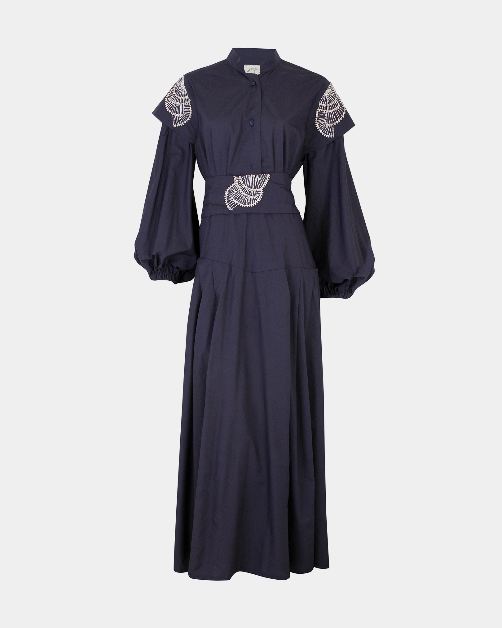 Crafted from Egyptian poplin cotton in an elegant navy blue tone, this maxi-length kaftan features a fitted belt waist that enhances silhouette definition. Its bubble-like long sleeves add volume and elegance, while the hand-embroidered fan motif, inspired by ancient Egyptian mosaics, showcases intricate craftsmanship.