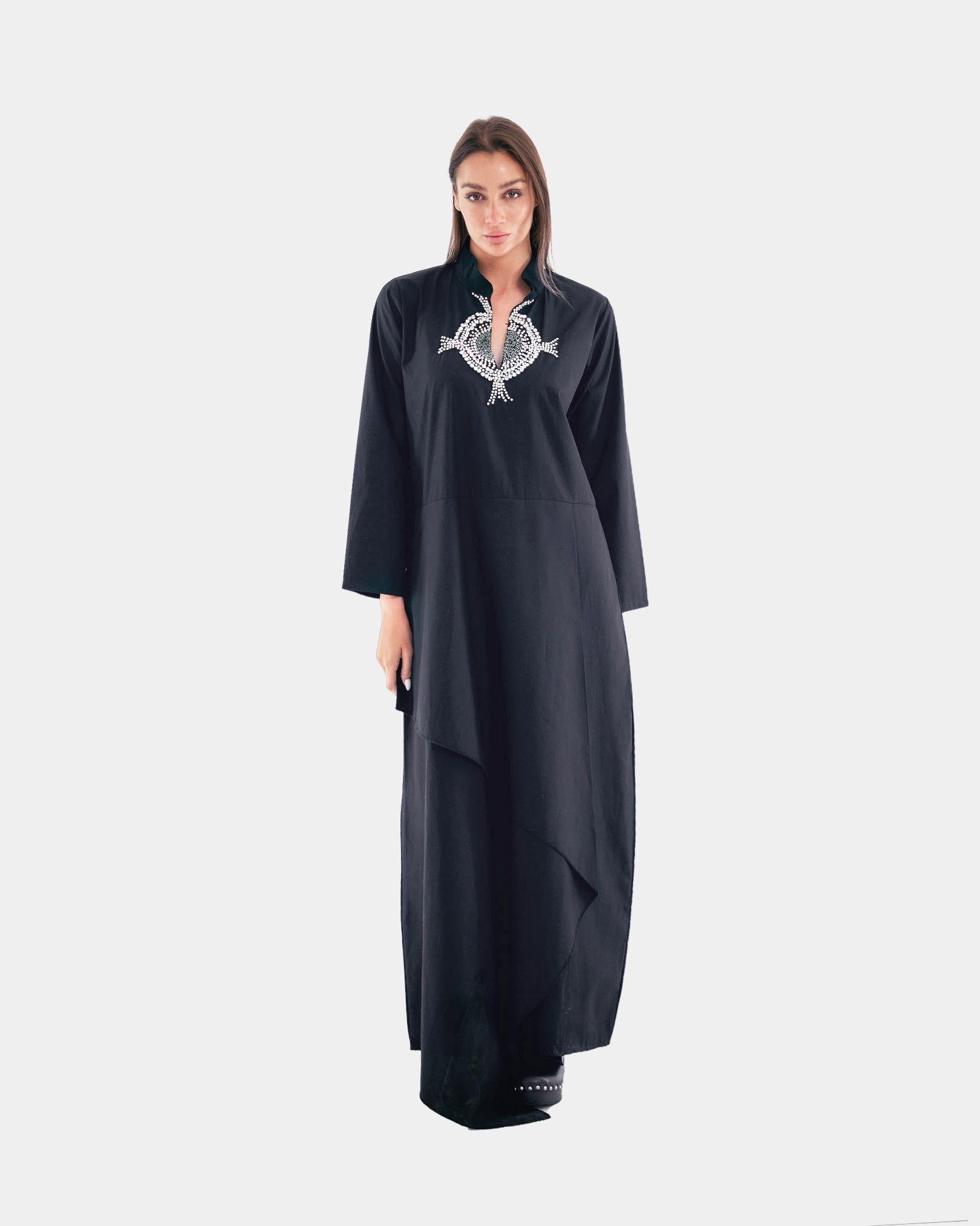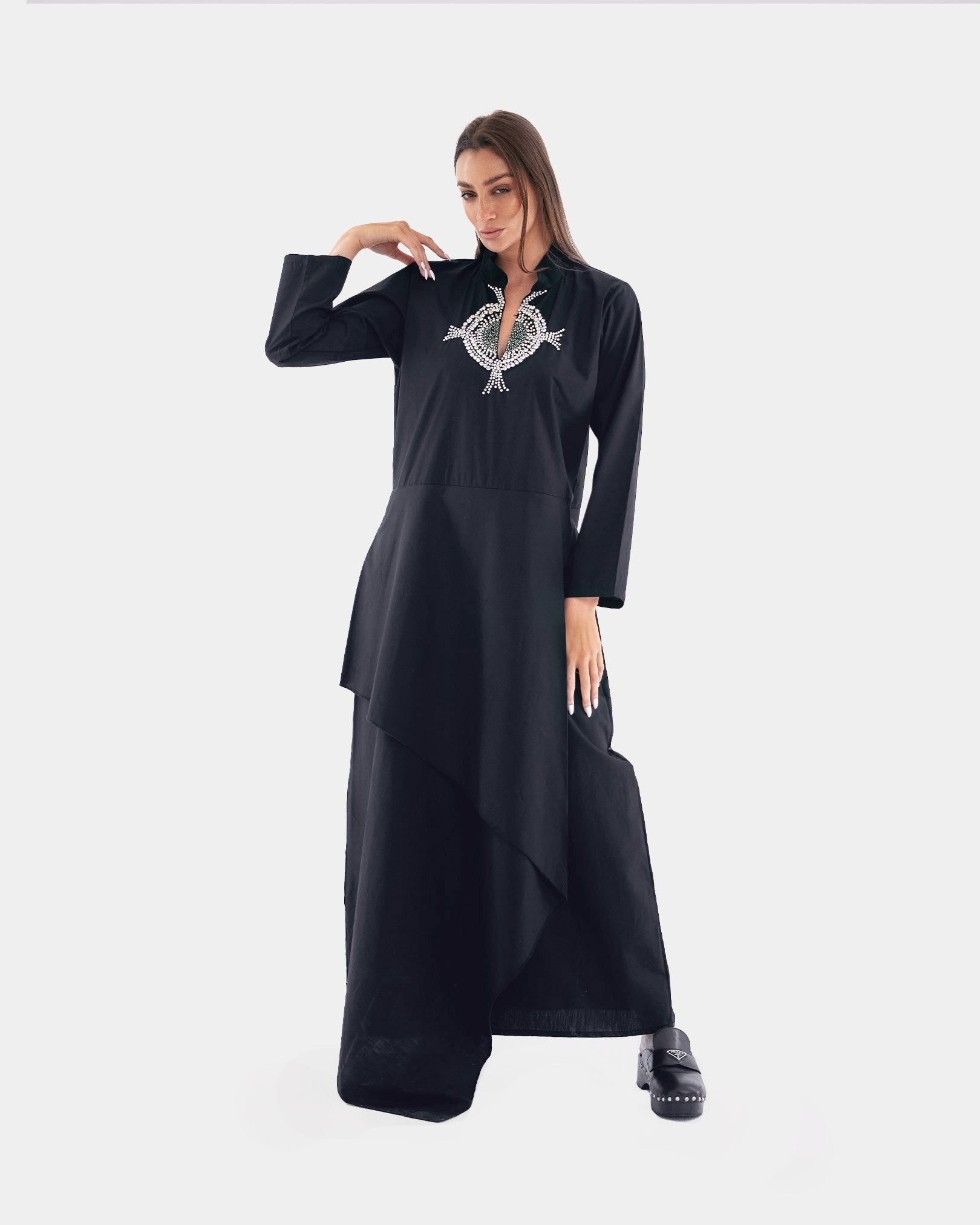 The Stella Verde Kaftan crafted from Egyptian luxurious poplin cotton, the black garment features asymmetrical skirt attachment, long sleeves, and a V-neckline. Expertly hand-embroidered with crystals, the kaftan offers classic elegance with a modern twist.